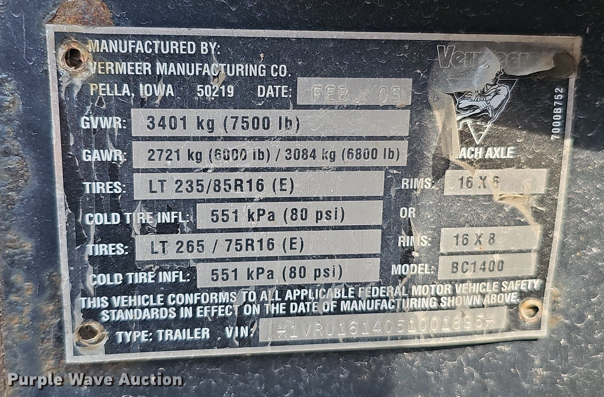 Purple Wave is selling a used Wood Chipper or Stump Grinder in Nebraska. This item is a 2005 Vermeer BC1400 XL wood chipper with the following: Hours: 3,920 on meter, VIN: 1VRU1614051001895