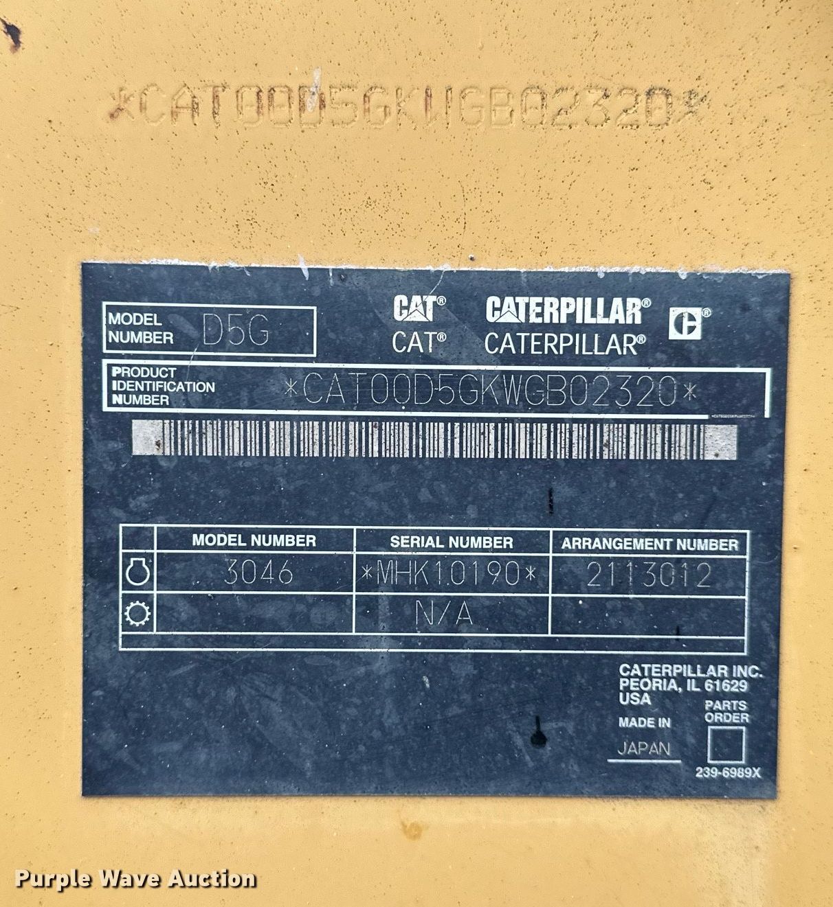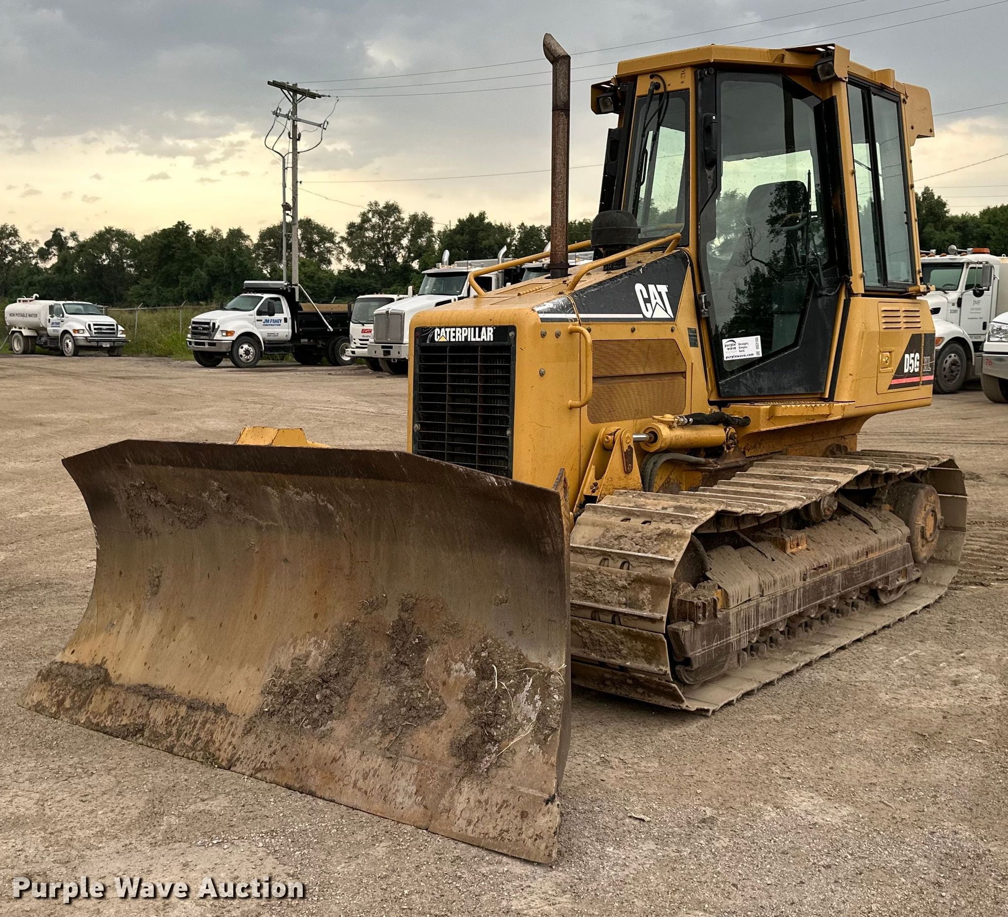 2005 Caterpillar D5G XL dozer. Hours: 5,436 on meter, Serial: CAT00D5GKWGB02320. Engine Caterpillar 3046, Cylinders: 6, Fuel type: Diesel. Transmission Hydrostatic. Operators station Enclosed cab, AC, Heat, Steering: Joystick. Features Dozer blade Type: 6-way, Straight, Width: 105" W. Tracks Width: 20", Grouser pads: Single, Bottom rollers: 7, Track guards. 7014 Holliday Drive. Kansas City, KS 66106