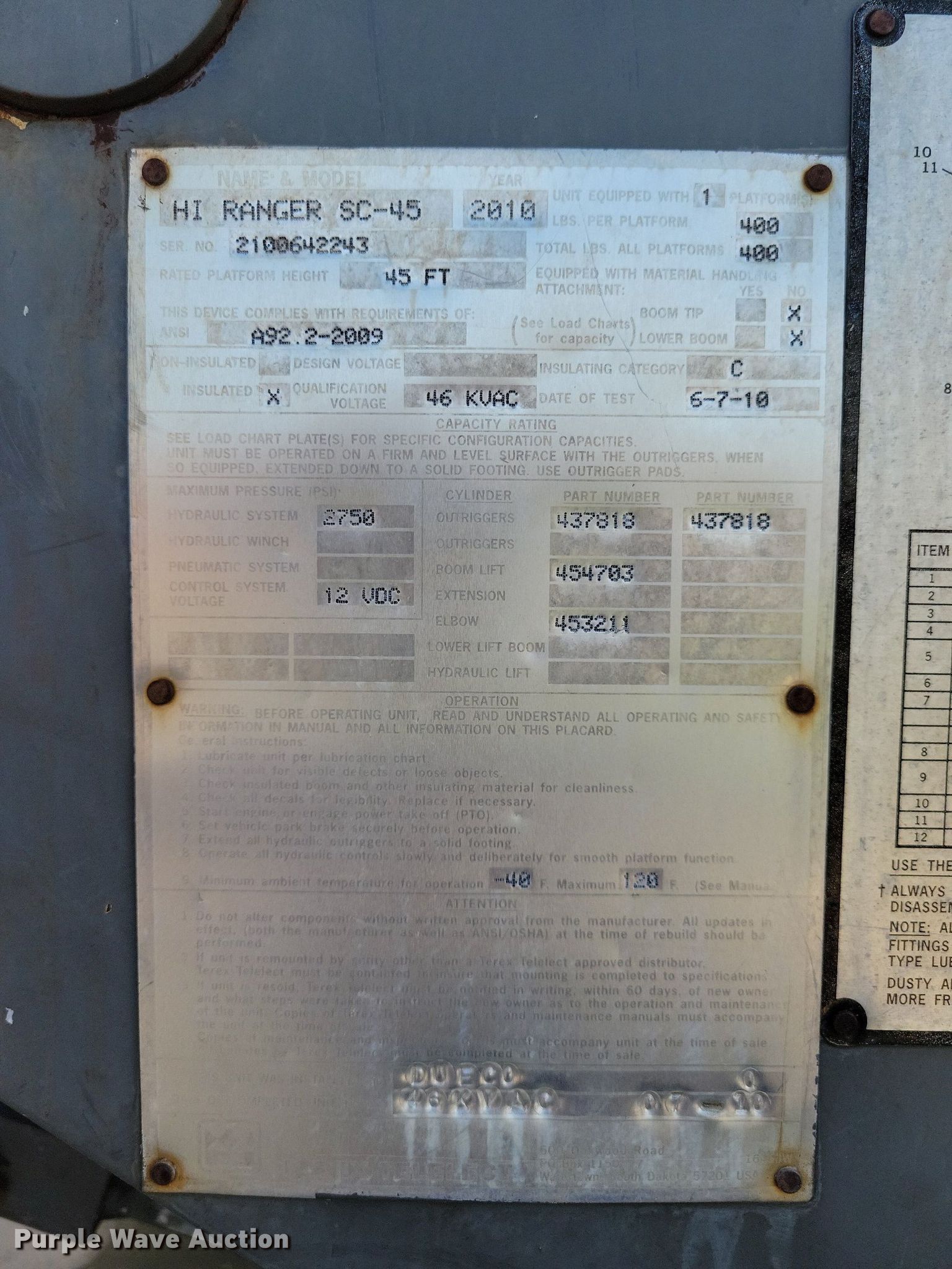 2010 Freightliner Business Class M2 106 bucket truck. Miles: 51,325 on odometer, VIN: 1FVACXDT1ADAU2137. Engine Cummins ISB 280, Serial: 73045446, Displacement: 6.7L, Cylinders: 6, Fuel type: Diesel, HP: 280. Transmission Allison, Automatic. Chassis Axles: Single, Suspension: Spring, Brakes: Air, PTO, Wet kit, GVWR: 33,000 lbs. Interior AC, Heat, Auxiliary controls. Features Bed Knapheide 6141HC, Serial: 20100513-0172844, 14' L x 96" W, Boom 2010 Terex Hi Ranger SC-45, Serial: 2100642243, Boom length: 40', Mast height: 7', Maximum lift capacity: 400 lbs, Maximum lift height: 47', Boom type: Articulating, Man basket, Boom controls Ground, Platform/ basket.. Tires Front: 295/75R22.5, Rear: 275/80R22.5. Notes Boom rebuilt in 2020, Dash warning indicator: ABS. Tennessee title. Seller is a Tennessee licensed motor vehicle dealer. The buyer may be required to pay sales tax and/or registration fees to the dealer prior to taking possession. Title will be assigned and distributed by the dealer. Please contact the seller for distribution questions. Truck City. 145 Northeast Broadway Avenue. Des Moines, IA 50313