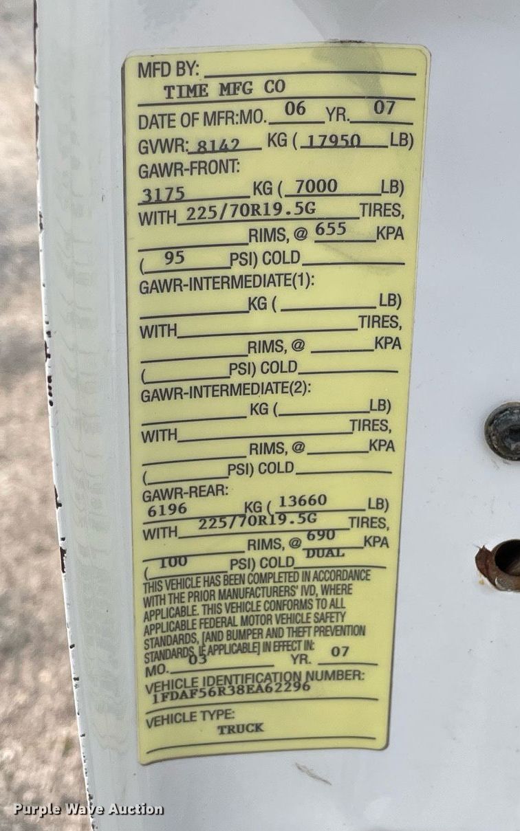 2008 Ford F550 Super Duty XL bucket truck. Miles: 201,672 on odometer, Hours: 1,773 on meter, VIN: 1FDAF56R38EA62296. Engine Cylinders: 8, Fuel type: Diesel. Transmission Automatic. Chassis Axles: Single, Suspension: Spring, Brakes: Hydraulic, PTO, GVWR: 17,950 lbs, Wheelbase: 165". Interior AC, Heat, Auxiliary controls, Brake controller. Features Bed Versalift, 11' x 94" W, Boom Versalift SST-37-EIH, Serial: DRO70035, Maximum lift capacity: 300 lbs, Maximum lift height: 37', Boom type: Articulating, Insulated, Telescopic, Man basket, Boom controls Ground, Platform/ basket.. Tires Size: 225/70R19.5. Notes Additional man basket , Manual, Dash warning indicator: Airbag. View repairs. Illinois title. Title distribution may be delayed up to 14 days from verification of funds. 5907 Schultz Road. Harvard, IL 60033