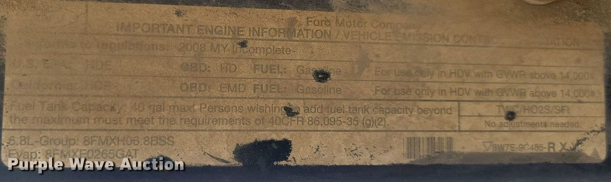2008 Ford F550 Super Duty XL truck cab and chassis. Miles: 91,263, VIN: 1FDAF56Y28EA49448. Engine Displacement: 6.8L V10 SOHC, Cylinders: 10, Fuel type: Gas. Transmission Automatic. Chassis Axles: Single, Suspension: Spring, Brakes: Hydraulic, Truck chassis: 14'. Interior AC, Heat. Tires Size: 225/70R19.5. Notes Dash warning indicator: Check engine. South Dakota title. Title distribution may be delayed up to 14 days from verification of funds. Soukup Construction Inc.. 701 N Ebenezer Ave. Sioux Falls, SD 57107