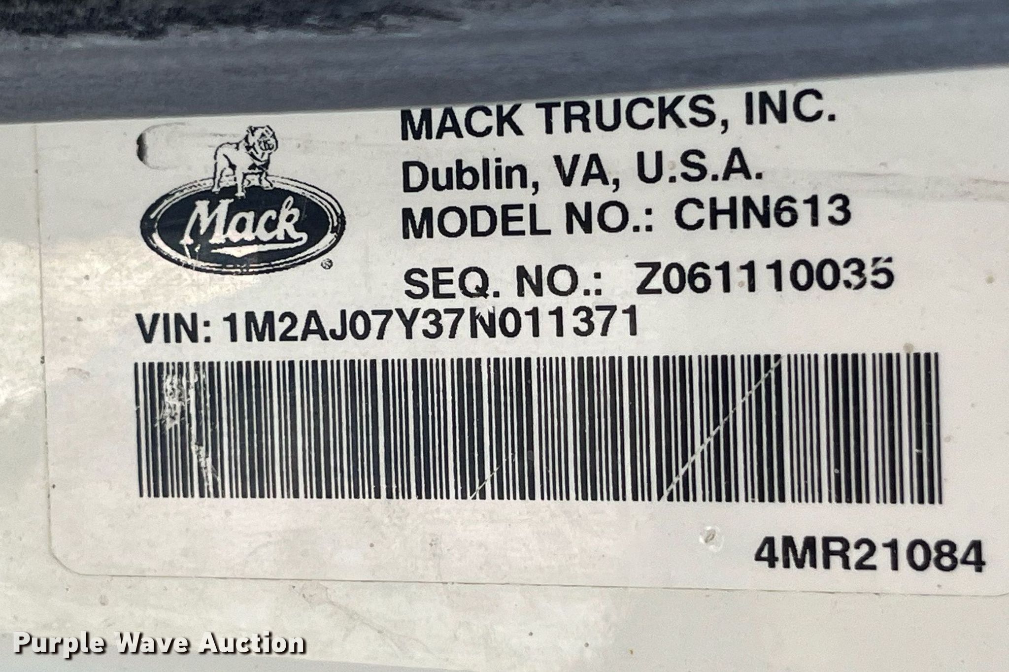 Purple Wave is selling a used Construction Dump Truck in Missouri. This item is a 2007 Mack CHN613 dump truck with the following: Miles: 516,304 on odometer, Hours: 22,998 on meter, VIN: 1M2AJ07Y37N011371