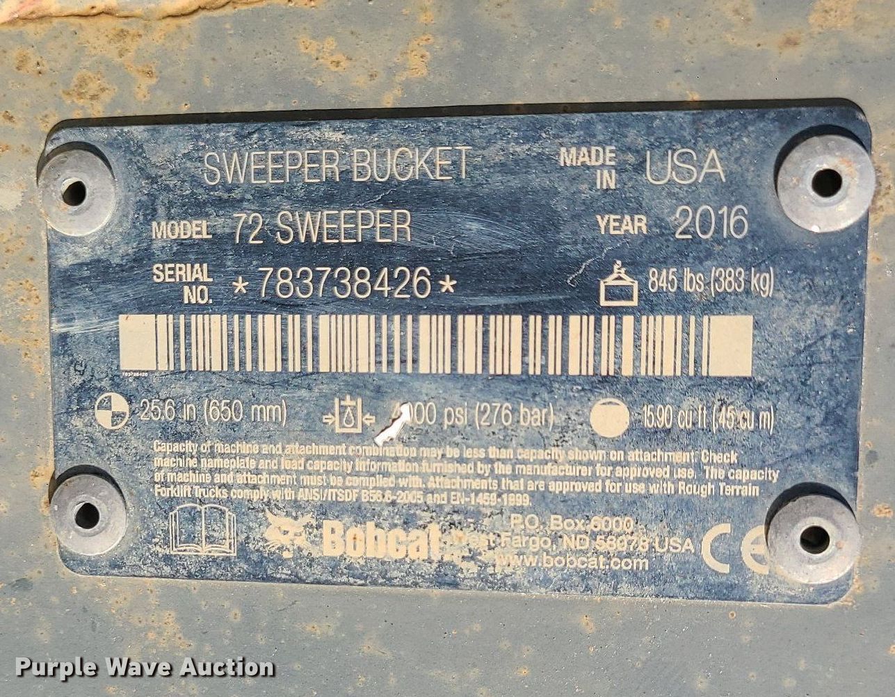 Purple Wave is selling a used Skid Steer Attach. in Missouri. This item is a 2016 Bobcat 72 Sweeper 72" W sweeper with the following: Serial: 783738426