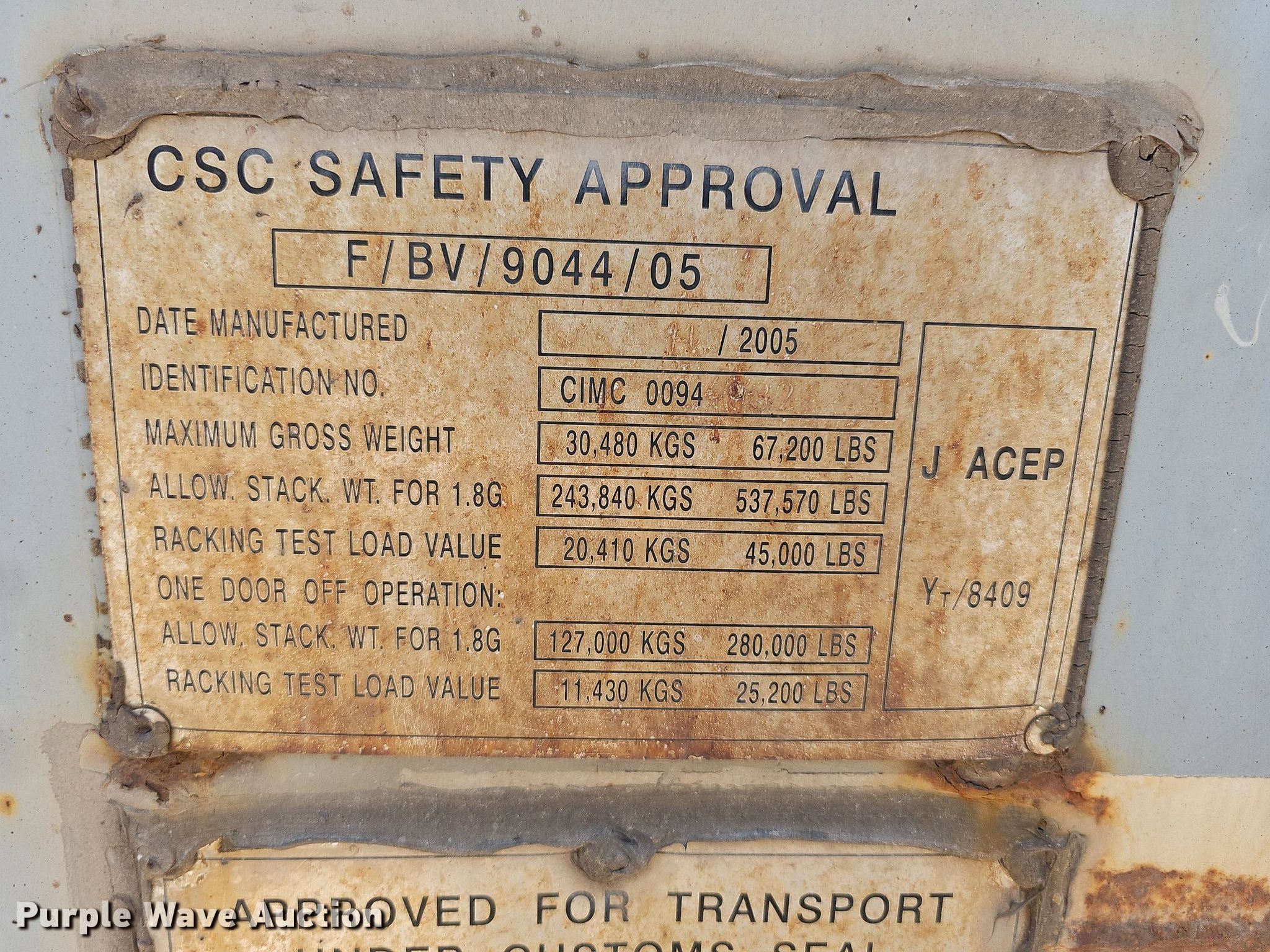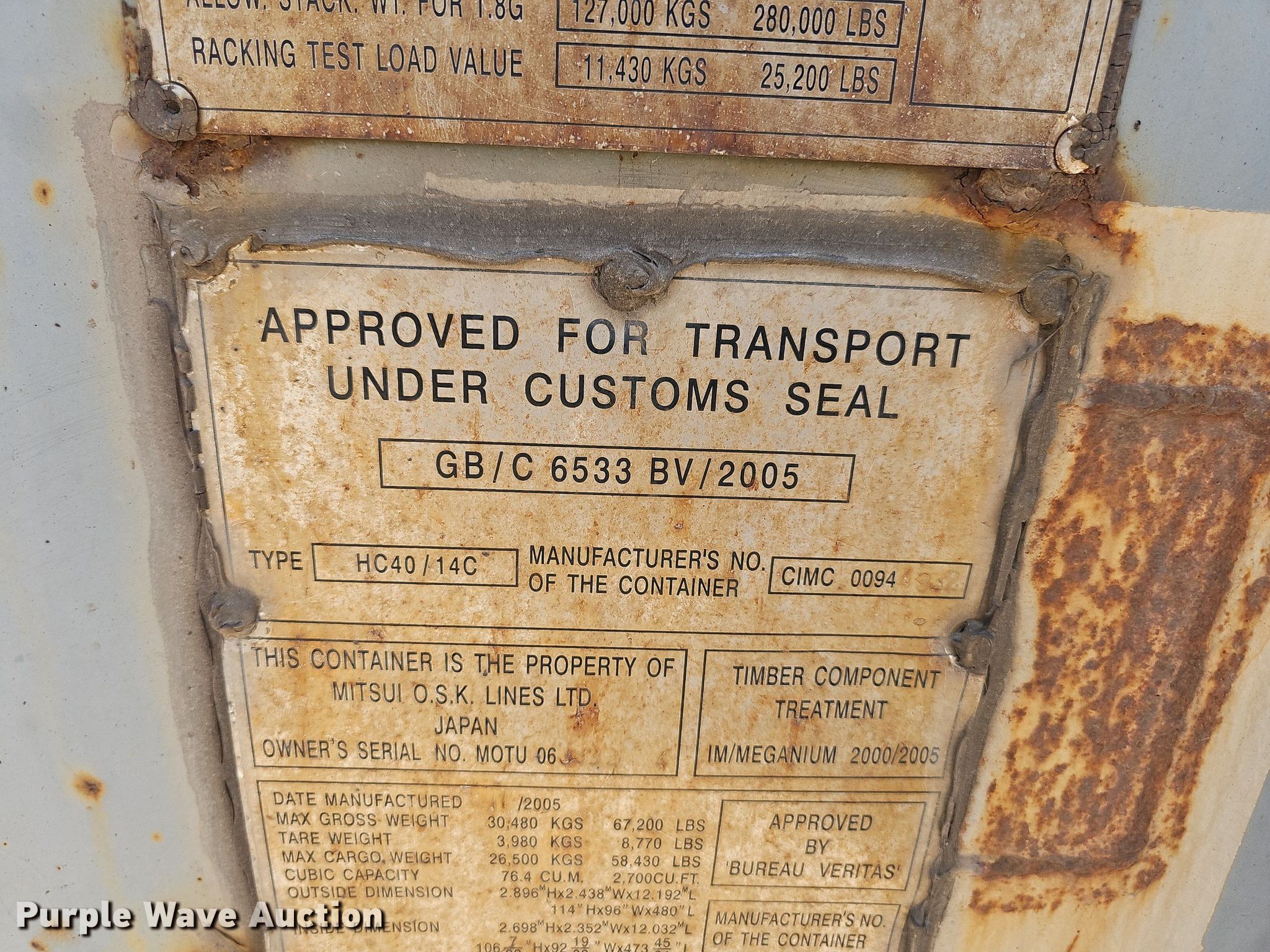 Purple Wave is selling a used Storage or Shipping Container in Missouri. This item is a 2005 Meganium High Cube shipping container with the following: Serial: CIMC 0094, 40' L x 96" W x 9' 6" H