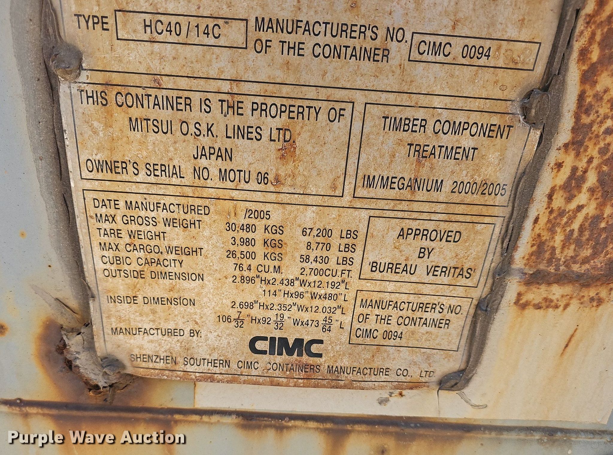2005 Meganium High Cube shipping container. Serial: CIMC 0094, 40' L x 96" W x 9' 6" H. Built Box Containers. 1201 South West Bypass. Springfield, MO 65807