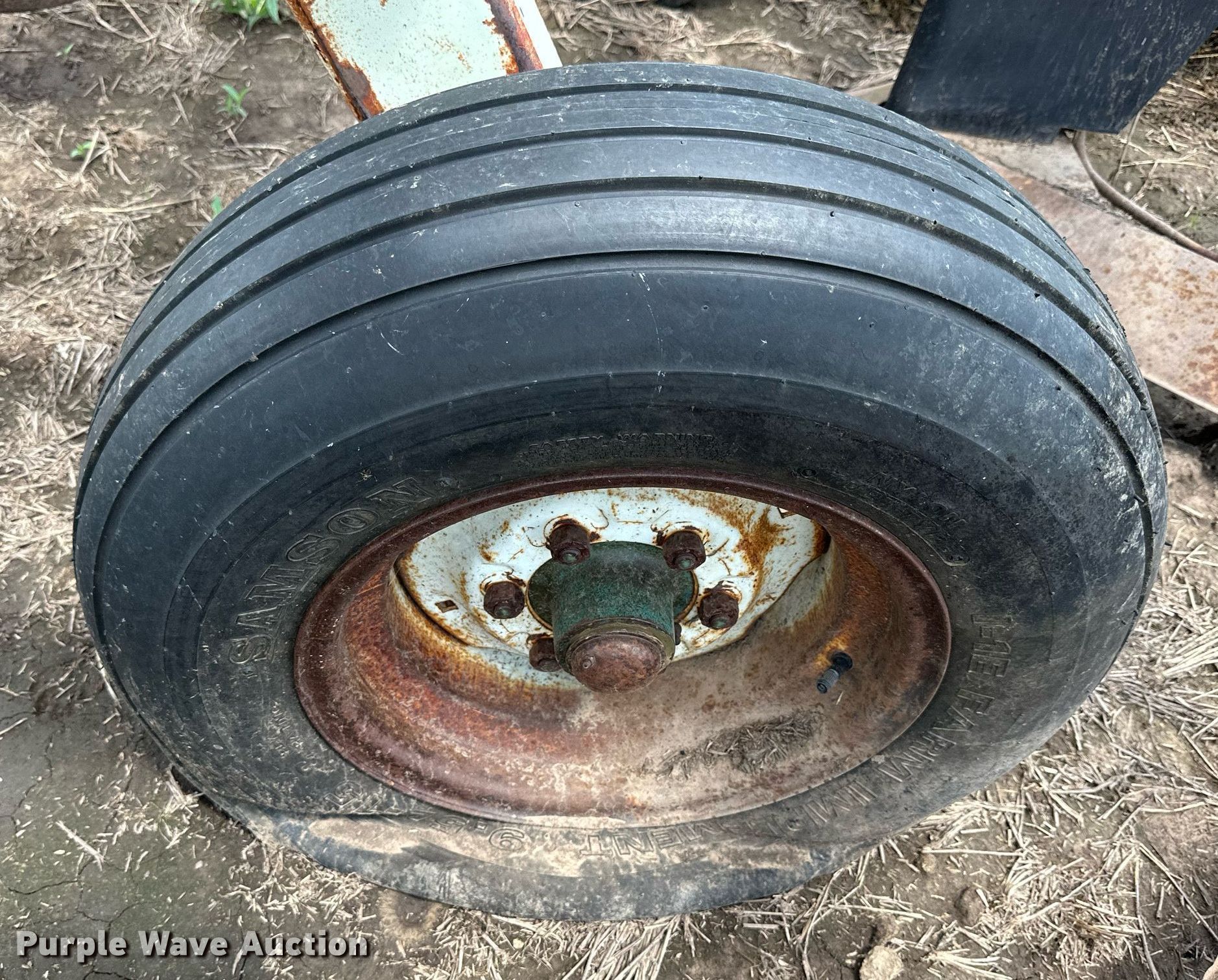 Flex King KM33 sweep plow. Overall width: 33'. Features Sweep width: 5', Blade diameter Front: 19", Spacing: 57", Operation Hydraulic lift, Hydraulic fold, Attachments Rolling pickers/ treader. Tires Tire size: 9.5L-15. Notes Flat tire. 136 8th Road. Wilson, KS 67490