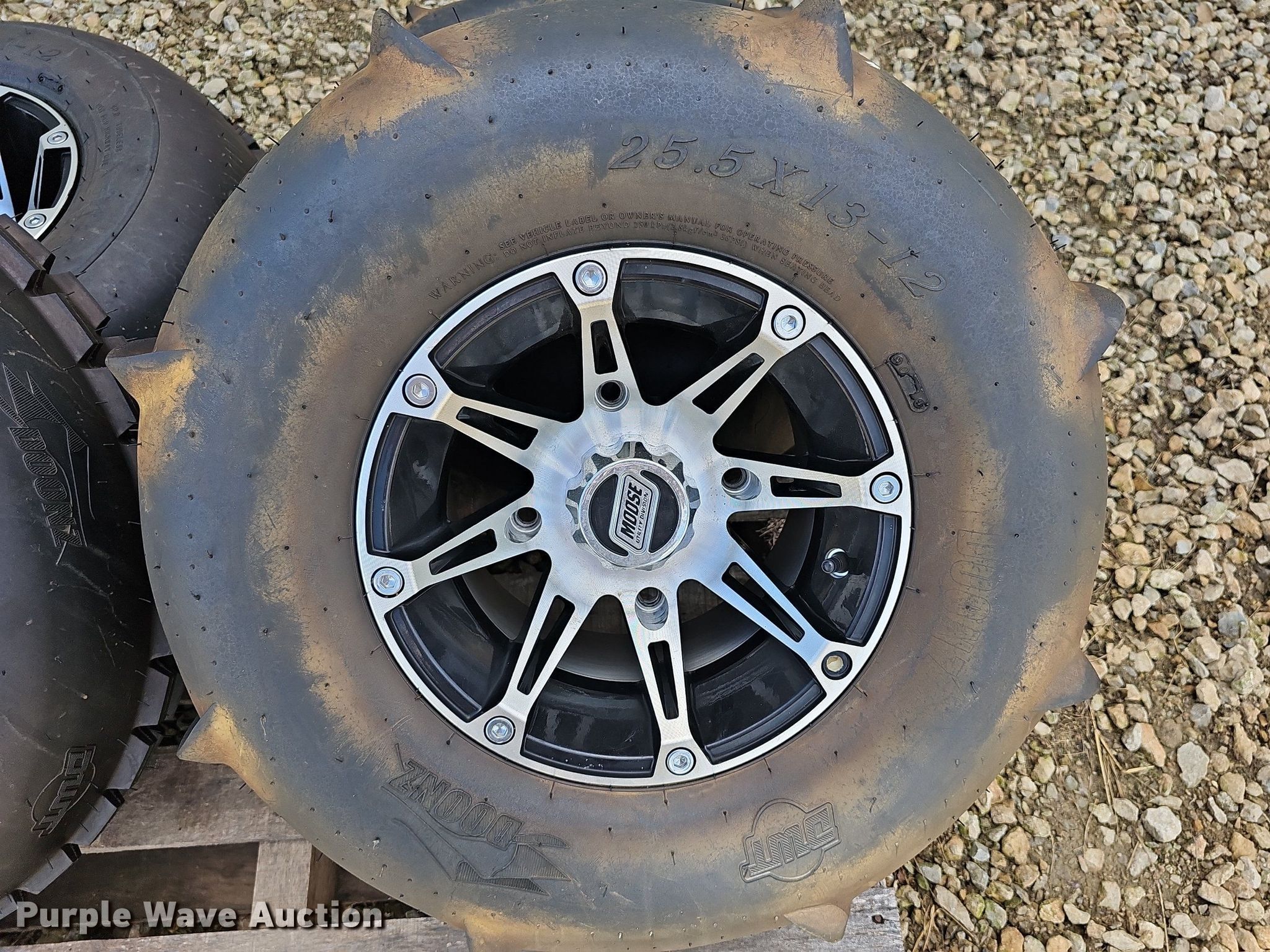 Tires and wheels. (2) Goodyear 18.4-34 dual tires and rims Six ply, Removed from International 806, (4) Doonz tires and wheels (2) 25.5x11-12, (2) 25.5x13-12, Moose aluminum wheels. 9340 Northwest 46th Street. Silver Lake, KS 66539