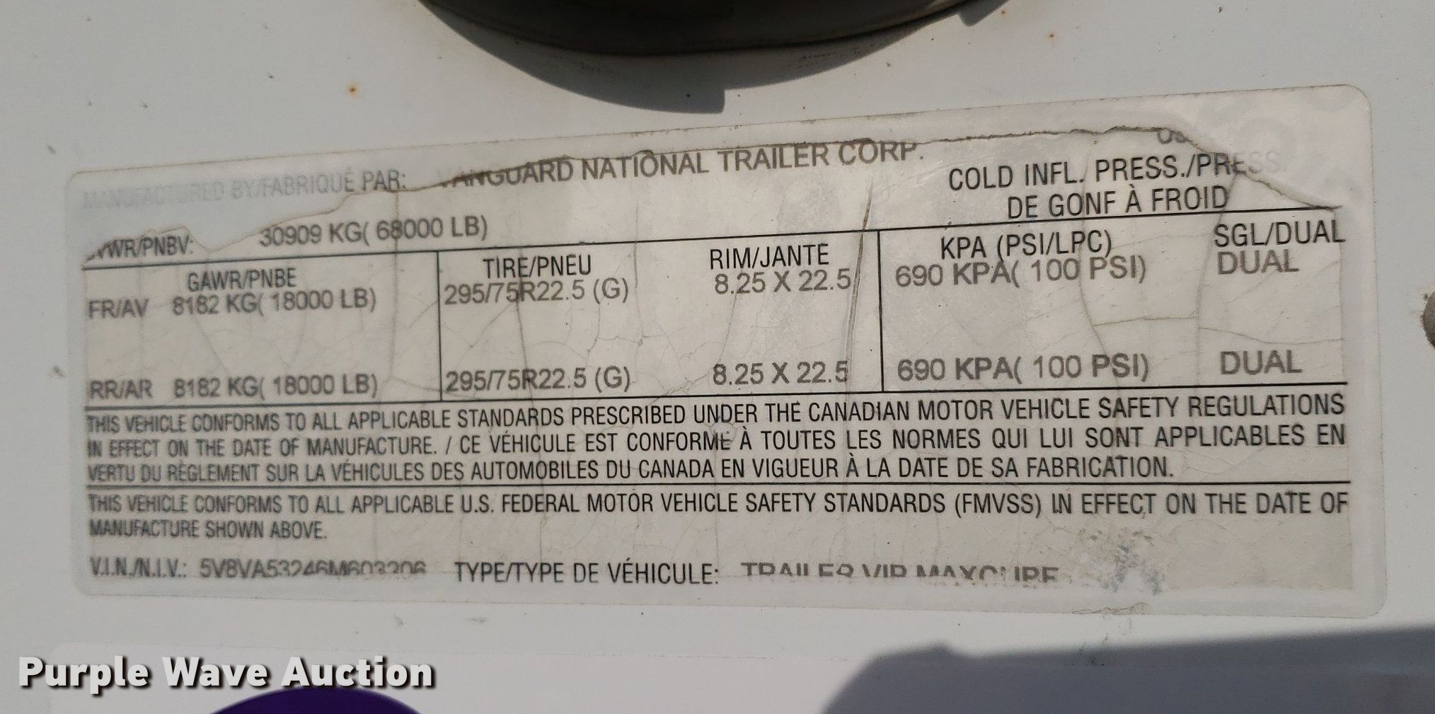 2006 Vanguard VIP dry van trailer. VIN: 5V8VA53246M603206. Dimensions Overall: 53' L x 102" W. Features Deck type: Wood. Chassis Landing gear: Dual, Suspension: Air, Brakes: Air, Axles: Tandem, GVWR: 68,000 lbs, GAWR: 18,000 lbs. Tires Steel wheels, Size: 295/75R22.5. Kansas title. Title distribution may be delayed up to 14 days from verification of funds. Canton, KS 67428