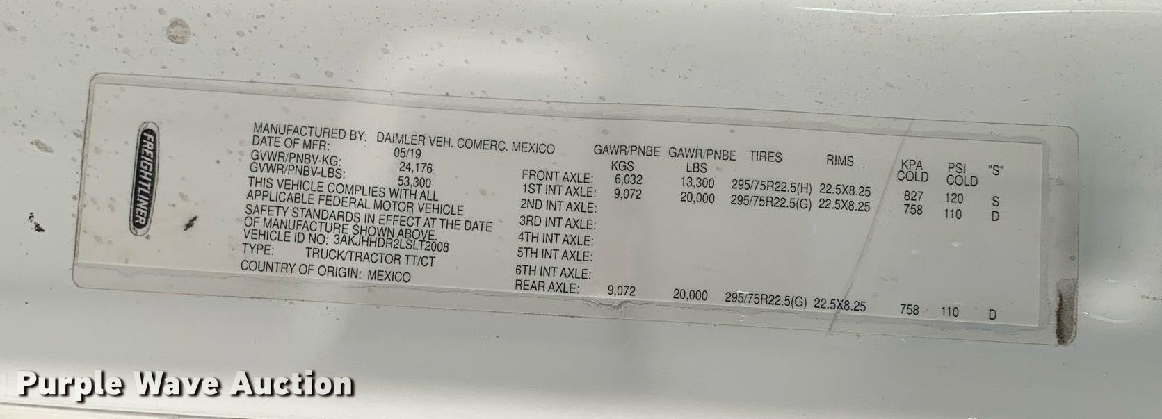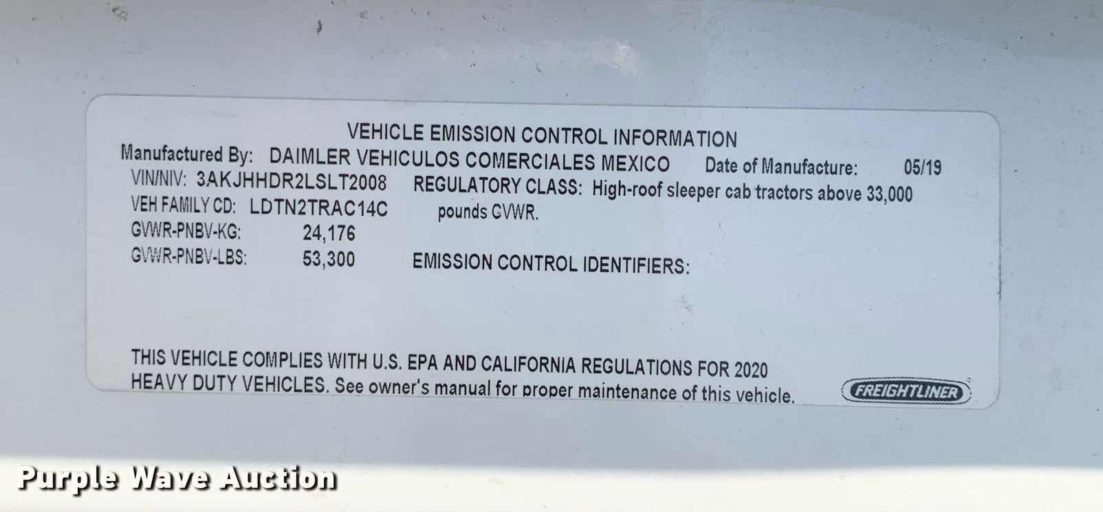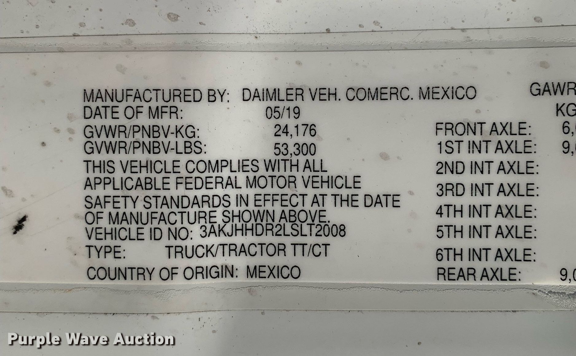 Purple Wave is selling a used Truck Tractor in Texas. This item is a 2020 Freightliner Cascadia semi truck with the following: Miles: 637,317 on odometer, Hours: 16,026 on meter, VIN: 3AKJHHDR2LSLT2008