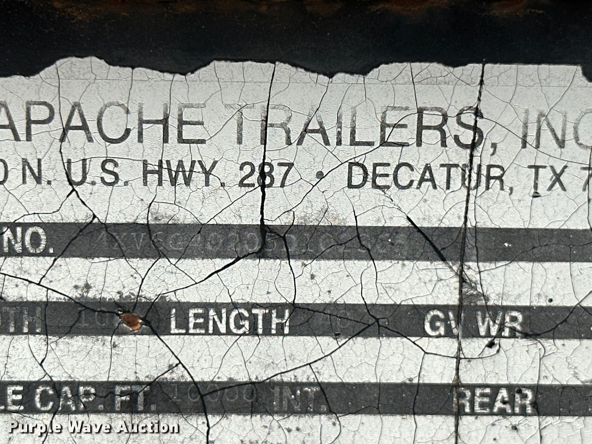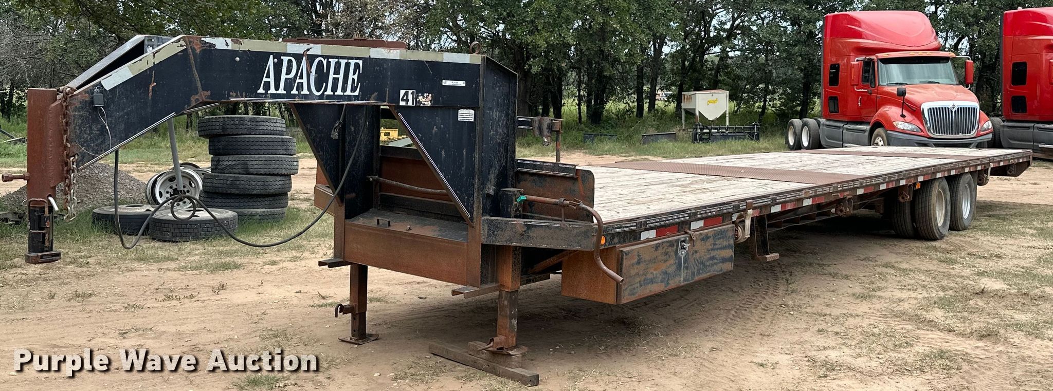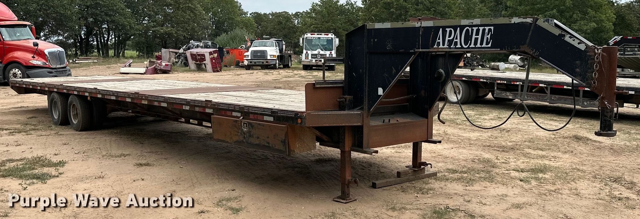 2005 Apache flatbed trailer. VIN: 4XV6G40205D102362. Dimensions Overall: 48' 6" L x 96" W, Deck: 40' L. Features Deck type: Steel, Wood. Chassis Hitch: Gooseneck, Landing gear: Dual, Suspension: Spring, Brakes: Electric, Axles: Tandem. Tires Size: ST235/85R16. Kansas title. Title distribution may be delayed up to 14 days from verification of funds. 528 Road 28. Peru, KS 67360