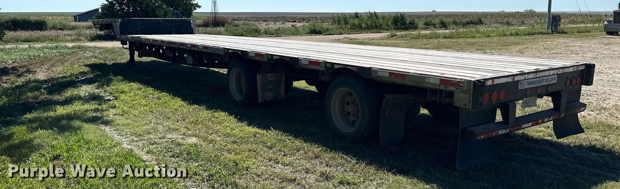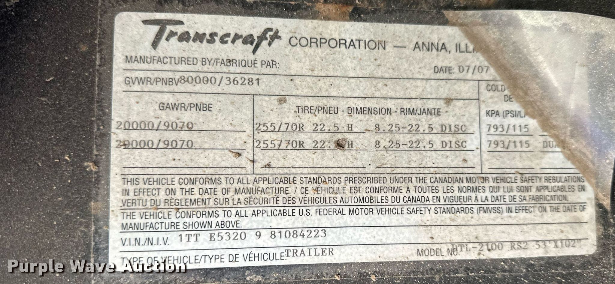 2008 Transcraft DTL-2100 drop deck equipment trailer. VIN: 1TTE5320981084223. Dimensions Overall: 52' L x 102" W, Deck: 52' L x 97" W, Top deck length: 11', Rear deck length: 42', Deck height: 42". Features Deck type: Aluminum, Wood. Chassis Landing gear: Dual, Suspension: Air, Brakes: Air, Axles: Tandem, GVWR: 80,000 lbs, GAWR: 20,000 lbs. Tires Aluminum wheels, Size: 255/70R22.5. Kansas title. Title distribution may be delayed up to 30 days from verification of funds. 9700 J Road. Norton, KS 67654