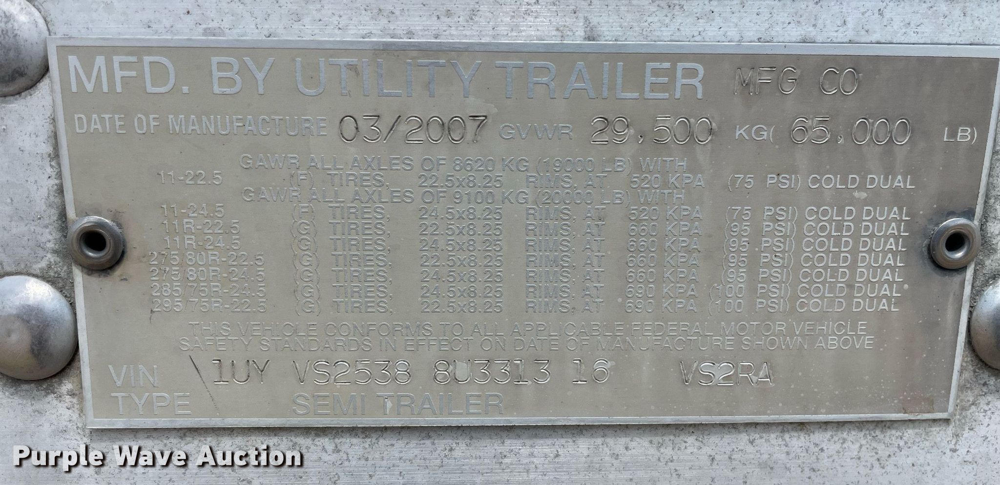 2008 Utility VS2RA refrigerated van trailer. VIN: 1UYVS25388U331316. Dimensions Overall: 55' L x 102" W, Body: 53' L x 102" W. Features Deck type: Aluminum, Refrigeration unit Carrier 2500A X2, Engine hours: 11,629 on meter, Switch on hours: 31,478 on meter, Engine Cylinders: 4, Fuel type: Diesel.. Chassis Landing gear: Dual, Suspension: Air, Brakes: Air, Axles: Tandem, GVWR: 65,000 lbs. Tires Steel wheels, Size: 295/75R22.5. Minnesota title. Doug Bradley Trucking. 680 E Water Well Rd. Salina, KS 67401