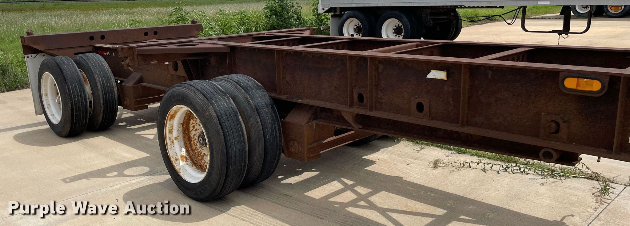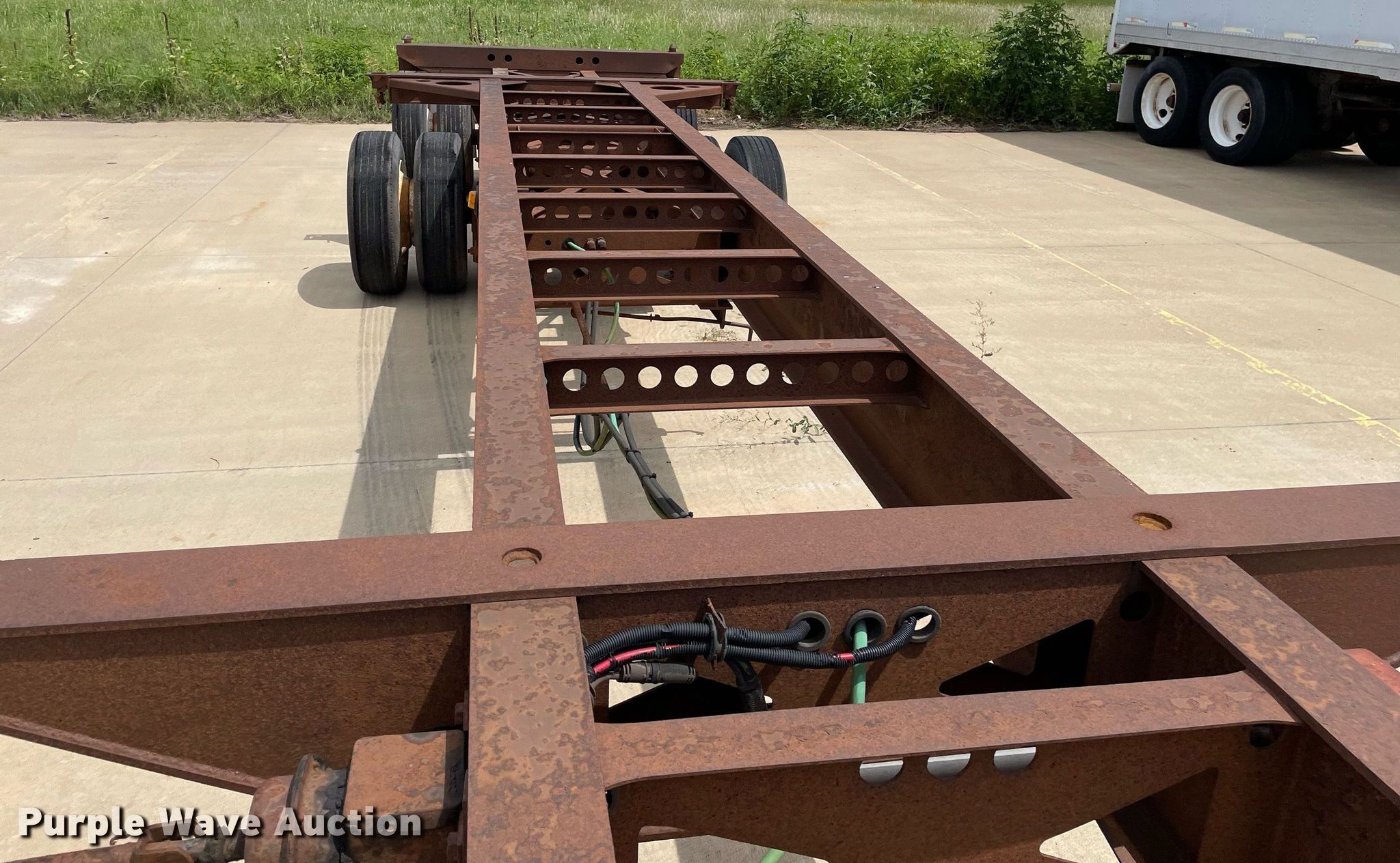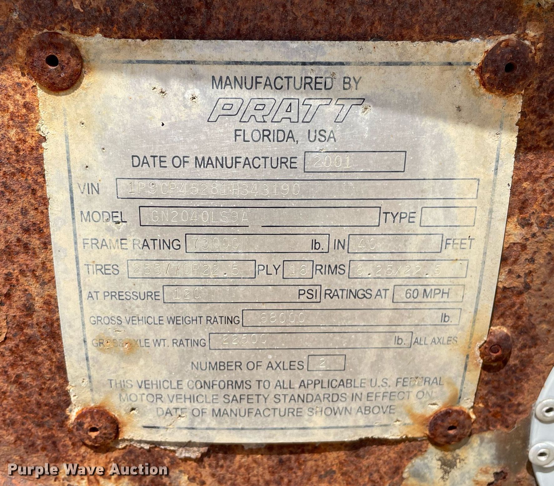 2001 Pratt GN2040LS9A container trailer. VIN: 1P9CP45281H343190. Dimensions Overall: 40' 6" L x 96" W. Chassis Landing gear: Dual, Suspension: Air, Brakes: Air, Axles: Tandem, GVWR: 68,000 lbs, GAWR: 22,500 lbs. Tires Steel wheels, Size: 255/70R22.5. Minnesota title. Doug Bradley Trucking. 680 E Water Well Rd. Salina, KS 67401