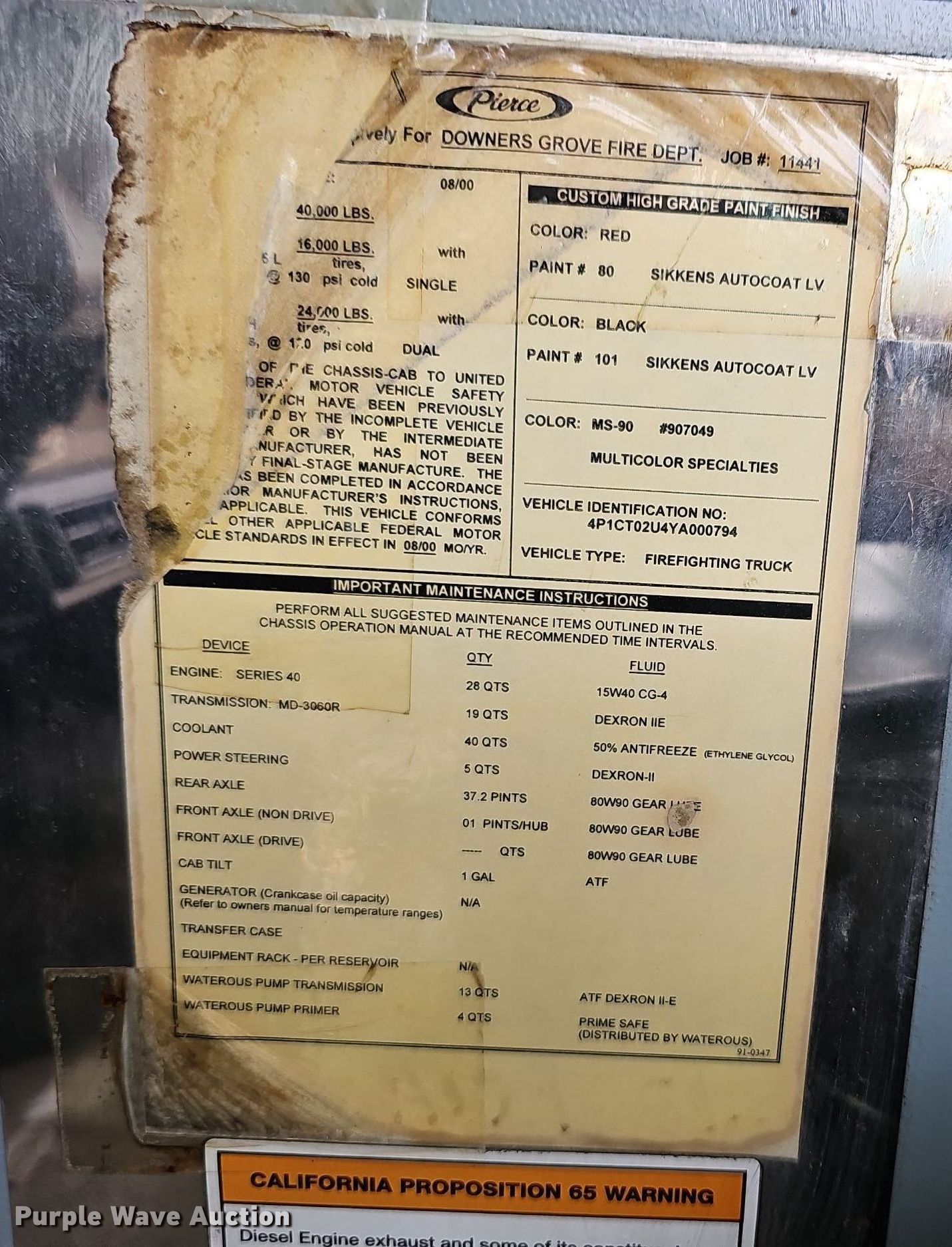 2000 Pierce pumper fire truck. Hours: 13,325 on meter, Miles or hours may vary, unit still in use, VIN: 4P1CT02U4YA000794. Engine Detroit Diesel Series 40, Displacement: 8.7L, Cylinders: 6, Fuel type: Diesel. Transmission Allison , Automatic. Chassis Axles: Single, Suspension: Spring, Brakes: Hydraulic, GVWR: 40,000 lbs, Wheelbase: 188". Interior Heat. Features Fire truck body Pump, PA/ siren controls. Tires Front: 315/80R22.5, Rear: 11R22.5. Notes Dead battery, Engine issues, blow-by , Pump leaks, Non-operational unit. Kansas title. 2245 Lacy Drive. Junction City, KS 66441