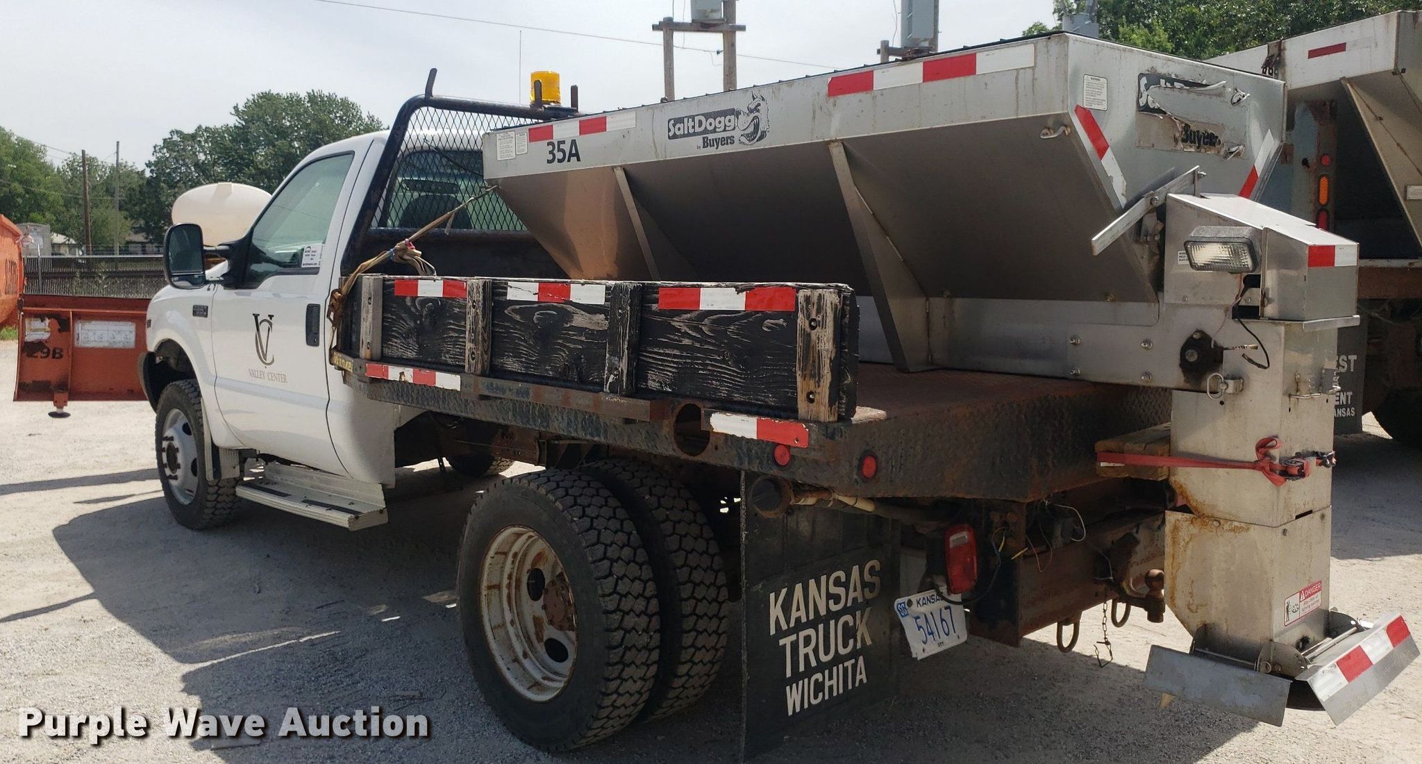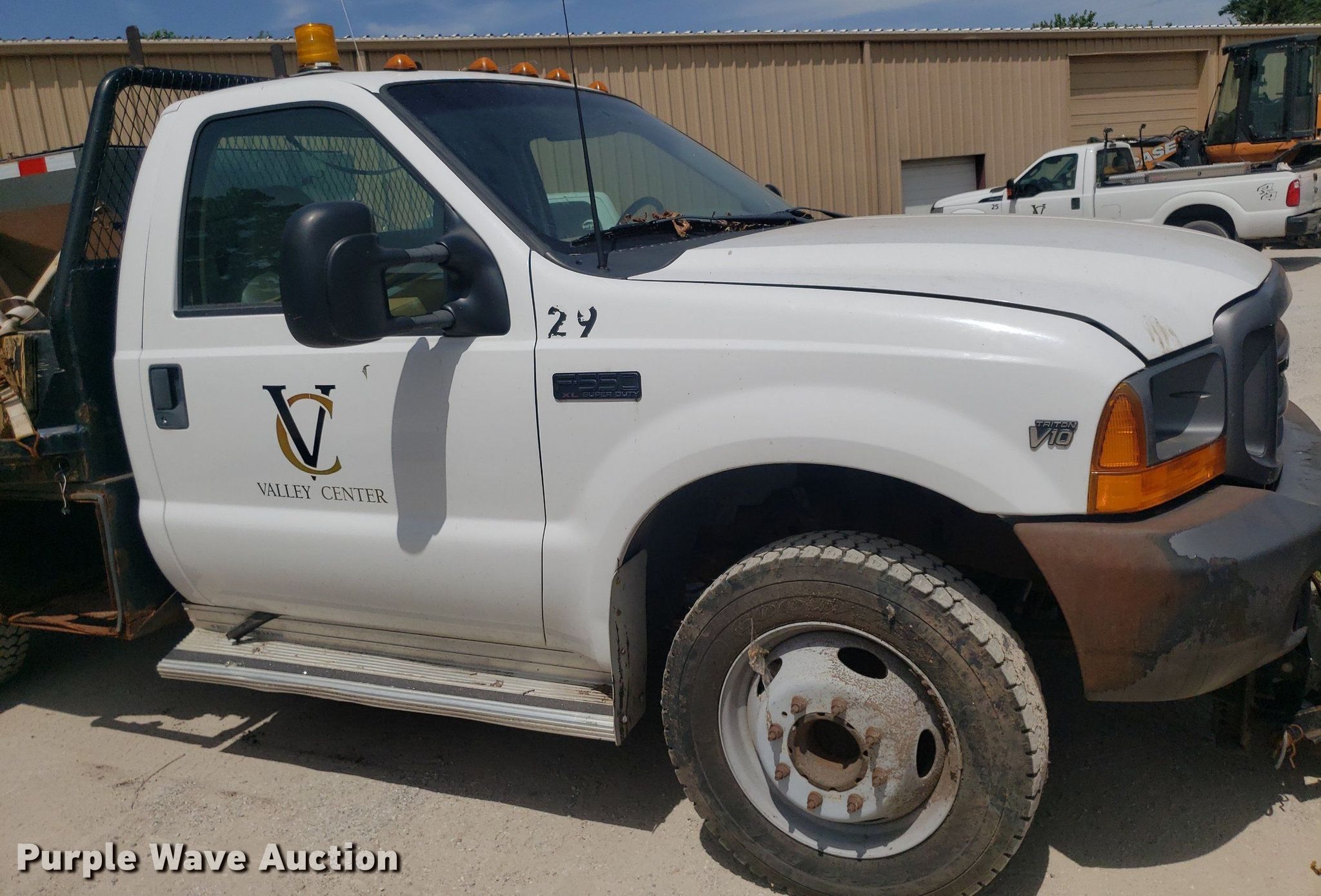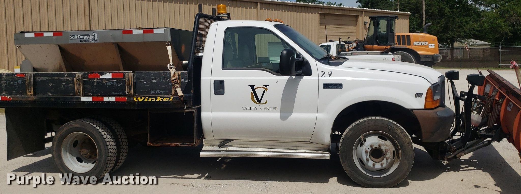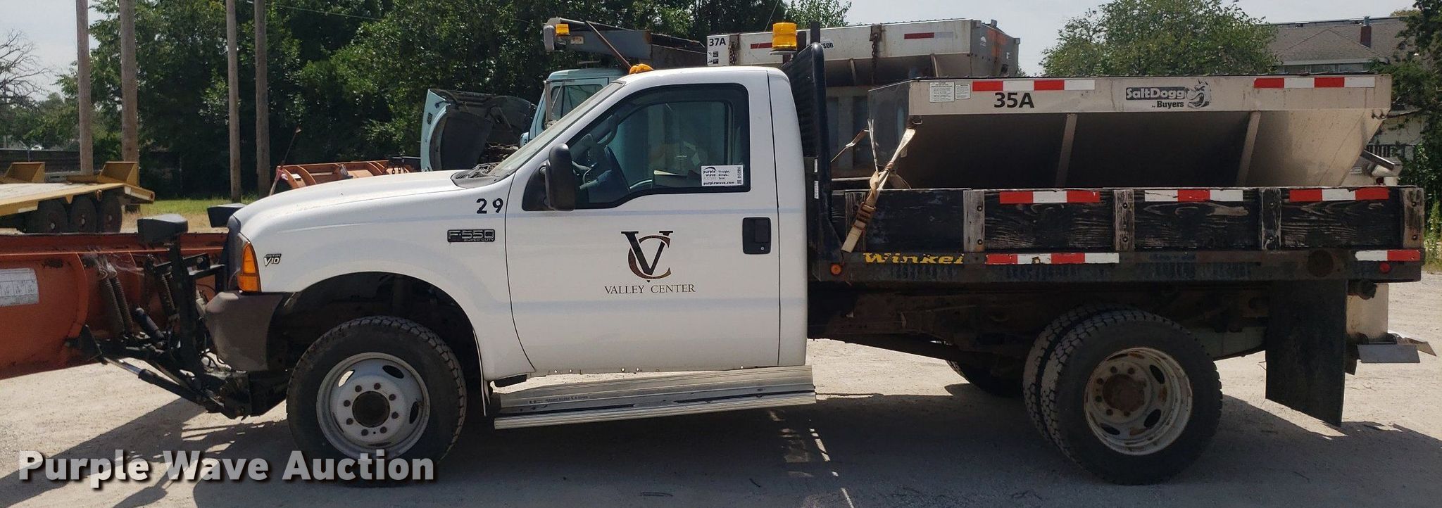 2001 Ford F550 Super Duty flatbed truck. Miles: 33,366 on odometer, VIN: 1FDAF56S31EB26068. Engine Displacement: 6.8L, Cylinders: 10, Fuel type: Gas. Transmission Automatic. Interior AC, Heat, Brake controller. Features Flatbed Winkle , 9' L x 96" W, Spreader SaltDogg , Hopper: 94" L x 46" W, Plow Henderson , Width: 9'. Tires Size: 225/70R19.5. Notes Dead battery. Kansas title. Valley Center Public Works Department. 545 W Clay St. Valley Center, KS 67147