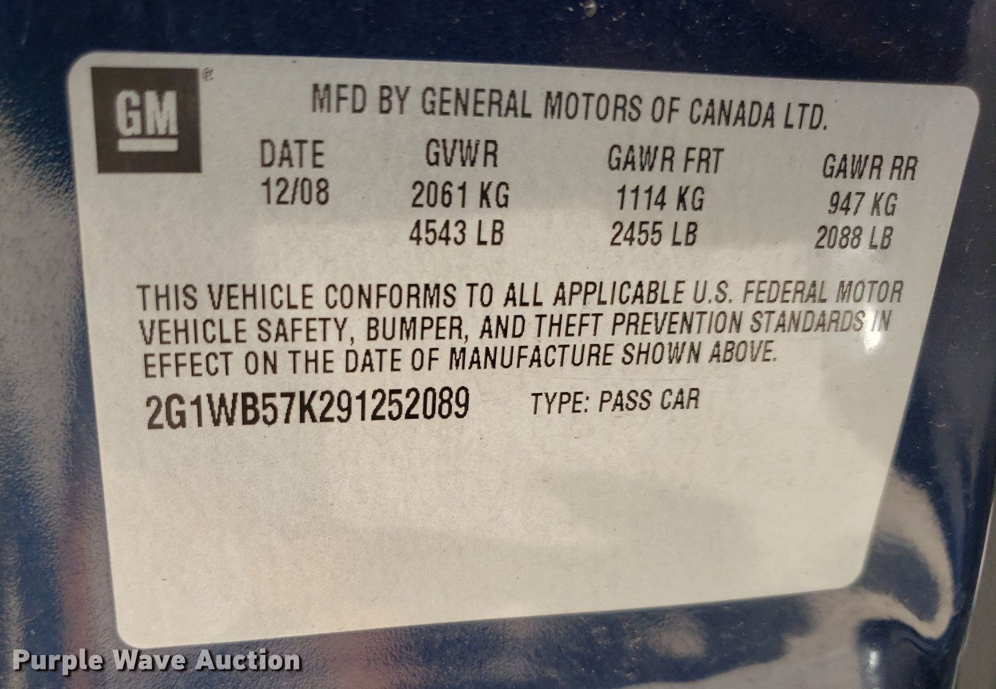 2009 Chevrolet Impala. Miles: 114,868 on odometer, VIN: 2G1WB57K291252089. Engine Displacement: 3.5L V6 OHV, Cylinders: 6, Fuel type: Gas. Transmission Automatic. Interior AC, Heat, Seat: Power driver, Power windows, Power locks, Cruise control. Tires Size: 225/60R15. Kansas title. Title distribution may be delayed up to 14 days from verification of funds. City of Derby. 3531 East 55th Street South. Derby, KS 67037