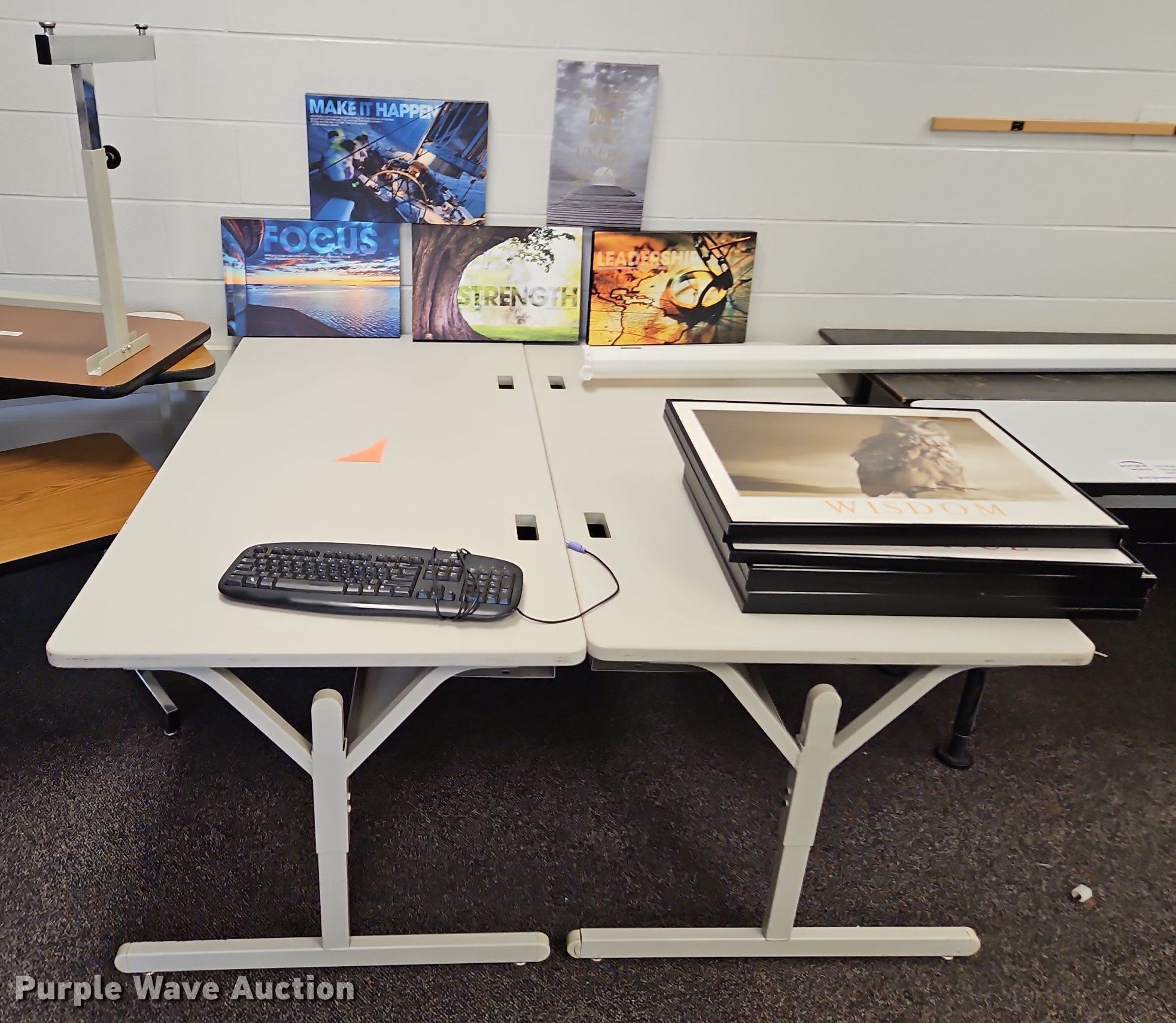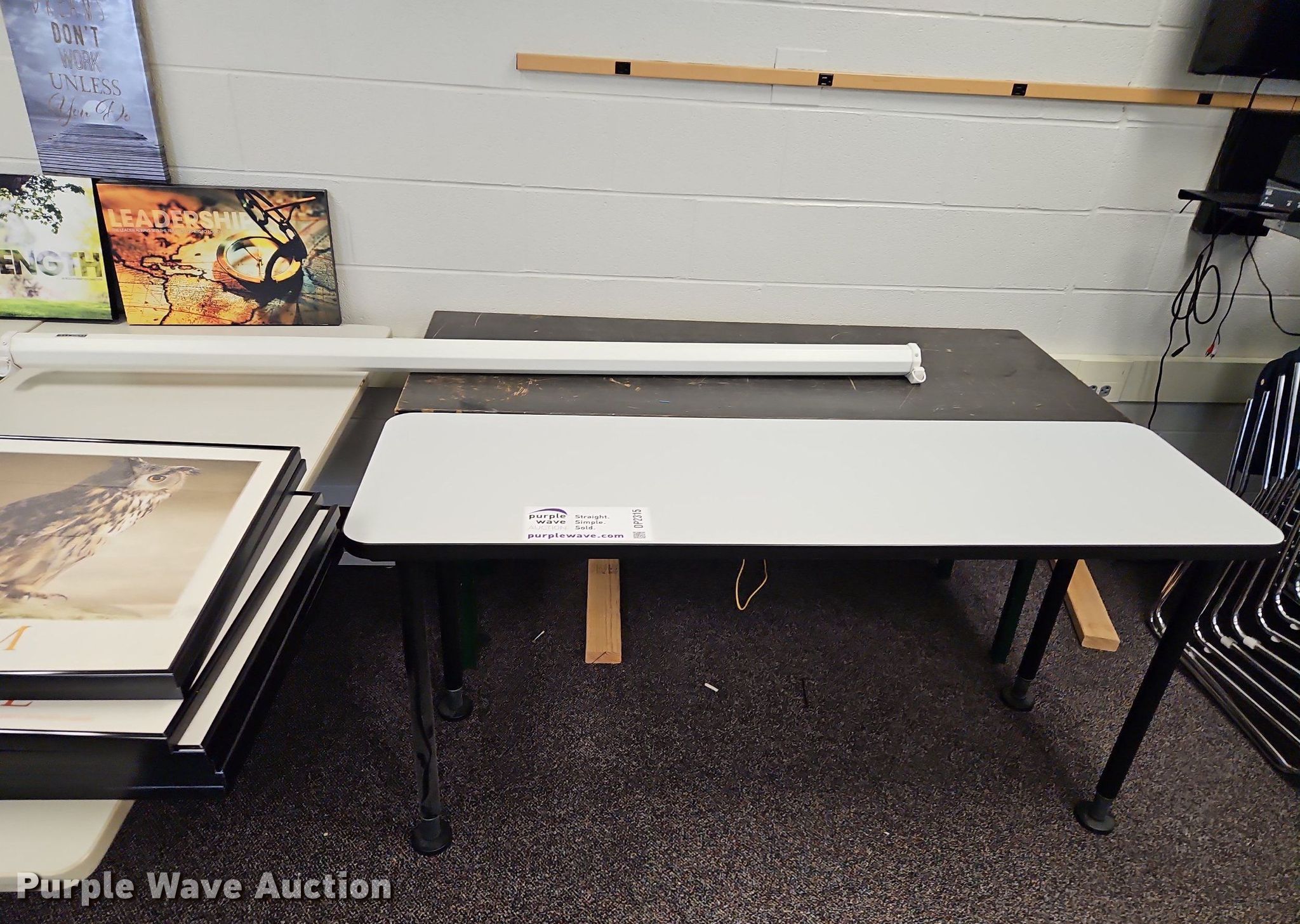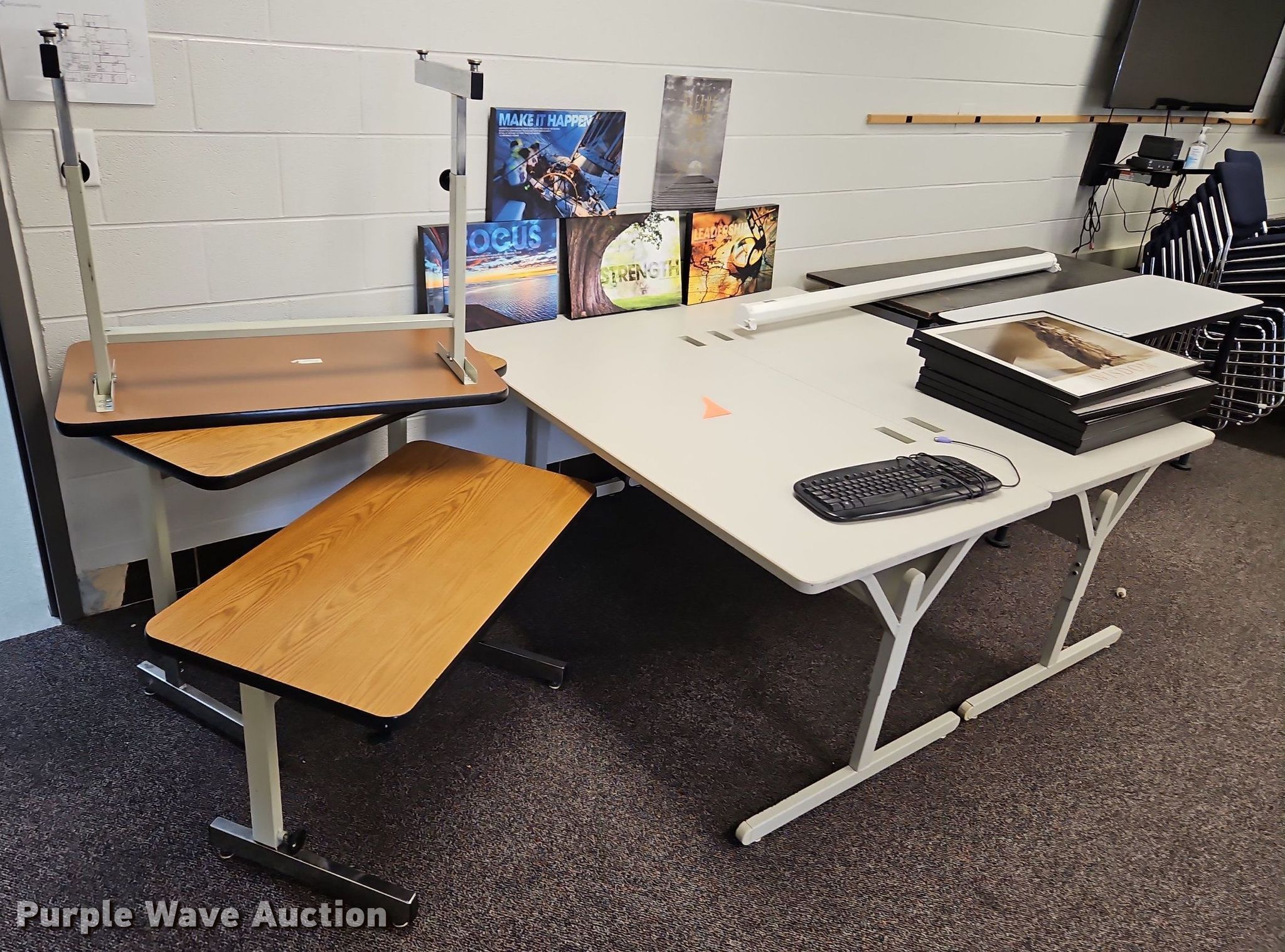 Purple Wave is selling a used Office Supplies and Equip. in Missouri. This item is a Office supplies and equipment with the following: (2) tables, (2) computer tables, (3) desks, Motivational pictures, Projector screen