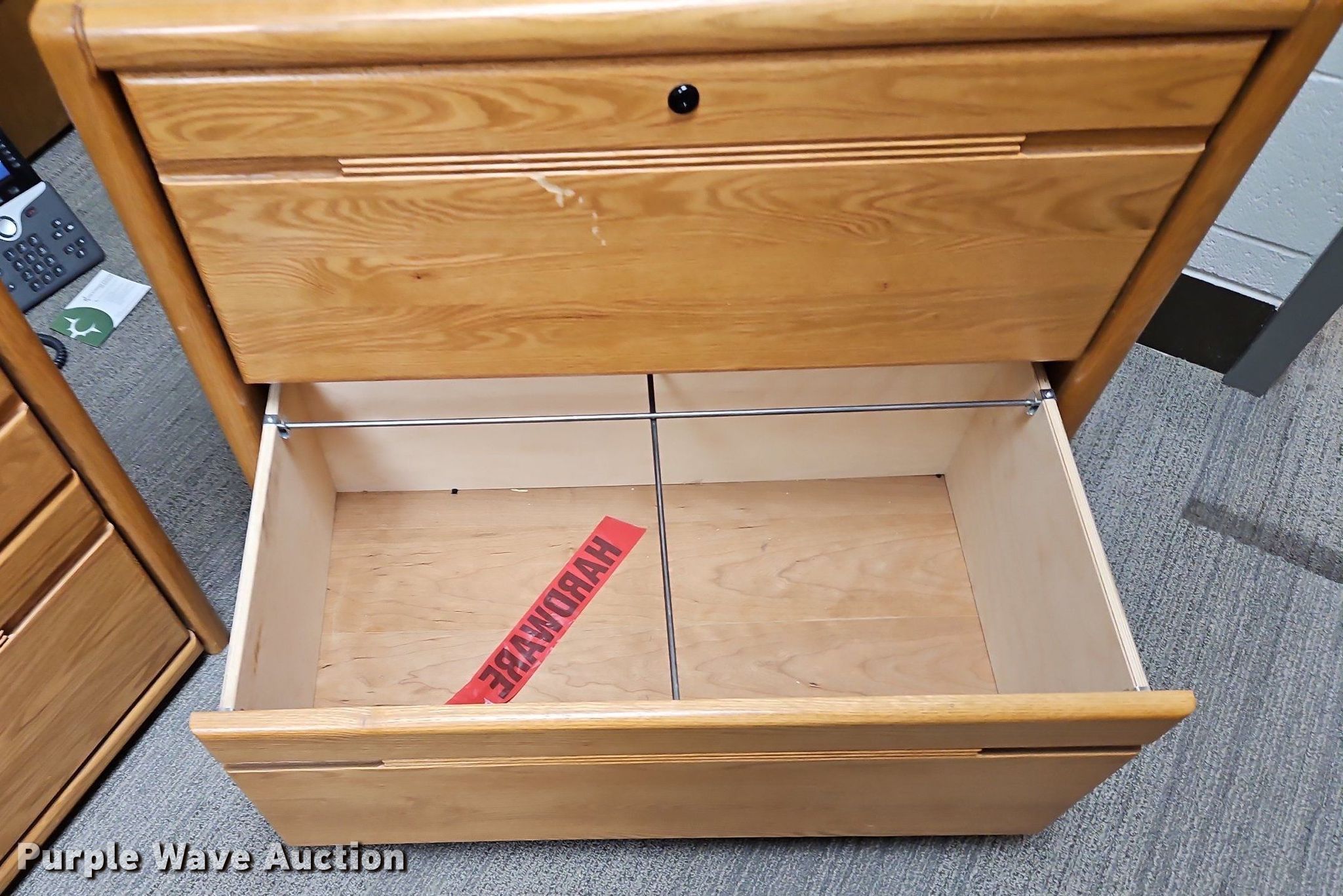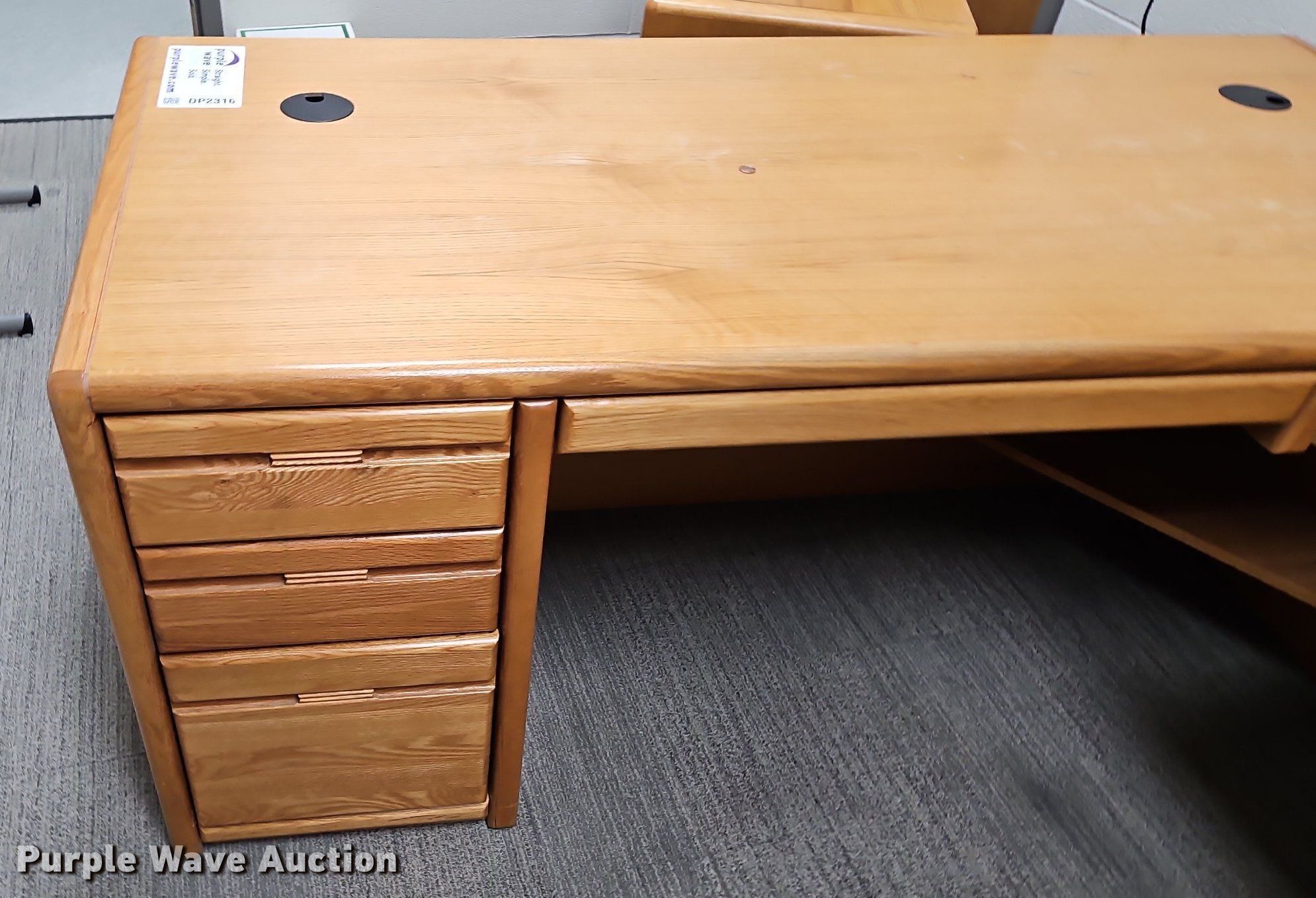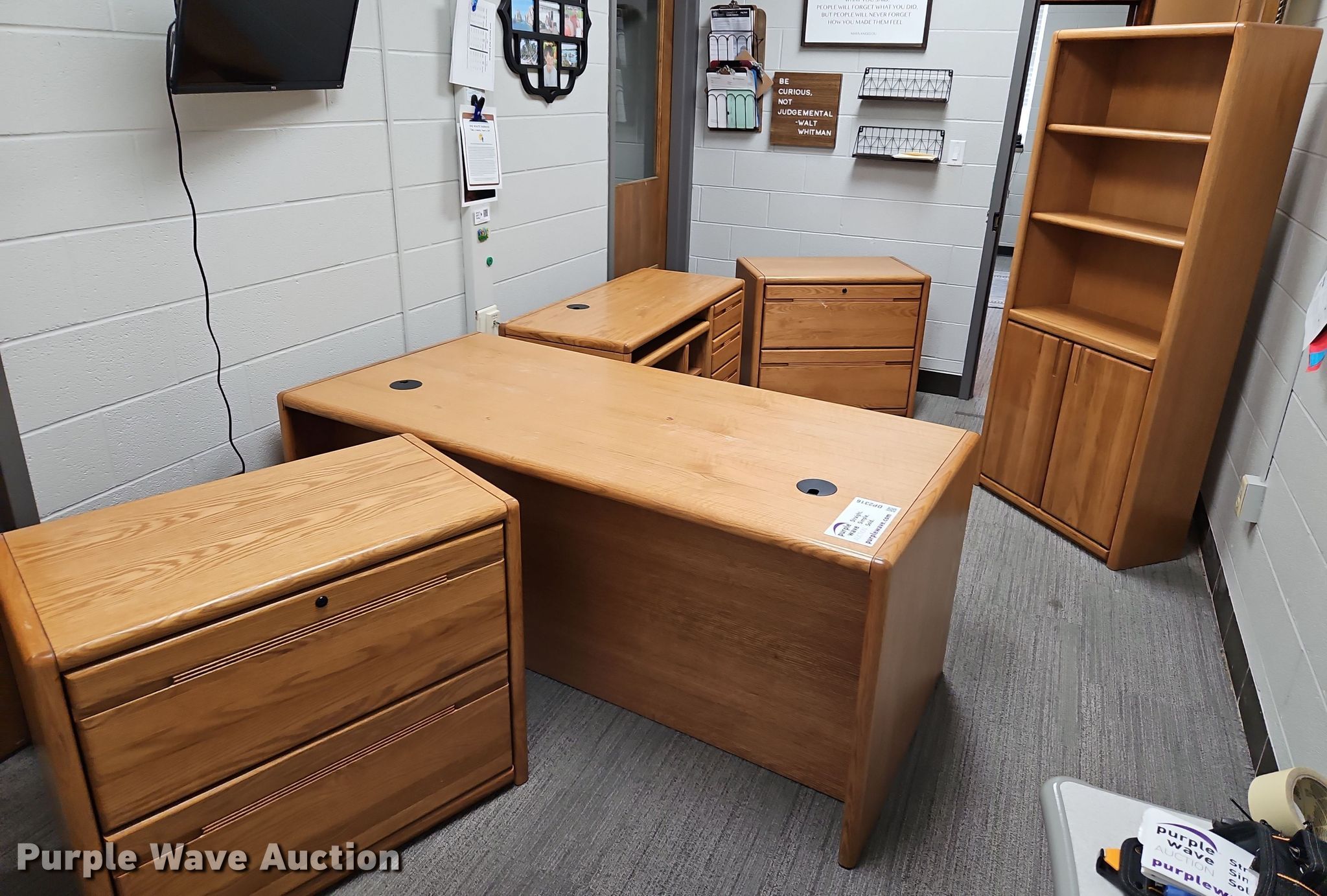 Purple Wave is selling a used Furniture in Missouri. This item is a Furniture with the following: L-shape wood desk, (2) two drawer wood file cabinets, Wood bookshelf