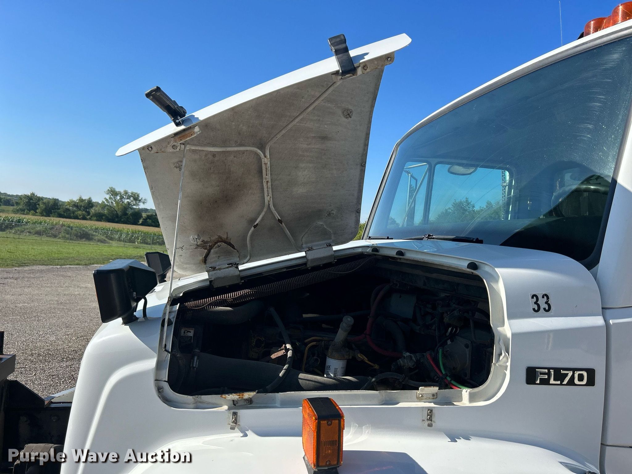 2002 Freightliner FL70 dump truck. Miles: 47,439 on odometer, Hours: 2,301 on meter, VIN: 1FVABUAK42HK41199, Unit #: 33. Engine Caterpillar 3126, Displacement: 7.2L, Cylinders: 6, Fuel type: Diesel. Transmission Automatic. Chassis Axles: Single, Differential lock: Full, Suspension: Spring, Brakes: Air, PTO, Front mount PTO, GVWR: 35,000 lbs, Wheelbase: 150". Interior Heat, Heated mirrors, Cruise control. Features Dump bed McClain 650U, Capacity: 6.2 cu.yd., 10' L x 96" W, Side height: 28", Side board height: 10", Bed type: Steel, Ram: Single , End gate: Manual, Spreader Highway Equip. Co. SA-8, Plow Sno-King, Width: 132". Tires Size: 11R22.5. Notes Dead battery, Plow cylinder leaks , Tailgate spreader does not fit truck. Iowa title. Seller is a government entity who will be assigning and distributing the title. Please contact the seller for distribution questions. City of Urbana. 2101 1/2 Faith St. Urbana, IA 52345
