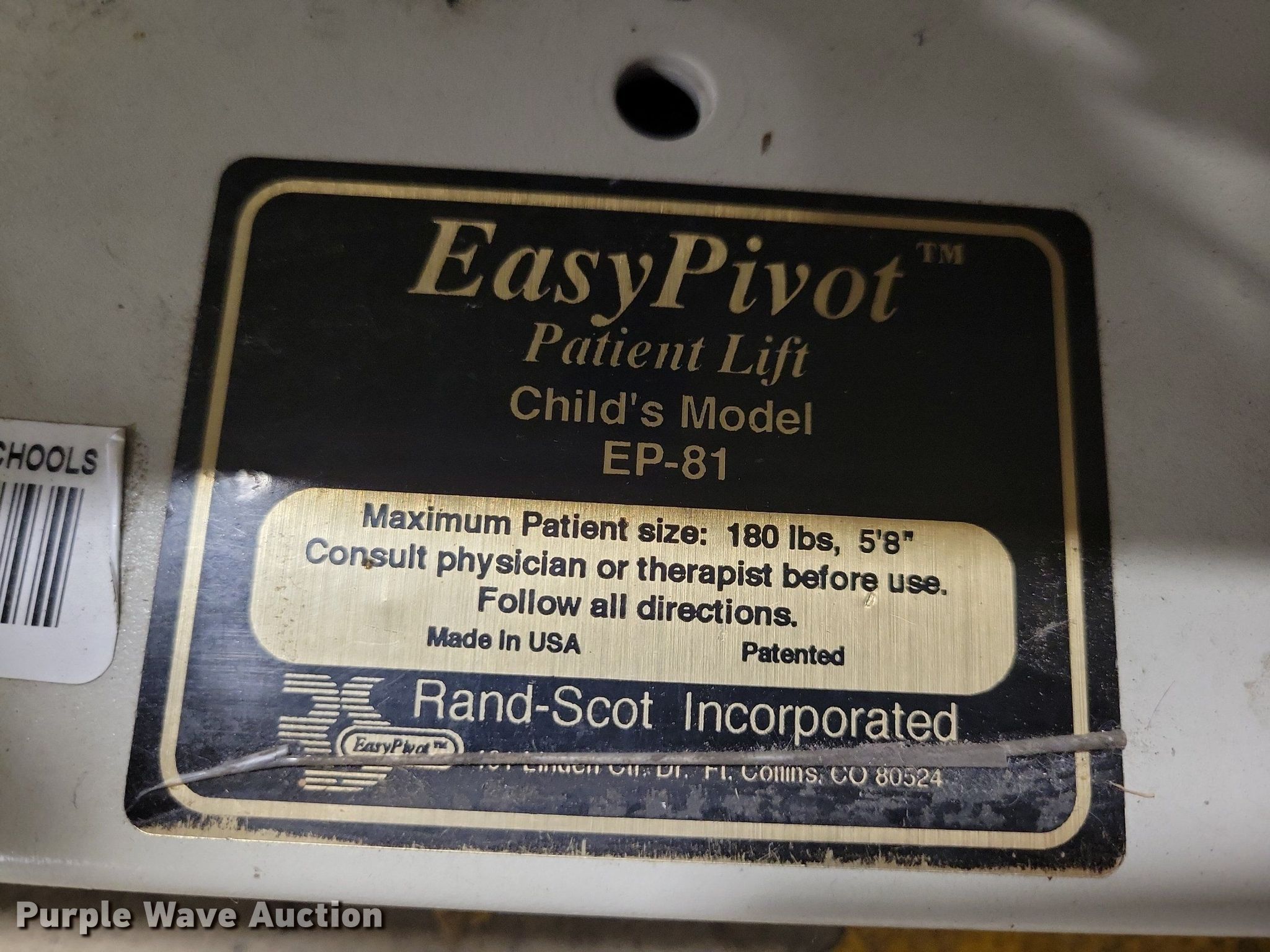 Purple Wave is selling a used Medical Equip. in Iowa. This item is a Easy Pivot EP-81 patient lift with the following: Child's model