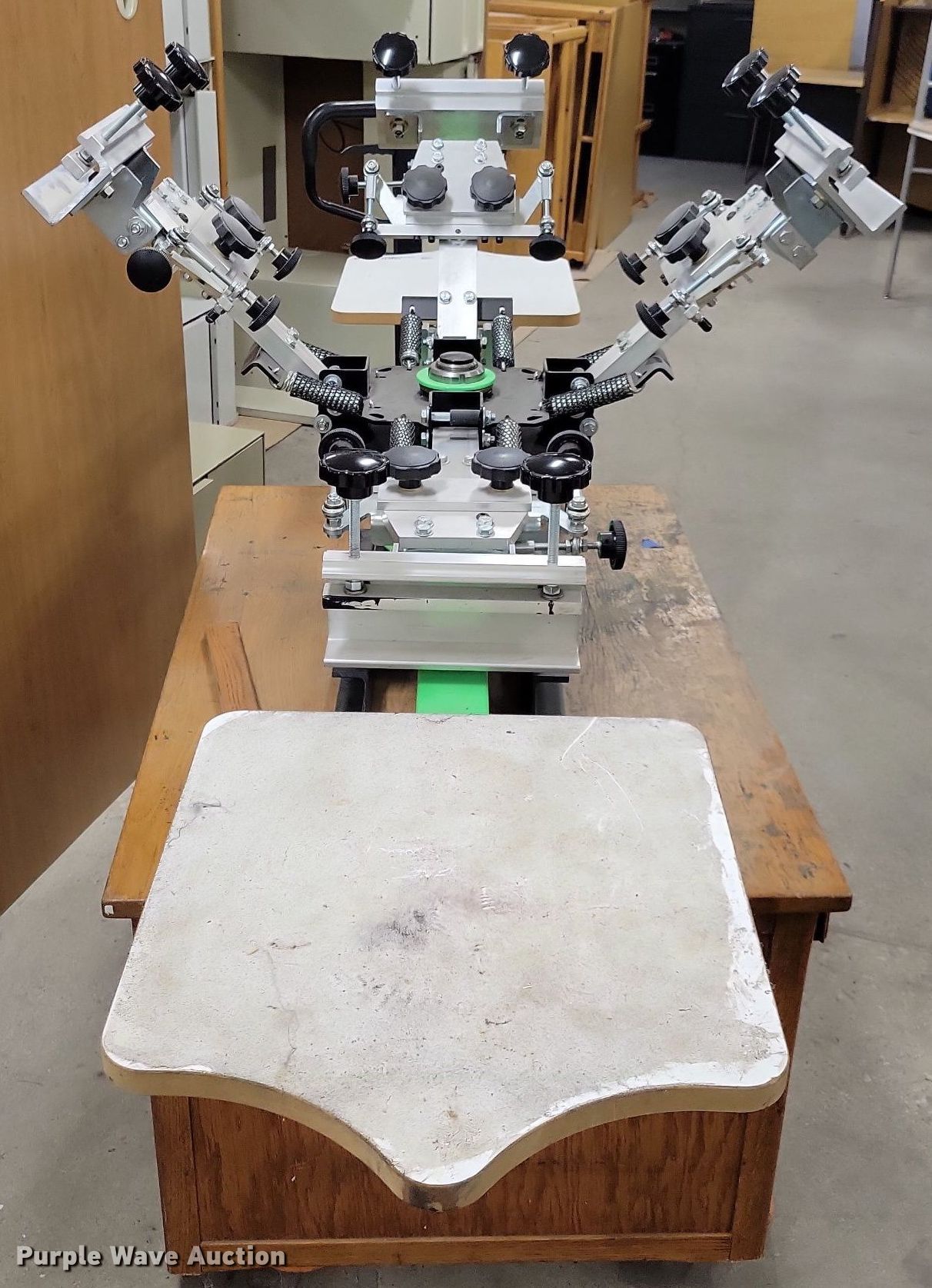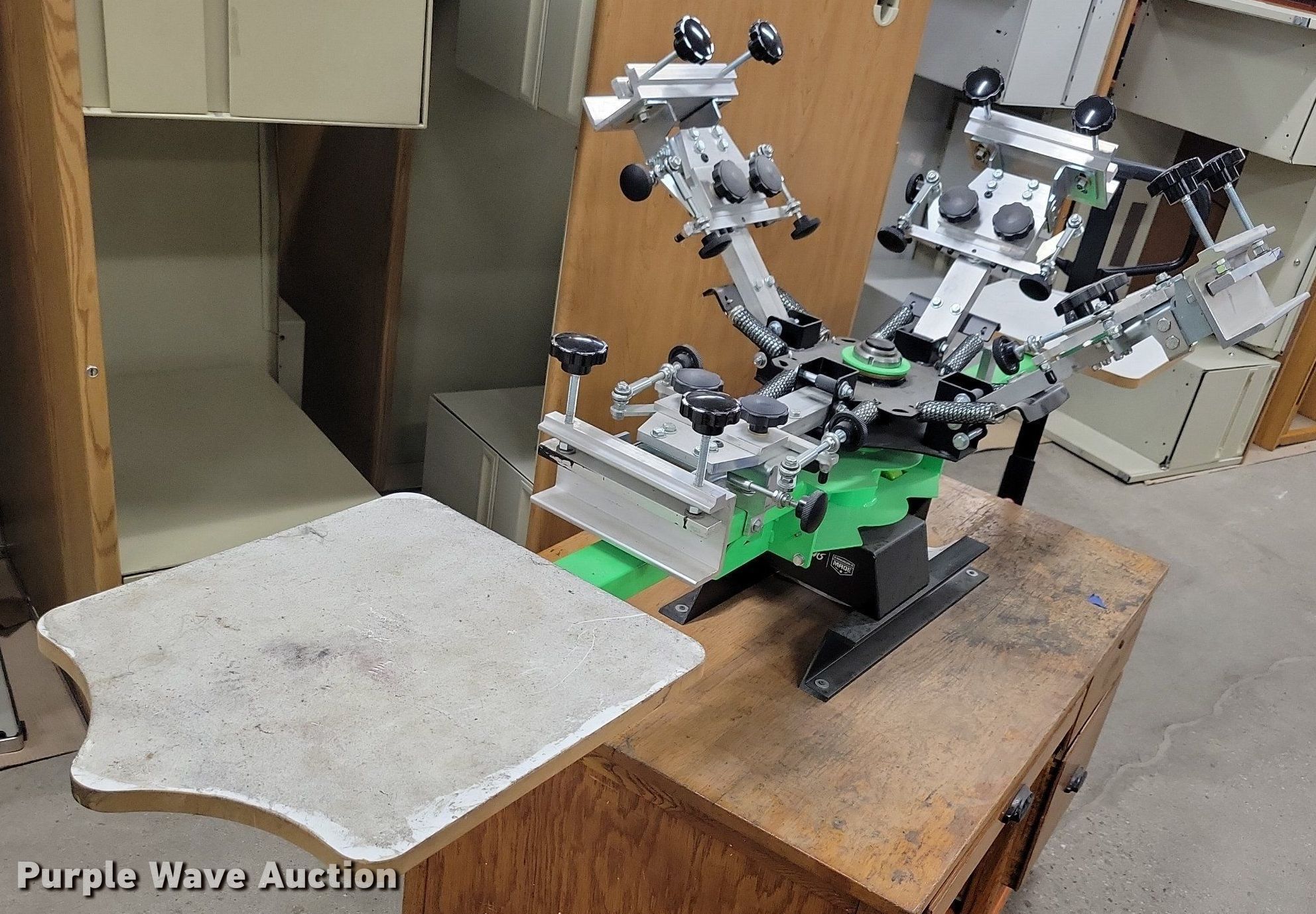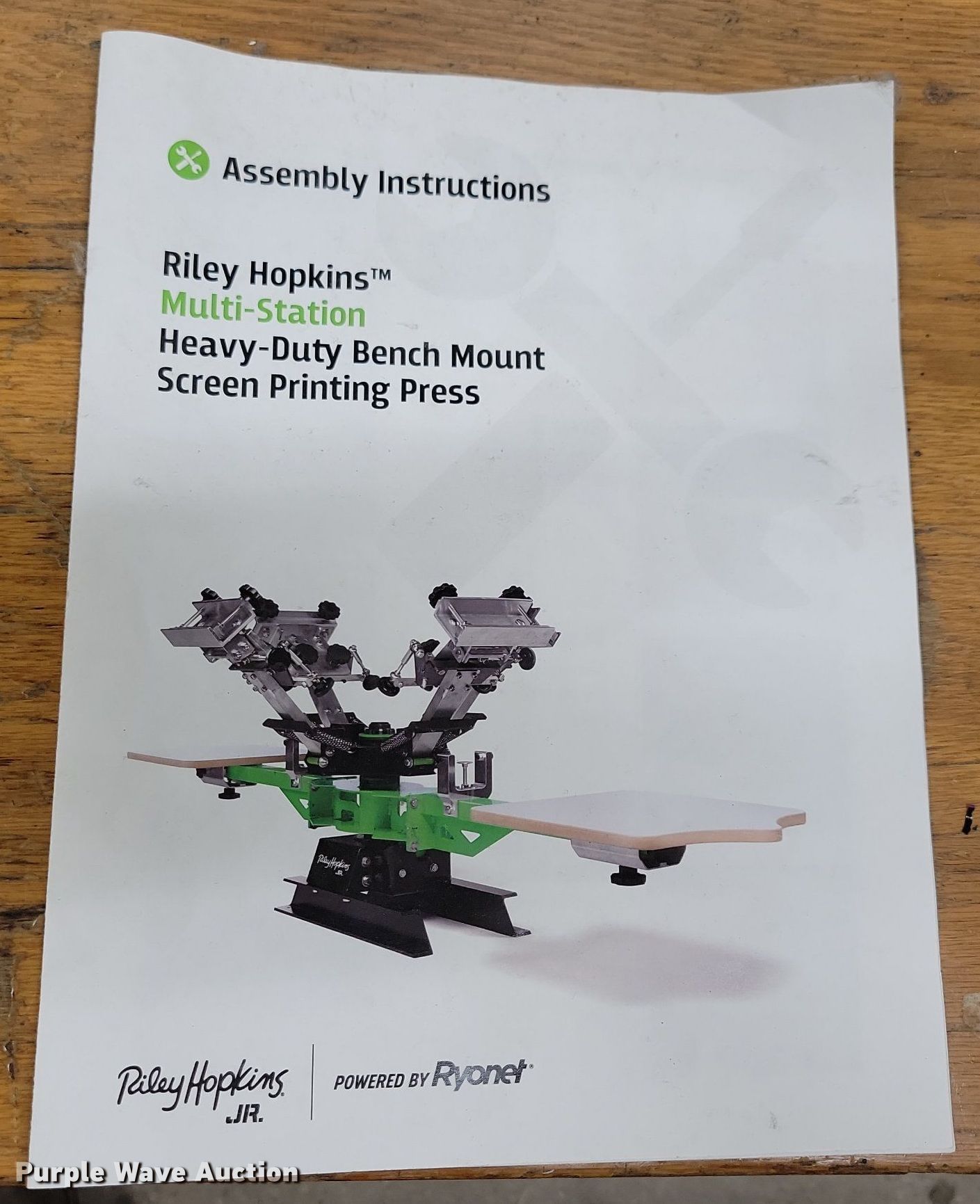 Purple Wave is selling a used Tools in Iowa. This item is a Riley Hopkins screen printing press with the following: Bench mounted