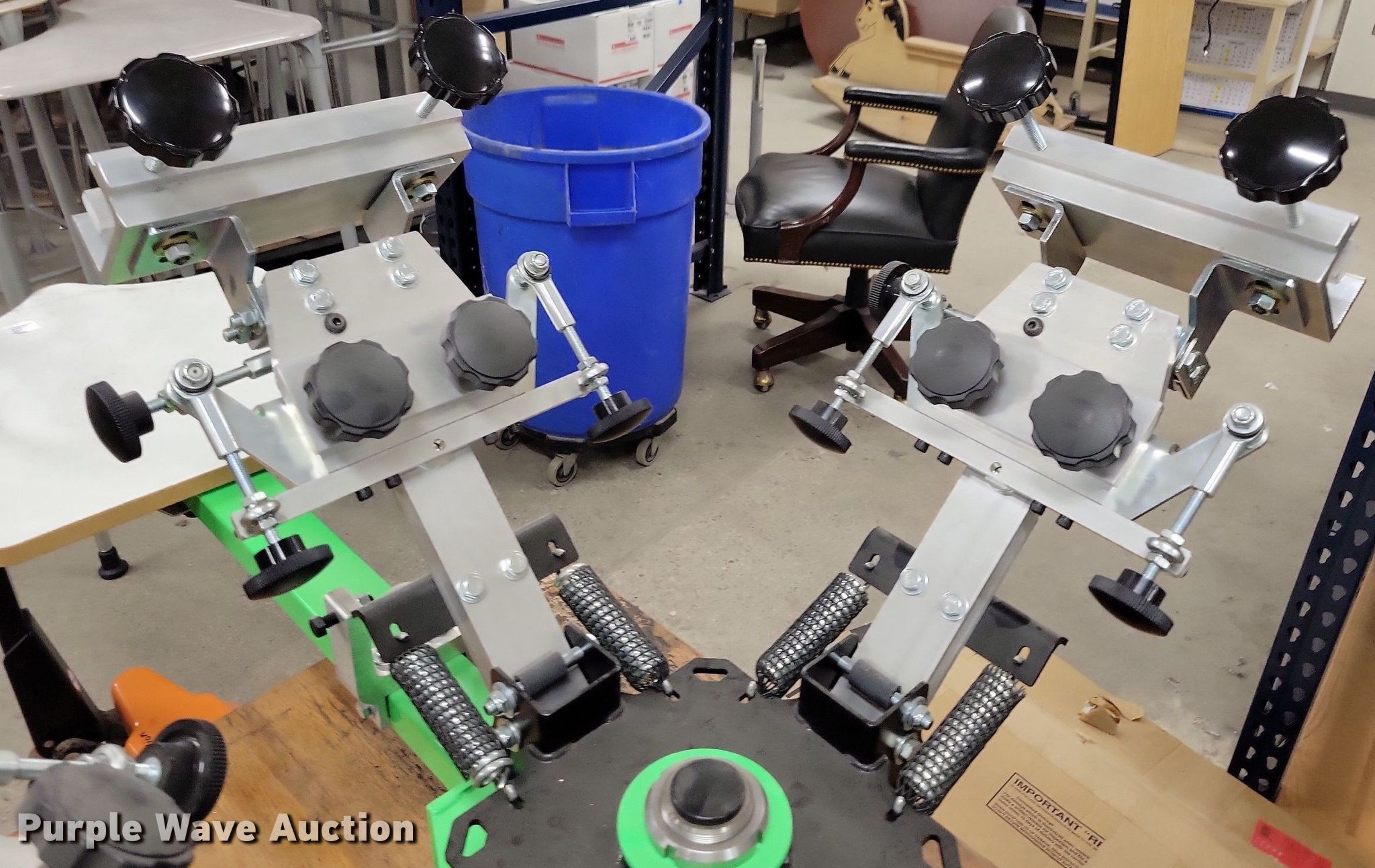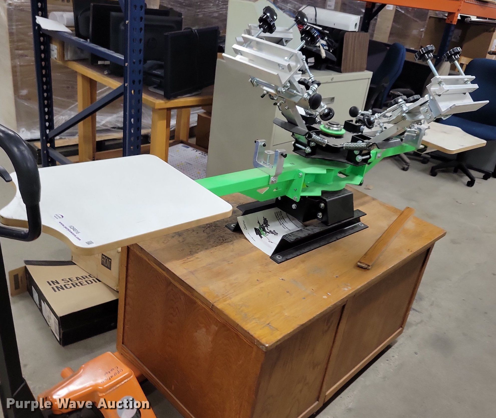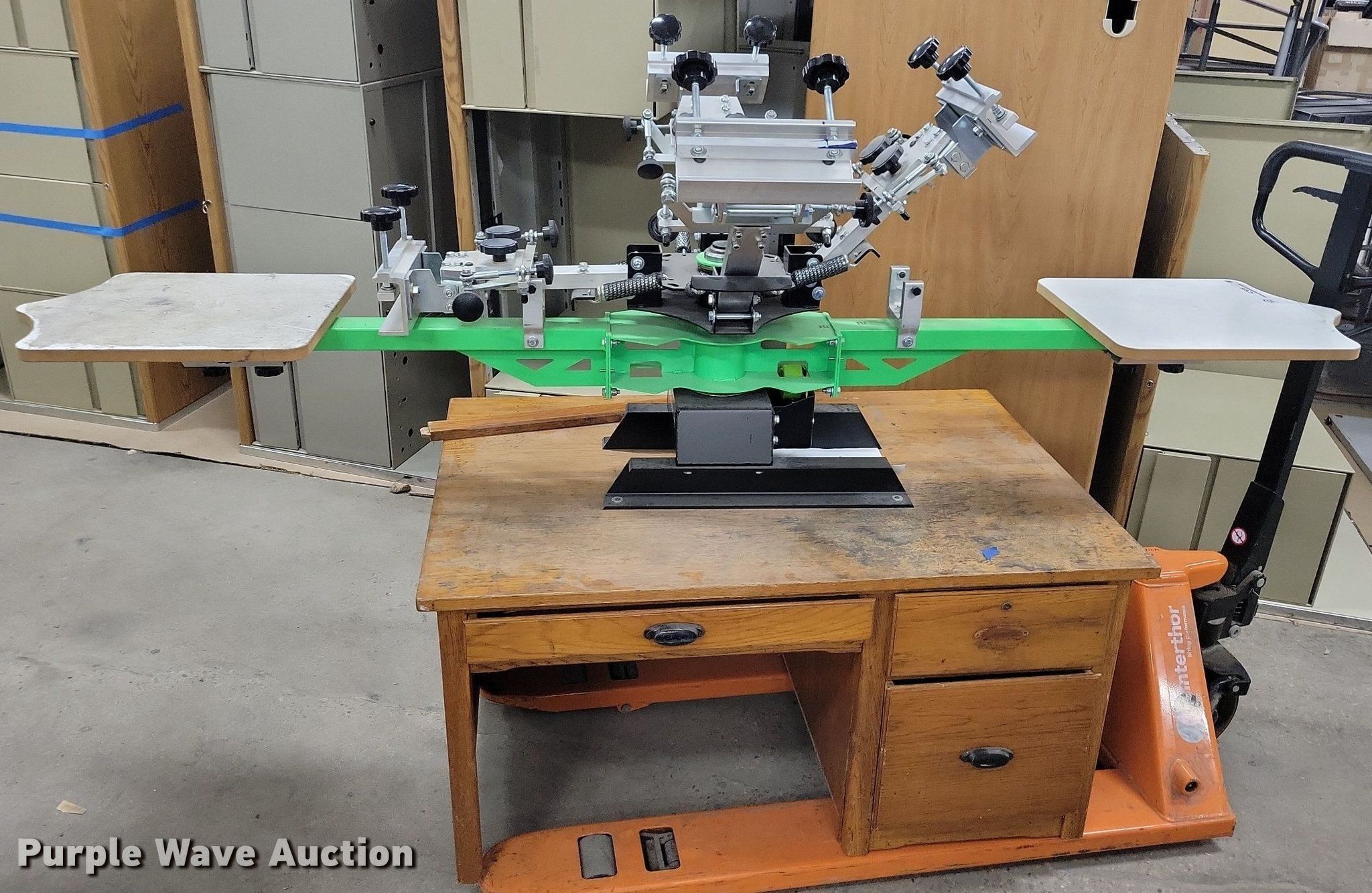 Purple Wave is selling a used Tools in Iowa. This item is a Riley Hopkins screen printing press with the following: Bench mounted