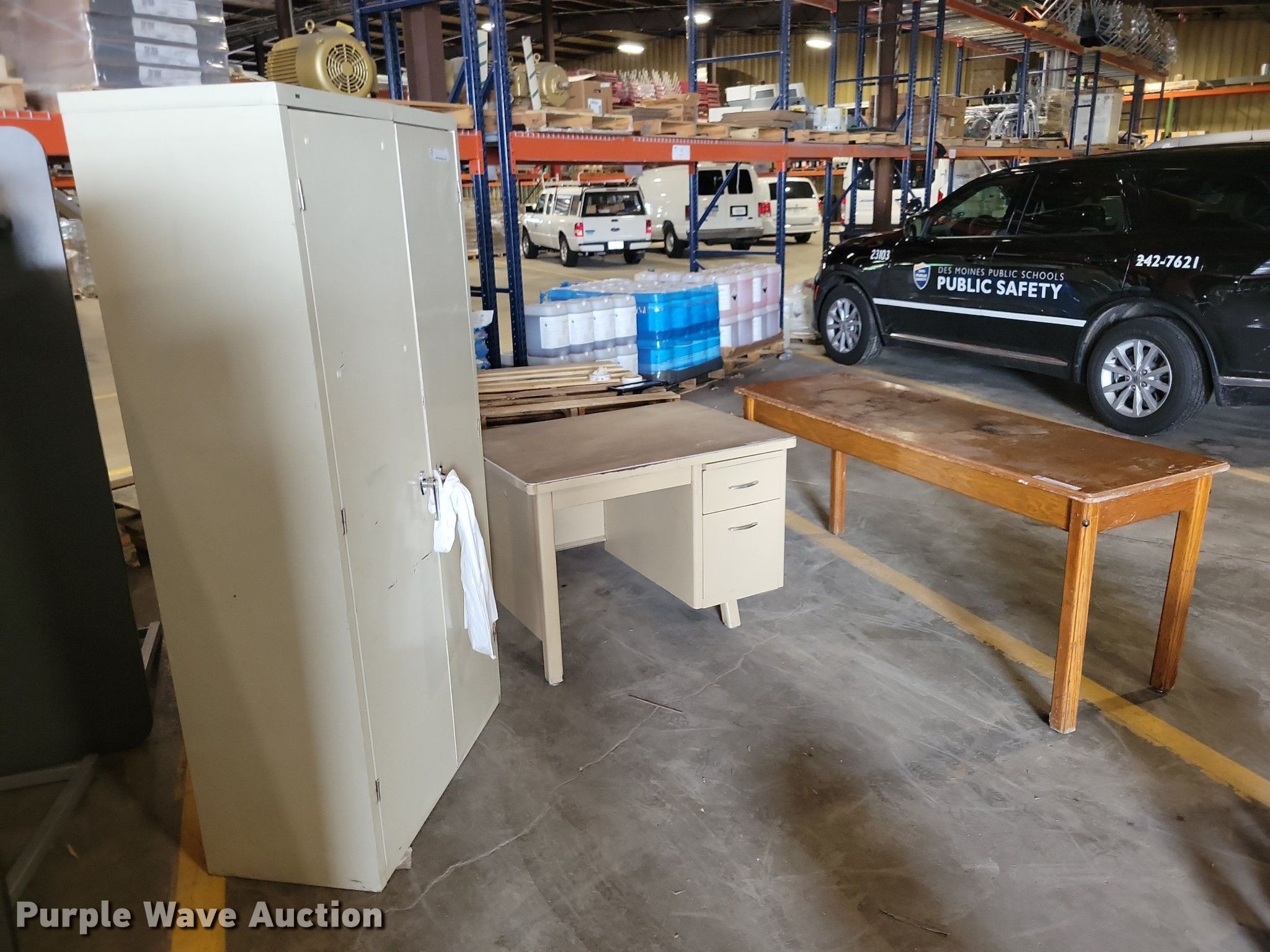 Furniture. (2) desks 30" x 42" x 29", 2' x 6' x 30", Storage cabinet 3' x 18" x 6', Handle broken. Des Moines Public Schools. 1917 Dean Avenue. Des Moines, IA 50316
