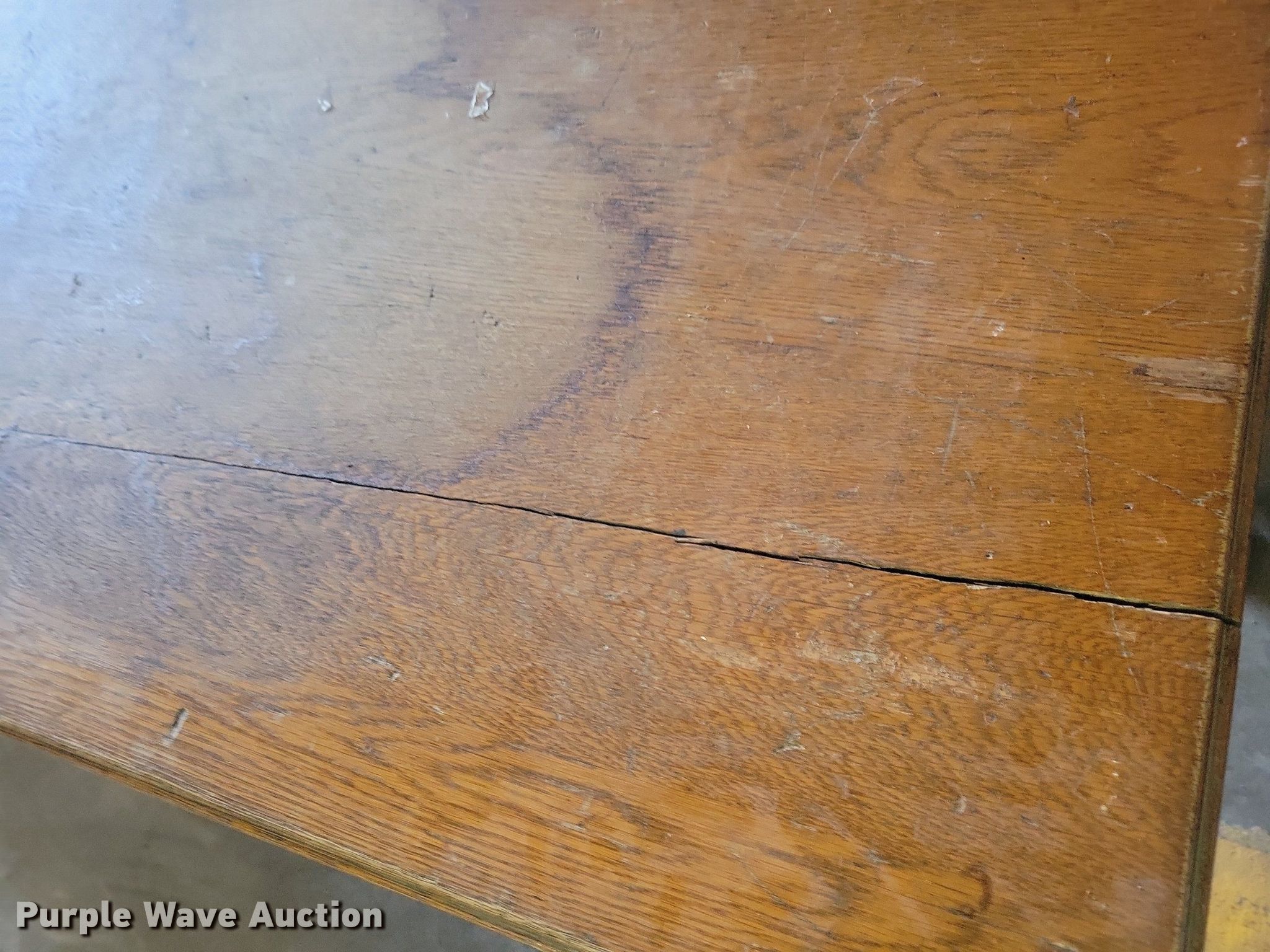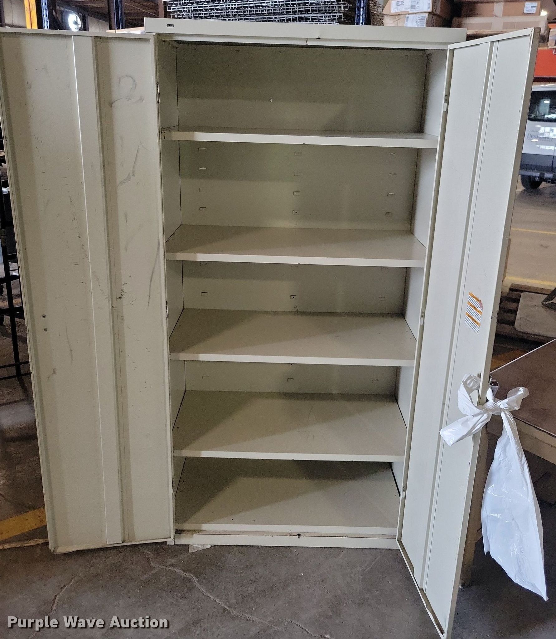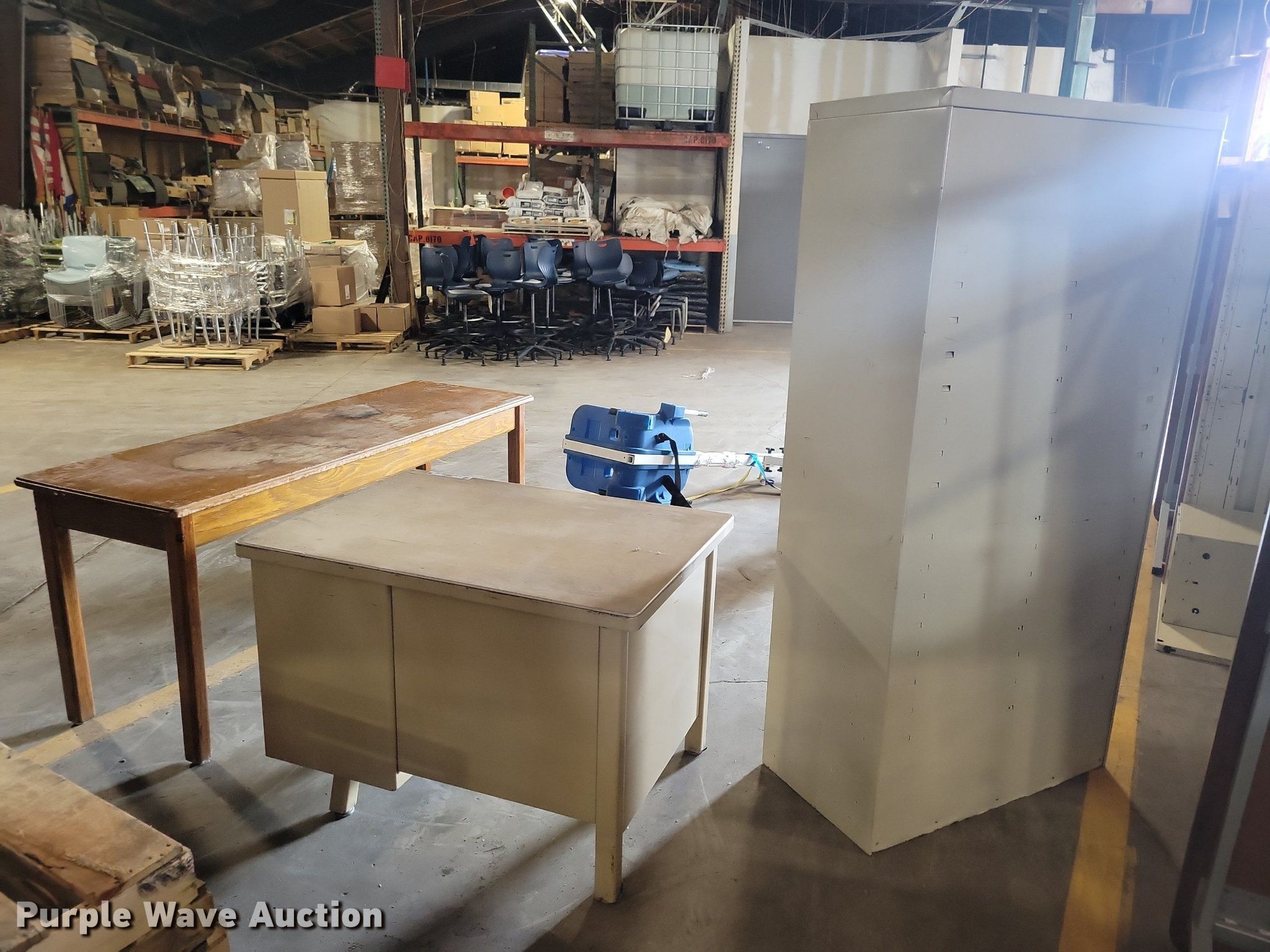 Purple Wave is selling a used Furniture in Iowa. This item is a Furniture with the following: (2) desks, 30" x 42" x 29", 2' x 6' x 30", Storage cabinet, 3' x 18" x 6', Handle broken