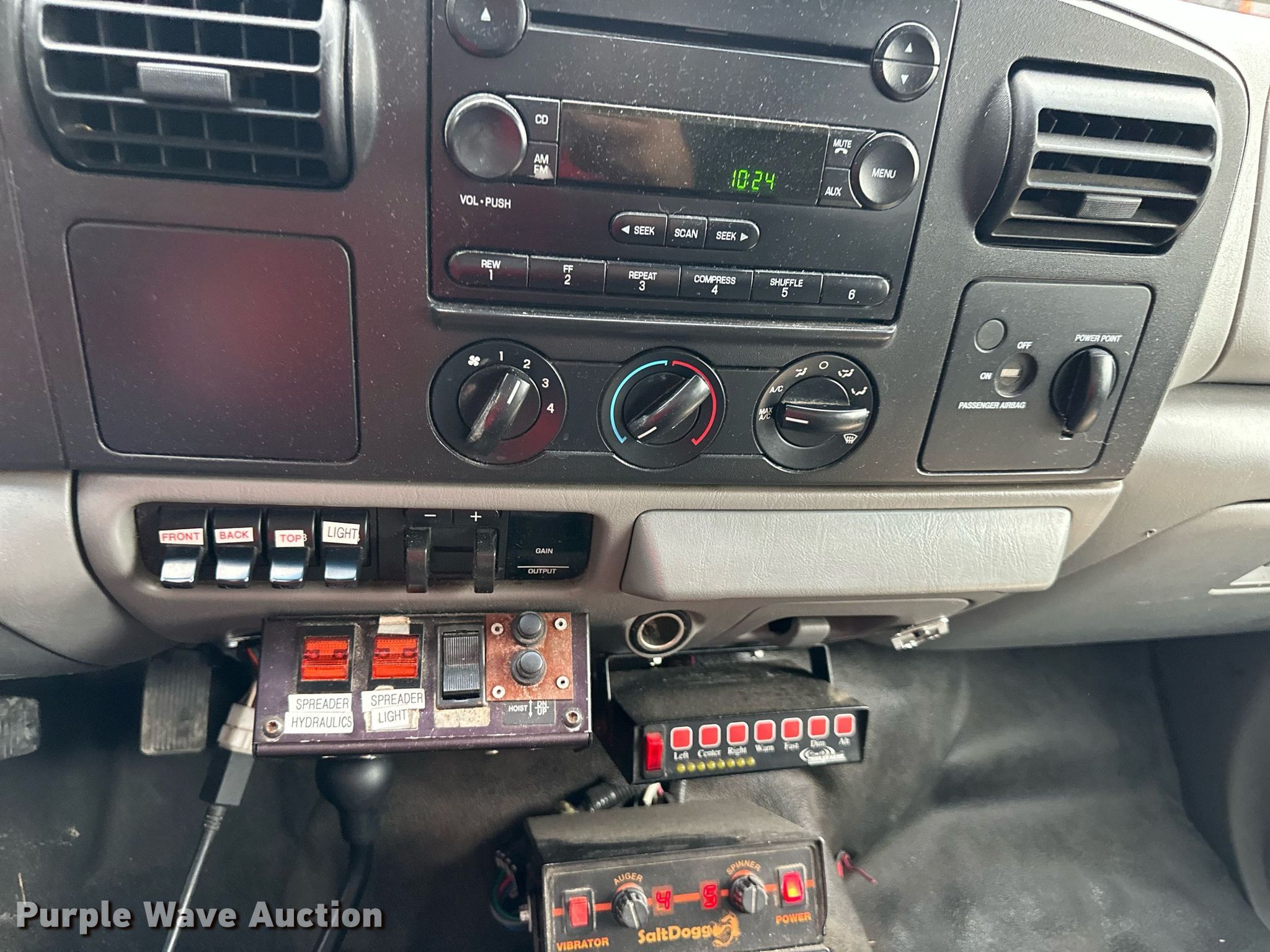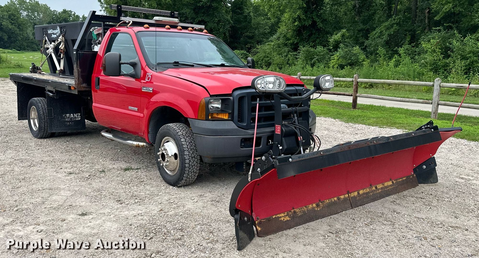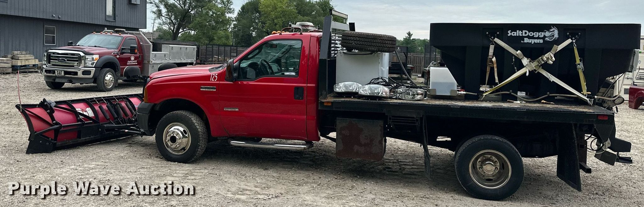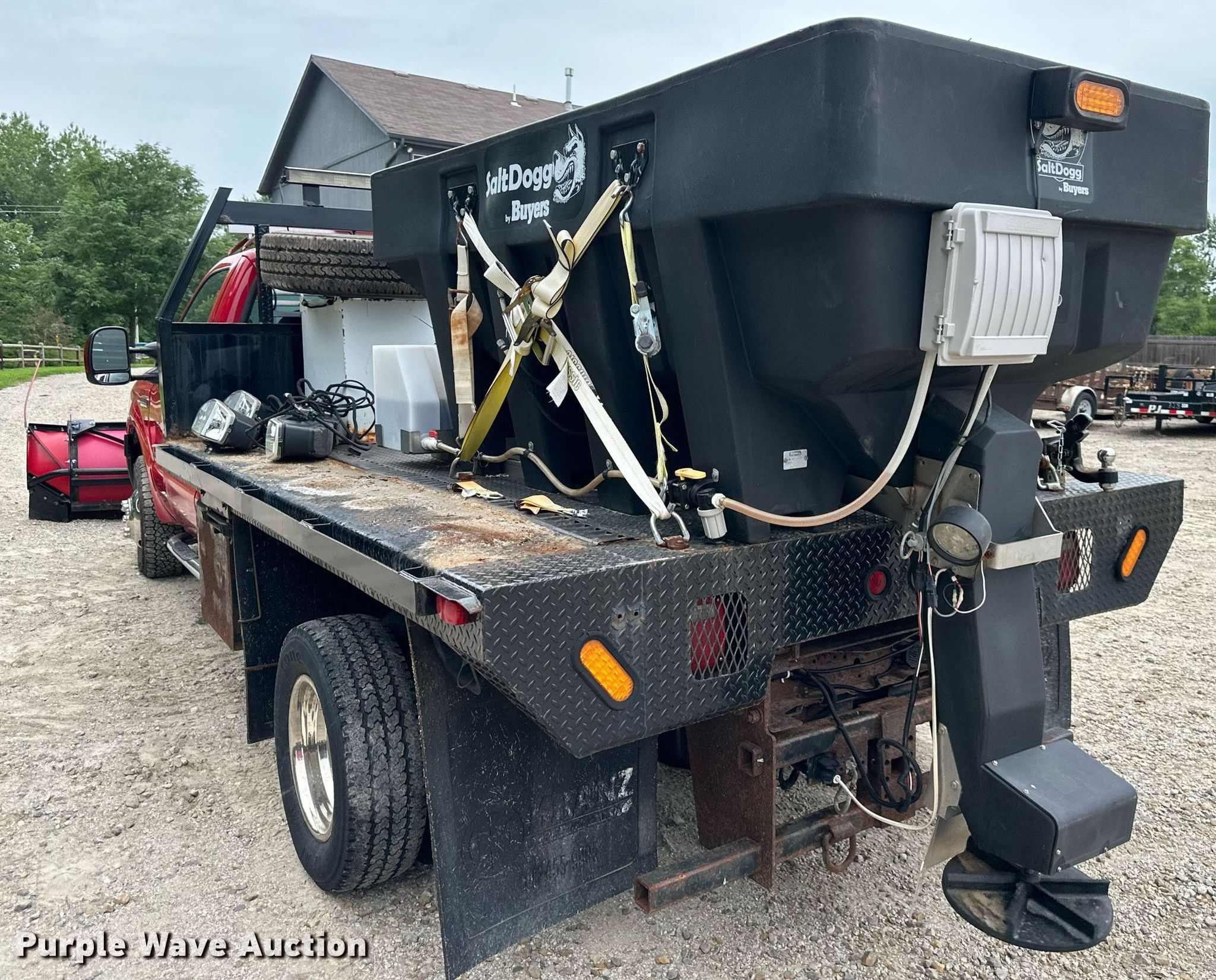 2006 Ford F350 Super Duty flatbed pickup truck. Miles: 108,291 on odometer, VIN: 1FDWF37P56ED02050, Unit #: 125. Engine Displacement: 6.0L V8 OHV, Cylinders: 8, Fuel type: Diesel. Transmission Automatic, Four wheel drive. Interior AC, Heat, Power windows, Power locks, Cruise control. Features Flatbed 11' L x 96" W, Snow plow Width: 10', Spreader SaltDogg, 7'L x 54"W, Auxiliary fuel tank Fill-Rite pump GPM: 15.. Tires Size: 235/85R16. Kansas title. Seller is a government entity who will be assigning and distributing the title. Please contact the seller for distribution questions. City of Shawnee Parks. 6161 Woodland Drive. Shawnee, KS 66218