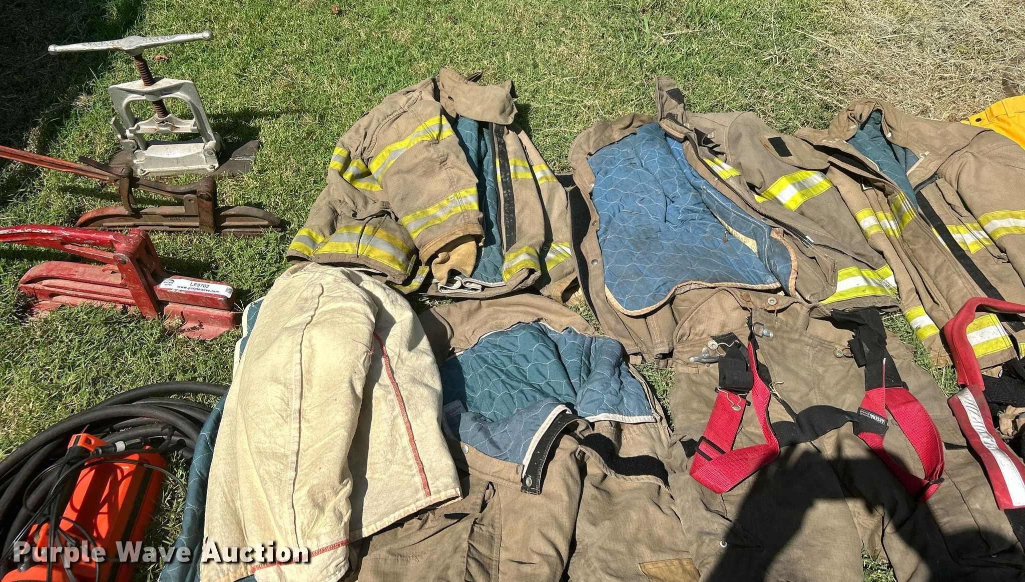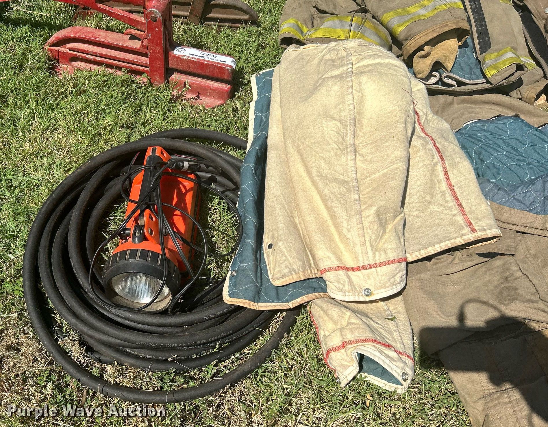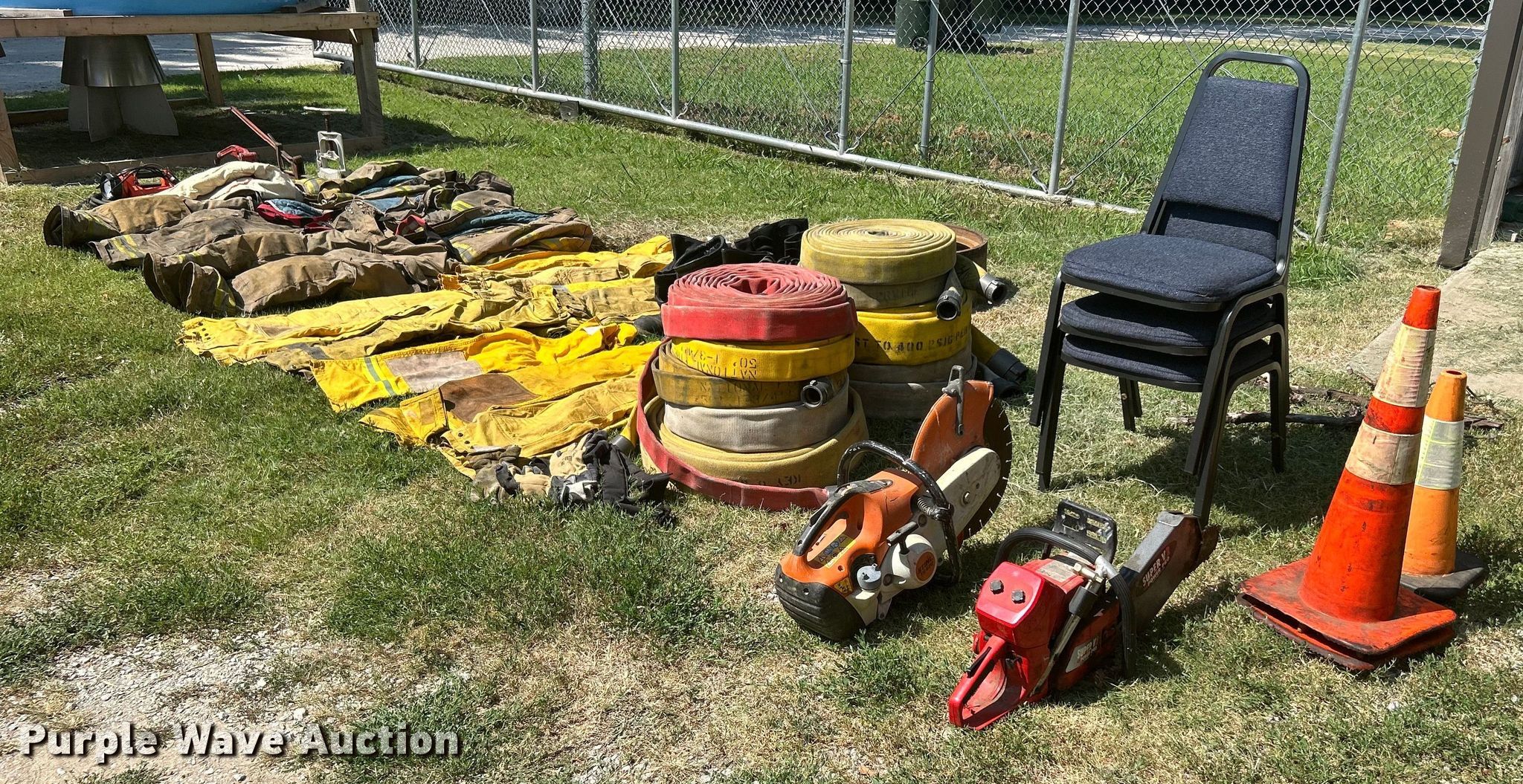 Purple Wave is selling a used Tools in Oklahoma. This item is a Fire fighting equipment with the following: (3) hose clamps, (3) sets of bunker gear, (9) pairs of pants, (7) pairs of boots, Stihl concrete saw, Super V2 Power Pro chainsaw, (3) traffic cones, (3) chairs, Hoses, Flashlight, Unknown operating condition of saws