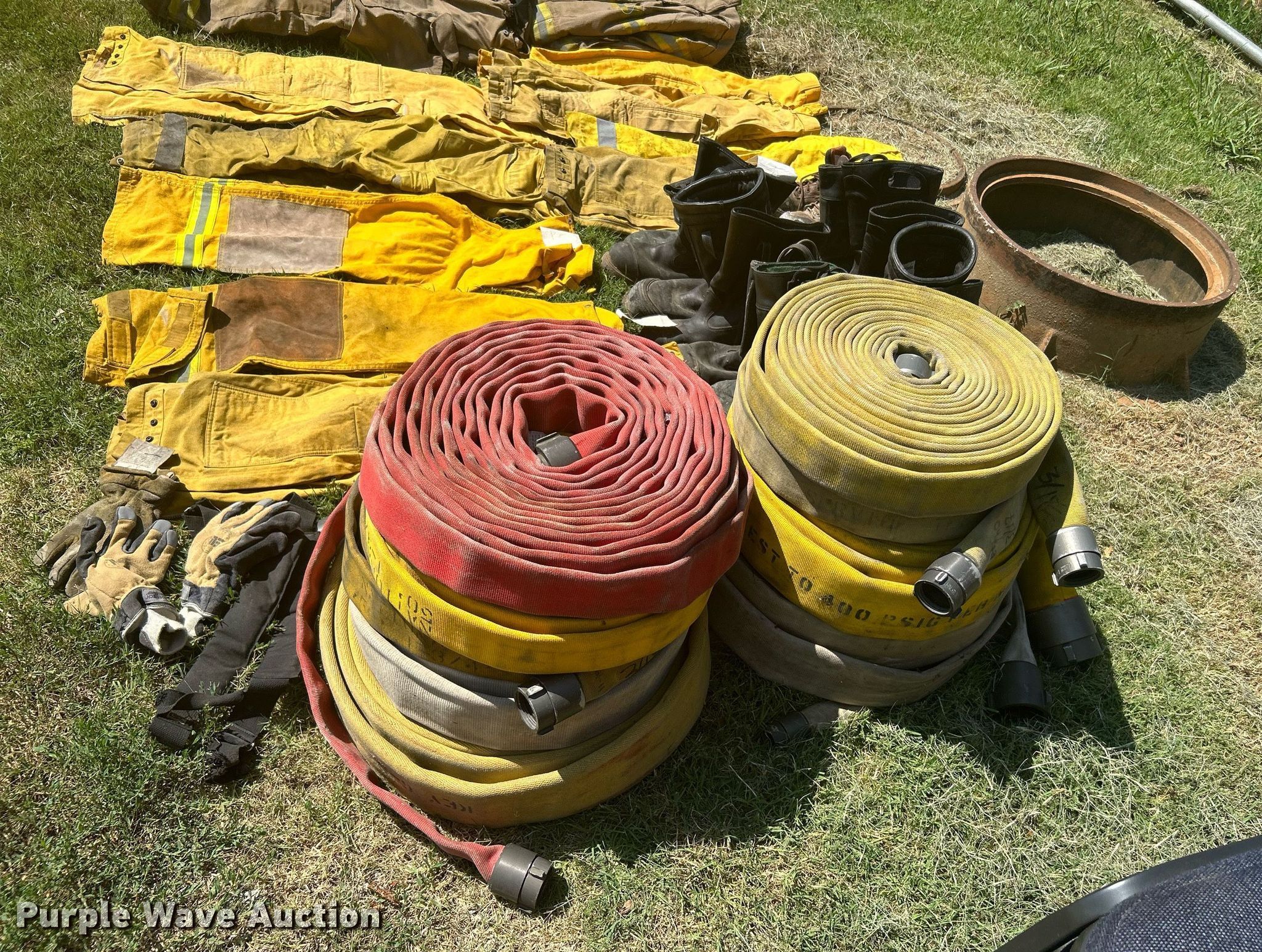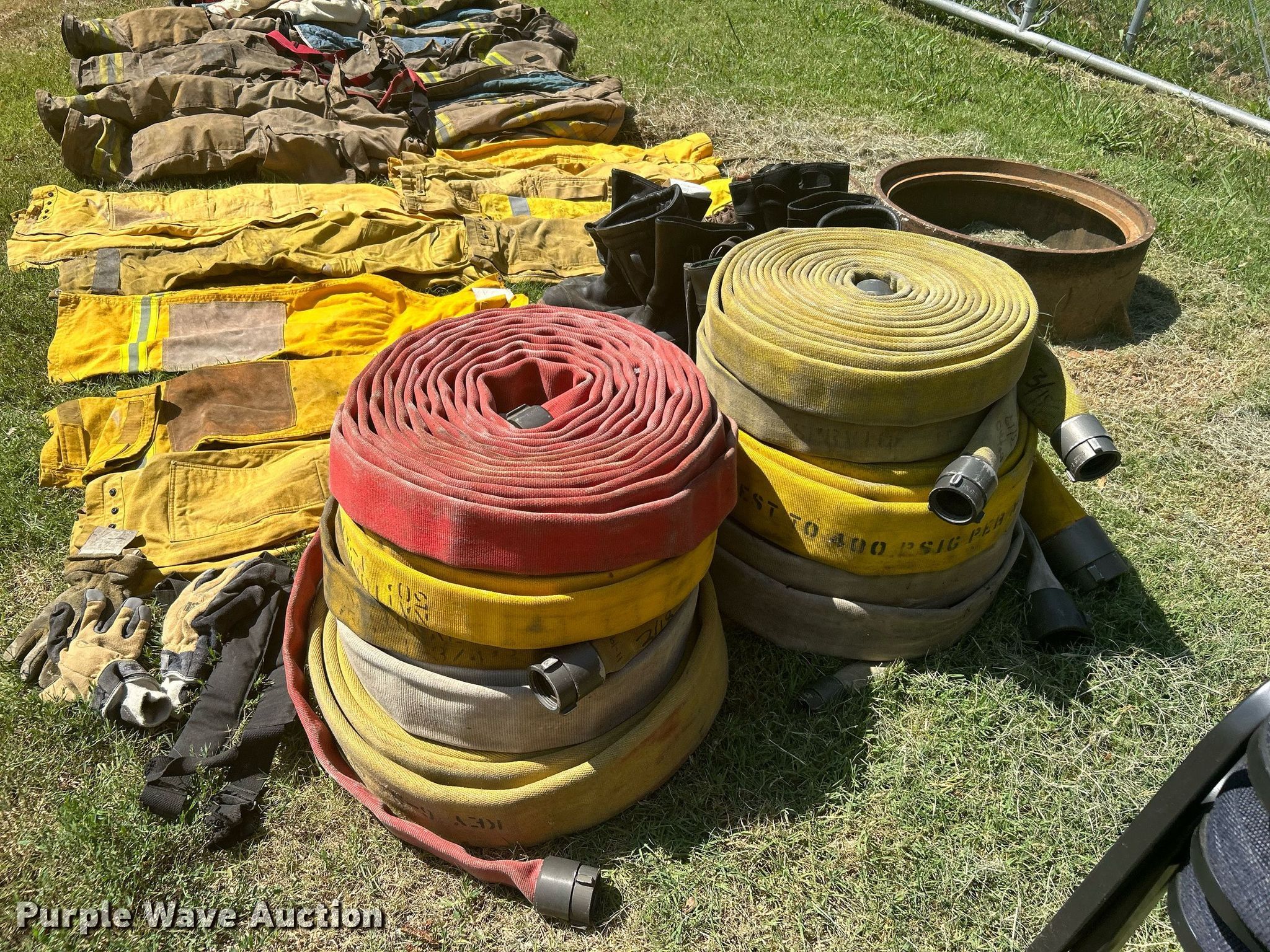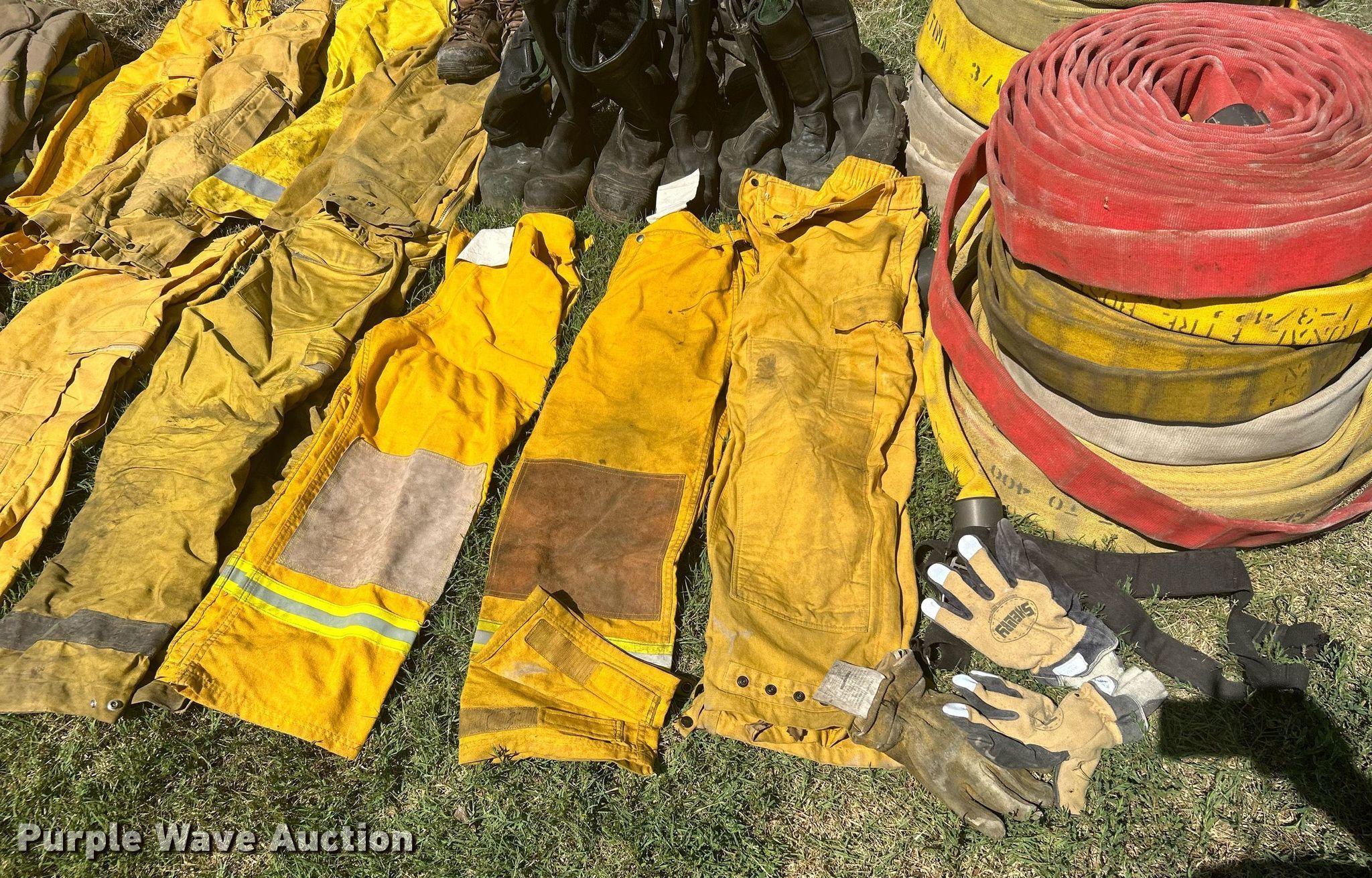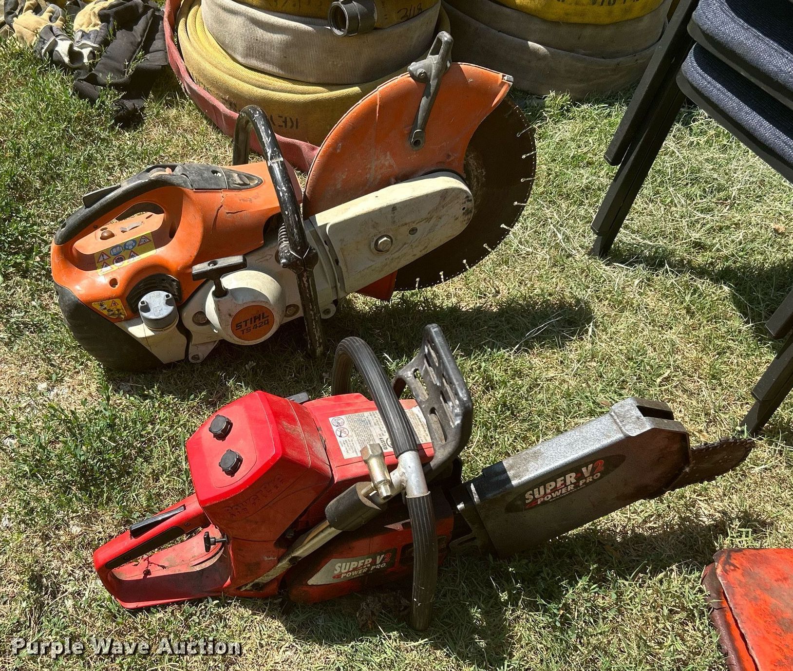 Purple Wave is selling a used Tools in Oklahoma. This item is a Fire fighting equipment with the following: (3) hose clamps, (3) sets of bunker gear, (9) pairs of pants, (7) pairs of boots, Stihl concrete saw, Super V2 Power Pro chainsaw, (3) traffic cones, (3) chairs, Hoses, Flashlight, Unknown operating condition of saws