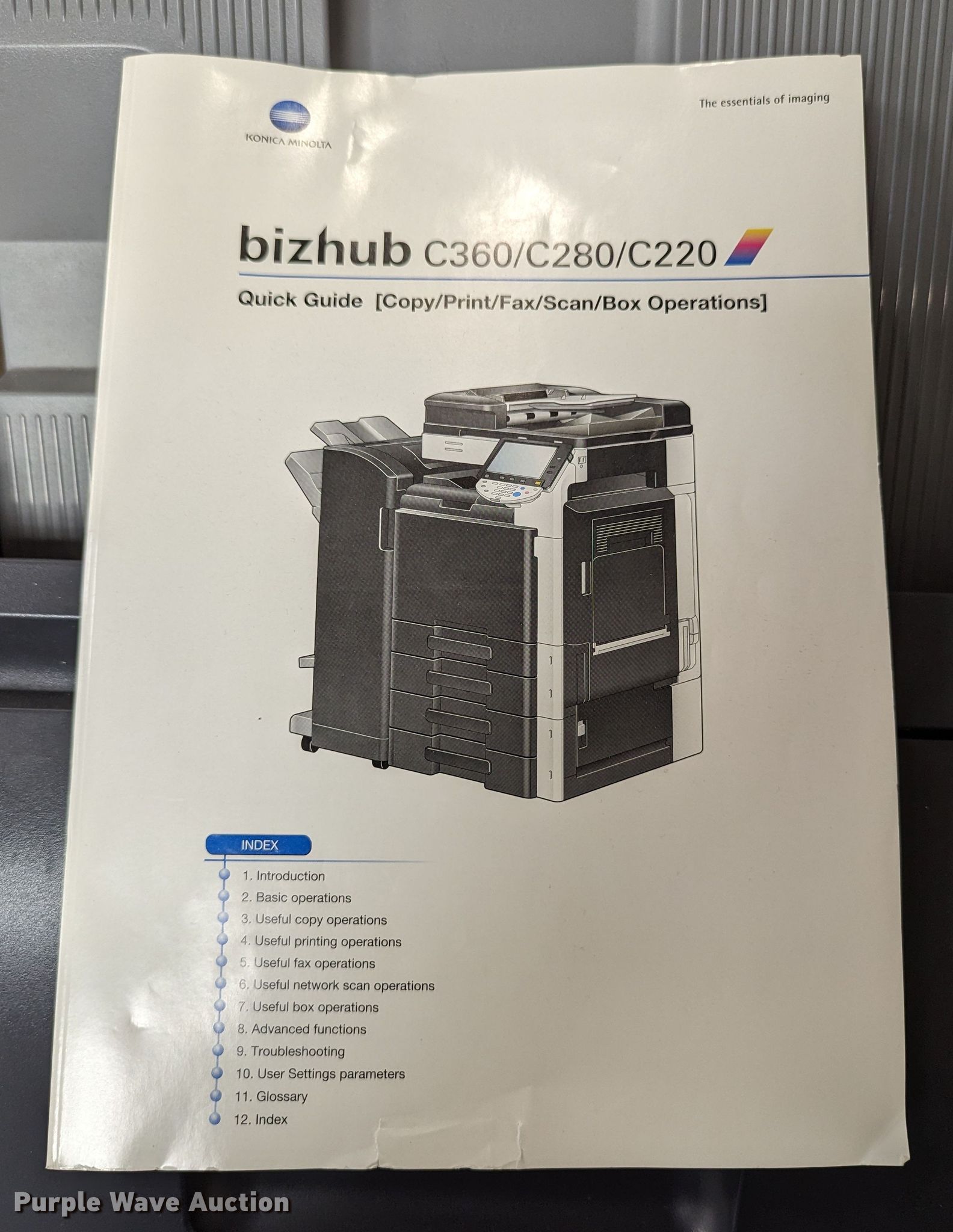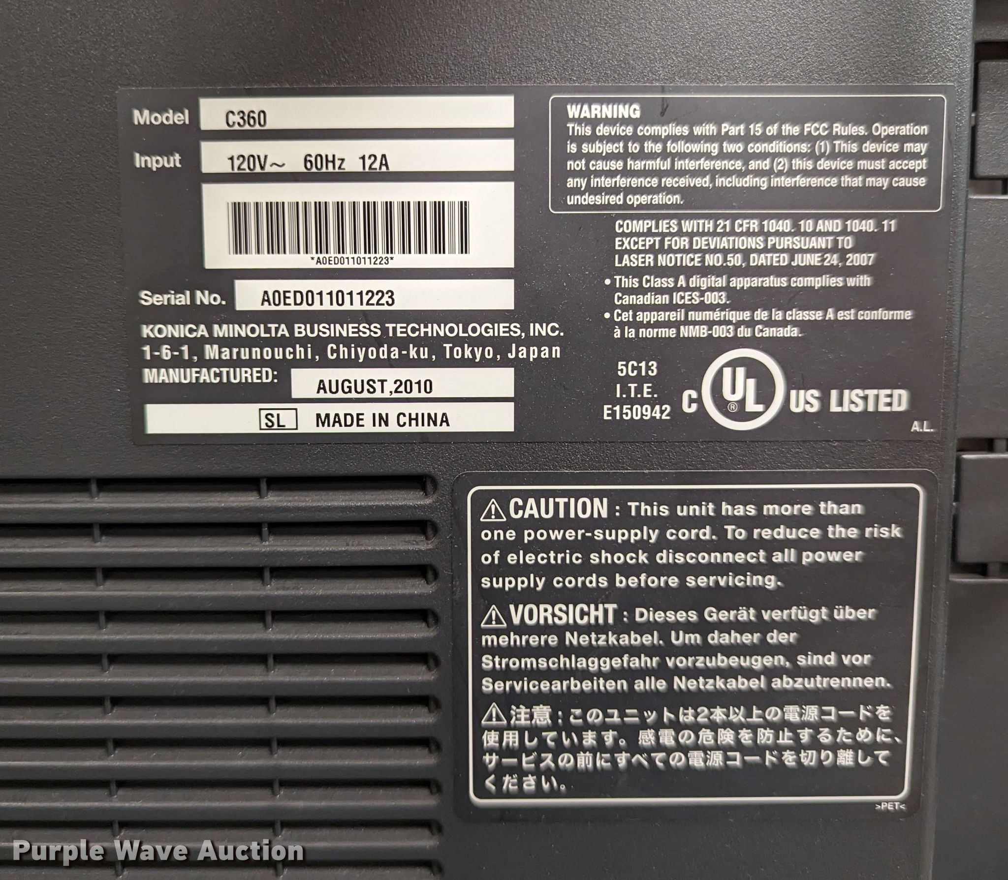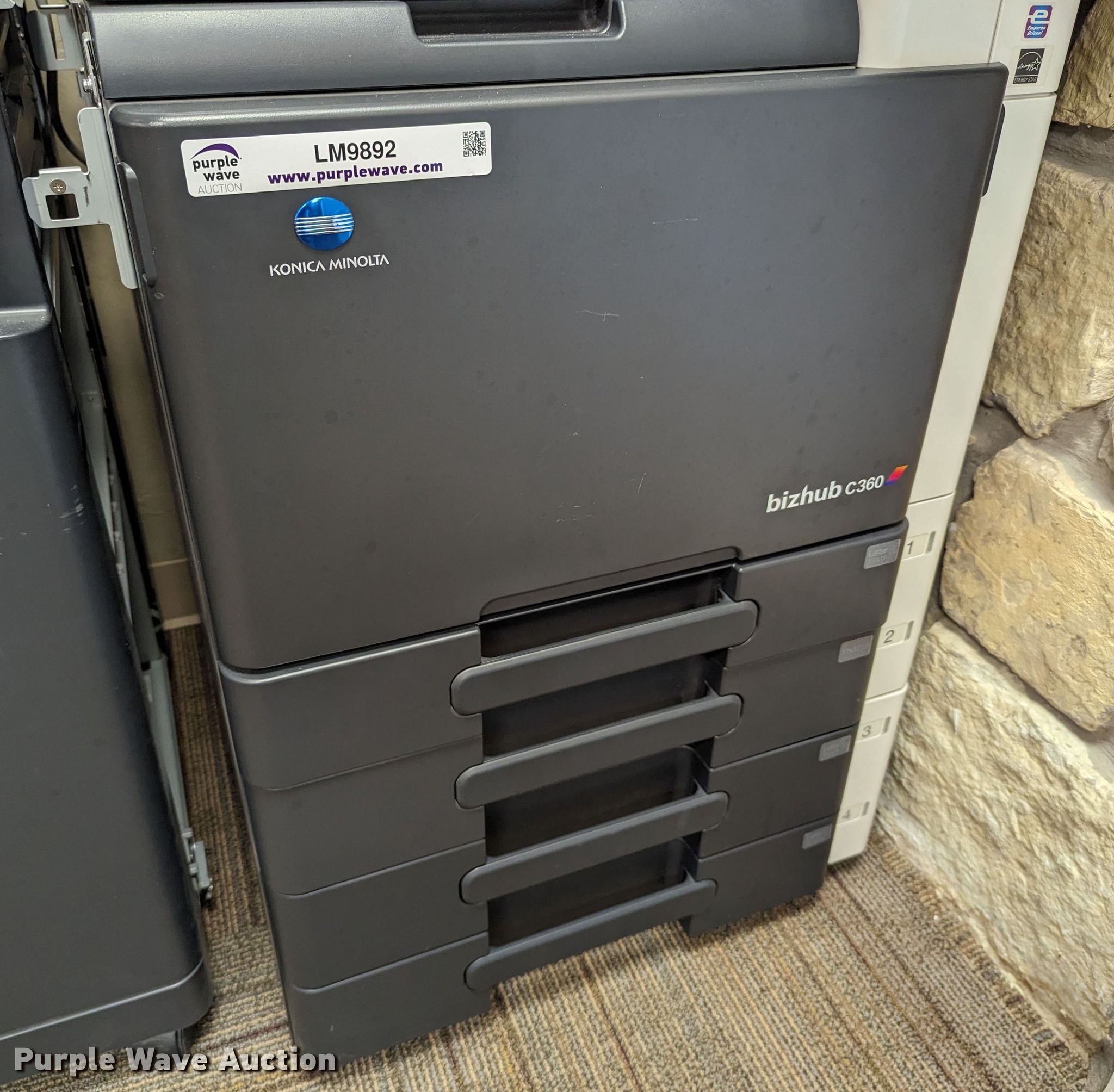 Purple Wave is selling a used Copy or Printing Machine in Oklahoma. This item is a 2010 Konica Minolta BizHub C360 all in one copier with the following: Serial: A0ED011011223