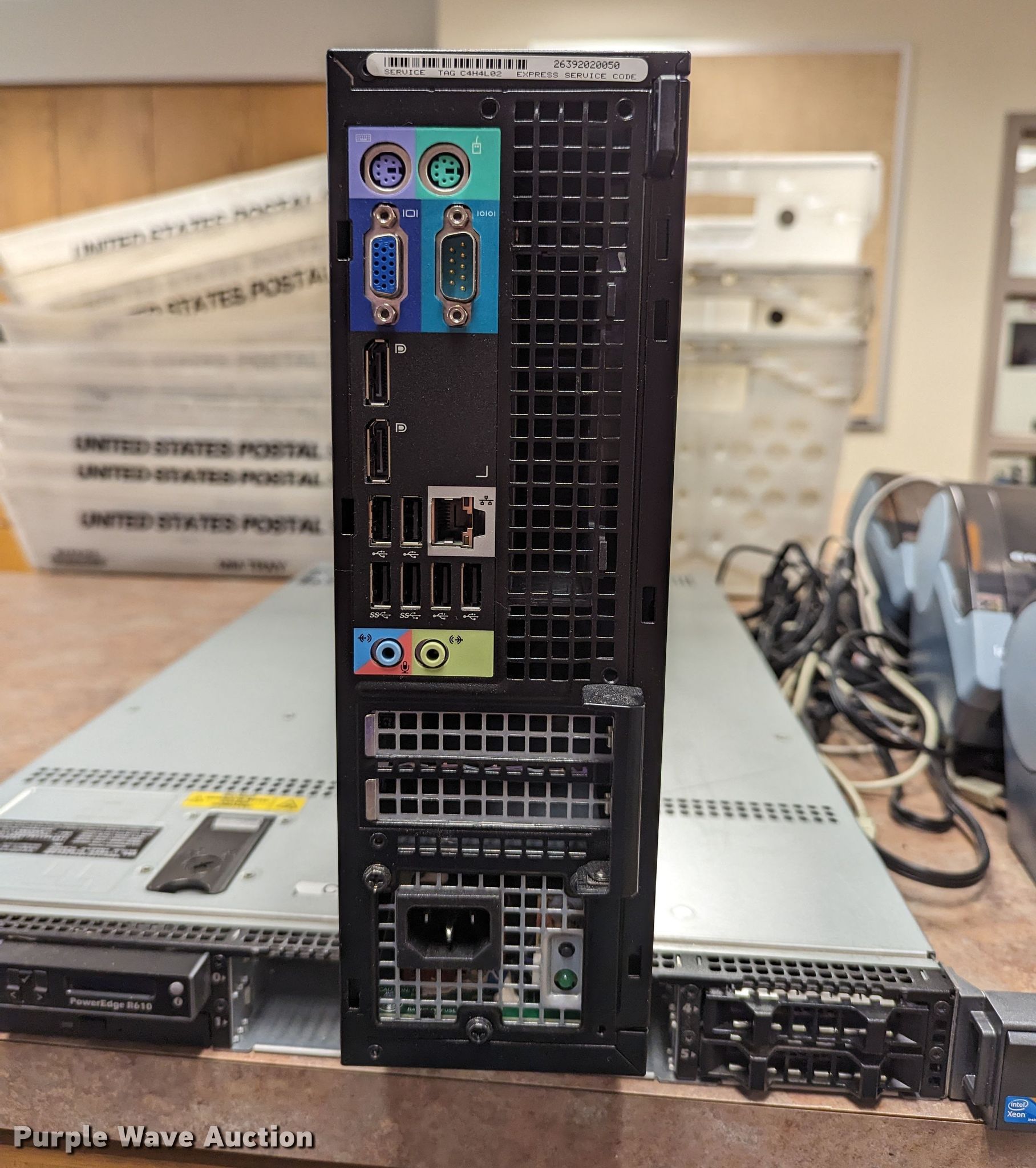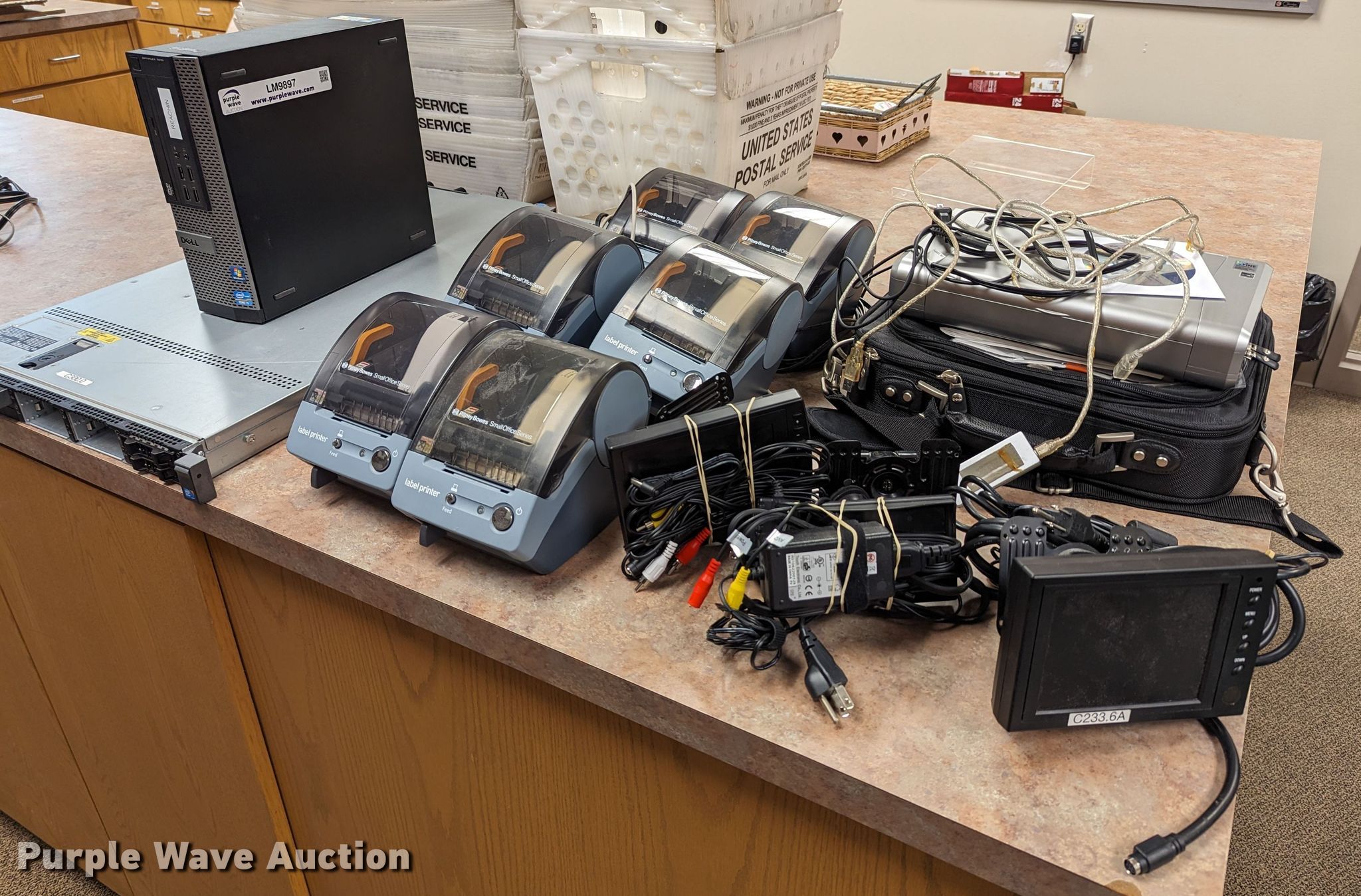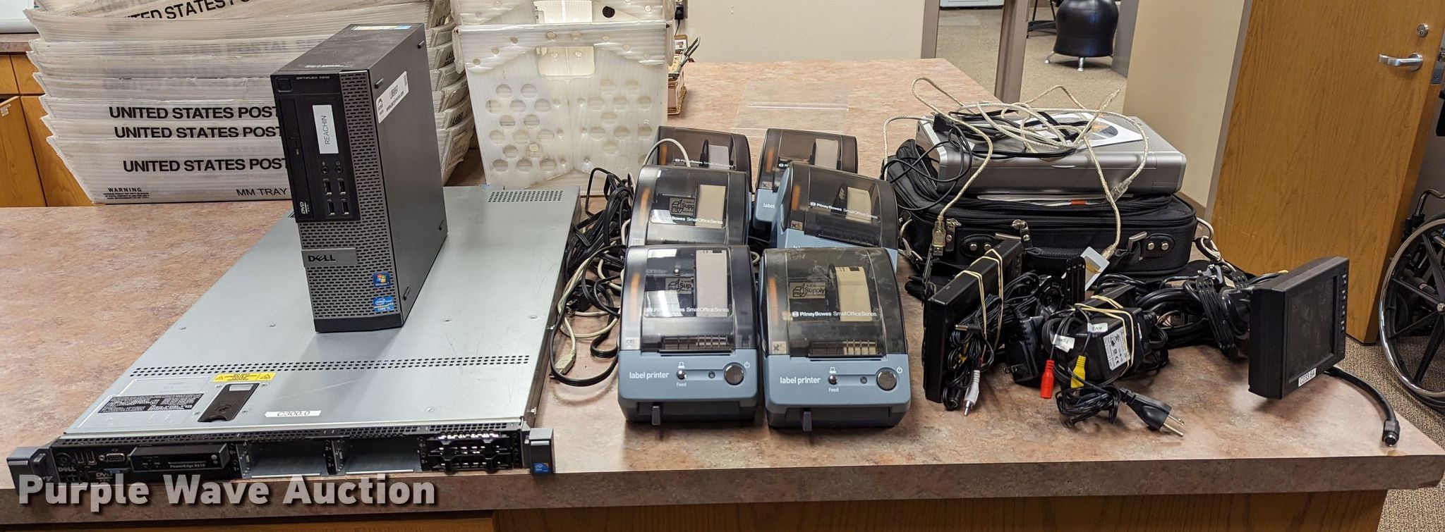 Purple Wave is selling a used Electronics in Oklahoma. This item is a Electronics with the following: Dell Optiplex 7010 CPU, No hard drive, Dell PowerEdge tower server, No hard drive, (3) LCD monitors, Canon iP100 printer, Dell computer bag, (4) Pitney Bowes label printers
