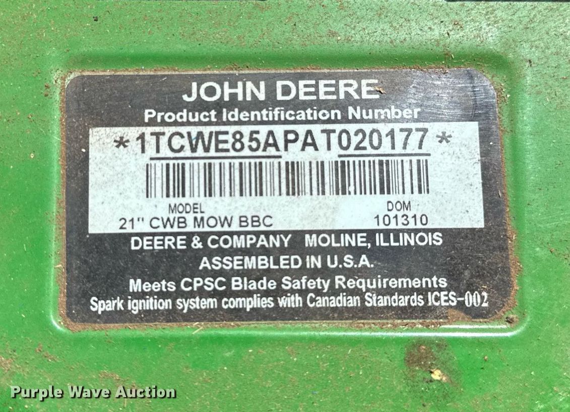 Purple Wave is selling a used Lawn Mower in Oklahoma. This item is a John Deere WE85 lawn mower with the following: Cutting width: 21", Serial: 1TCWE85APAT020177
