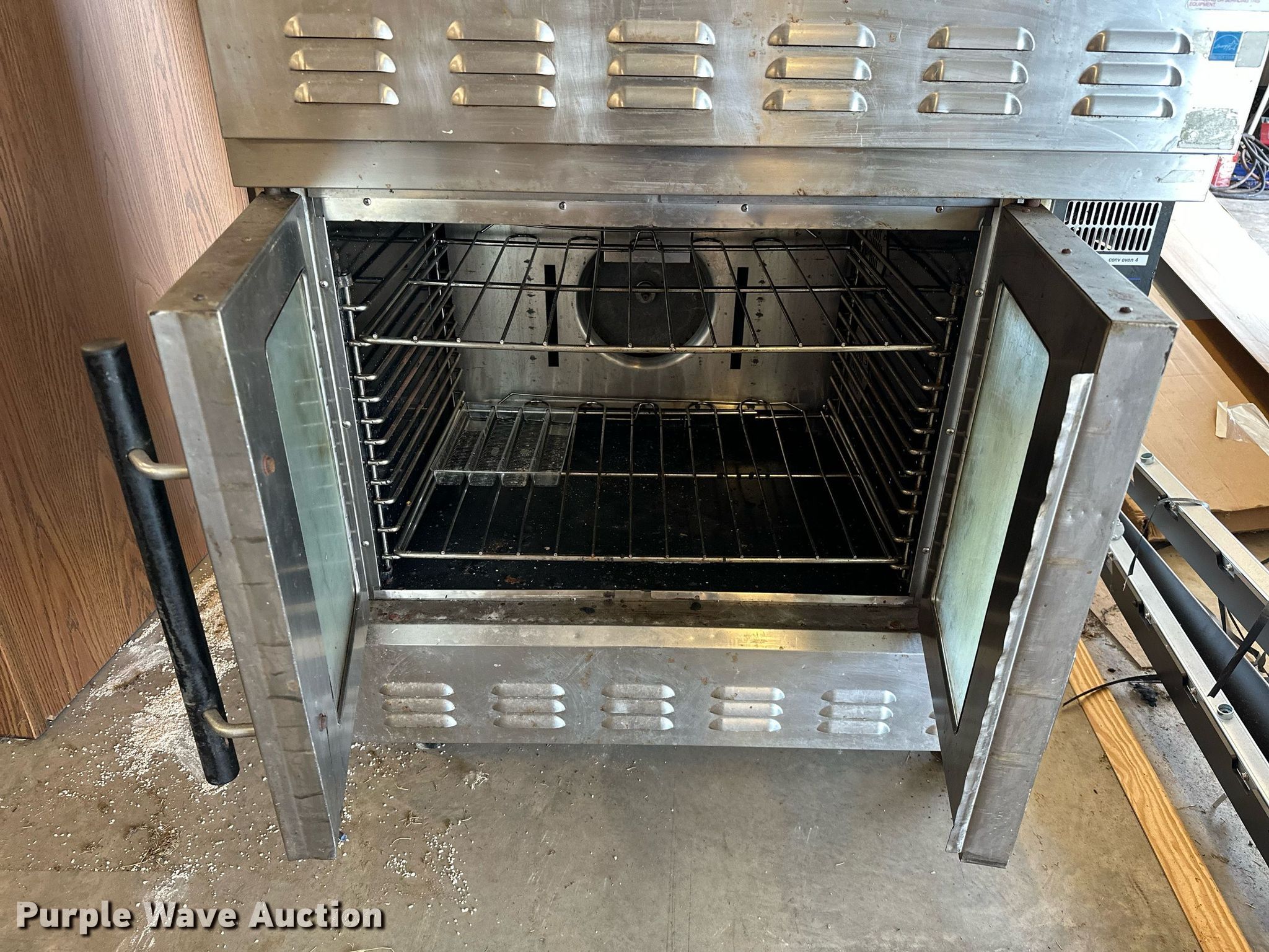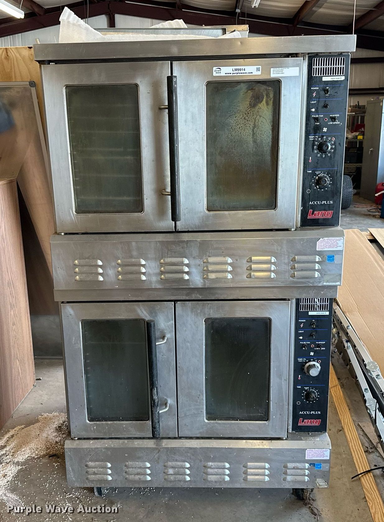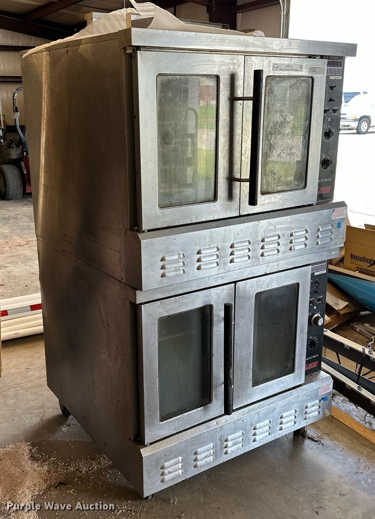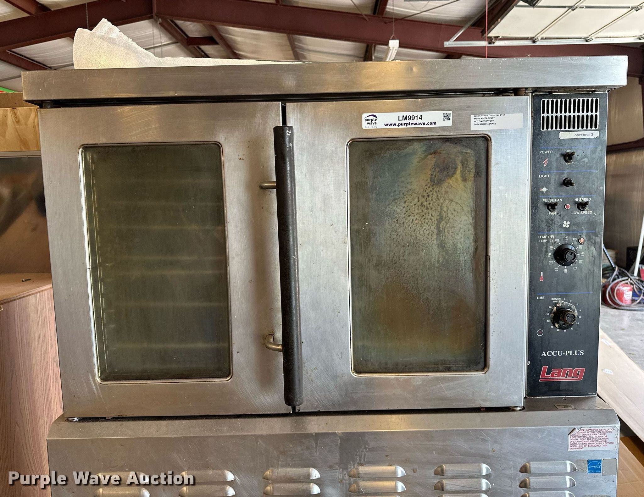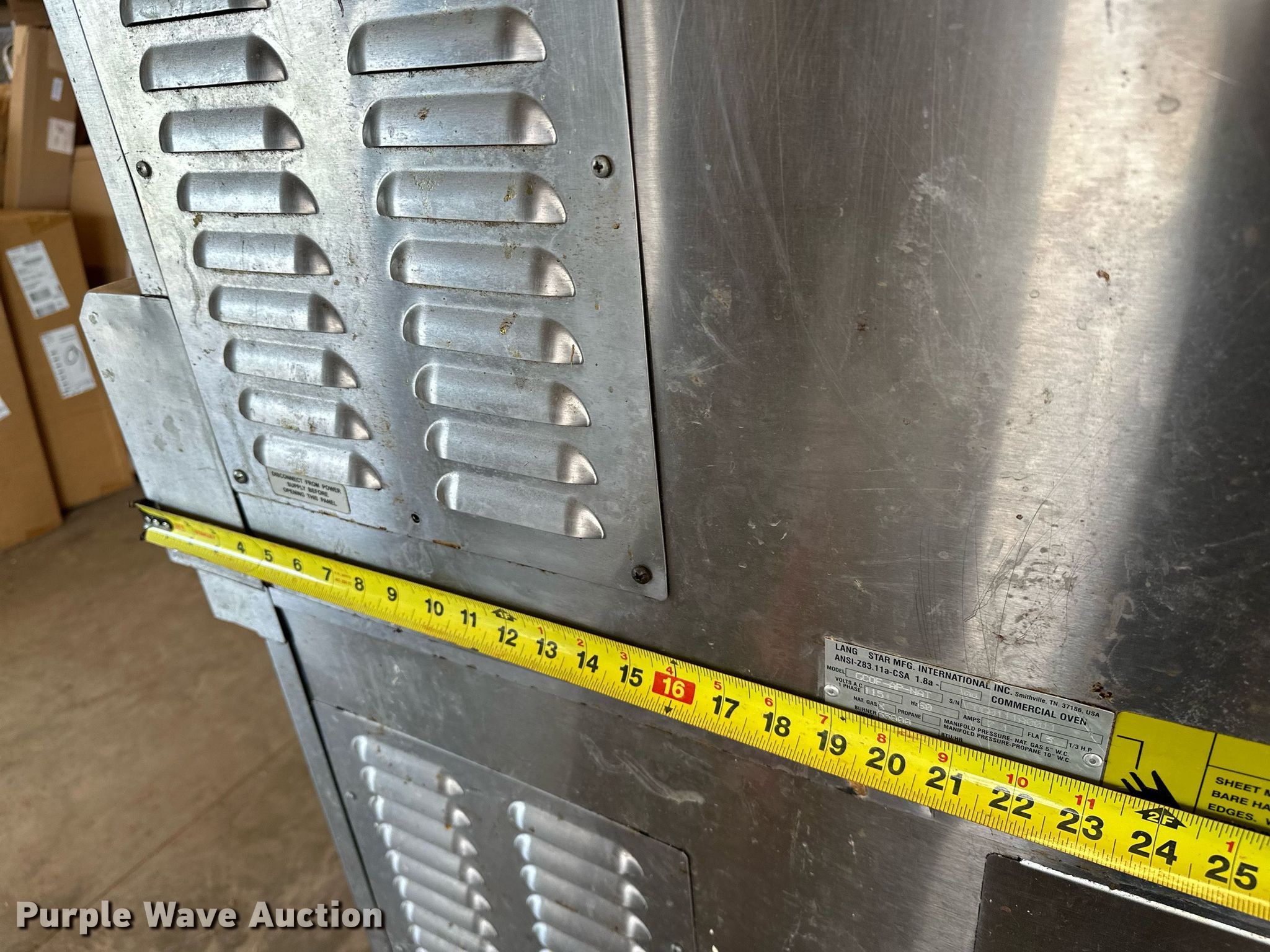 Purple Wave is selling a used Restaurant Equip. in Oklahoma. This item is a Lang GCOF-AP-NAT double oven with the following: Natural gas, Phase Single, Volts: 115, Hz: 60, Amps: 7.1, HP: 1/3, BTU: 55,000, Serial: COG0111A0011