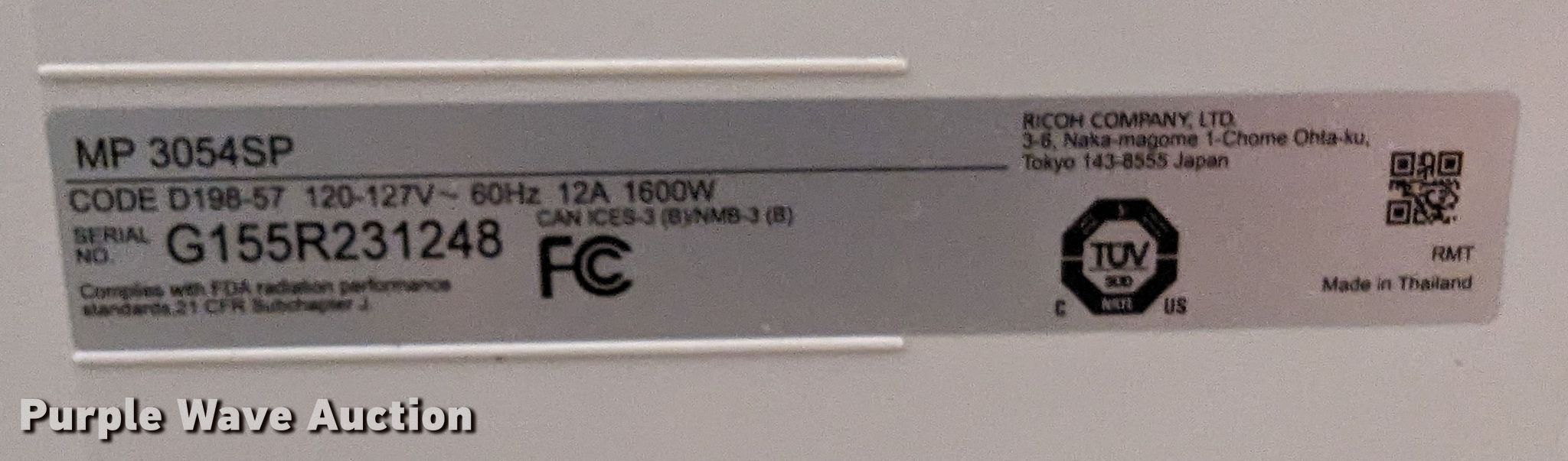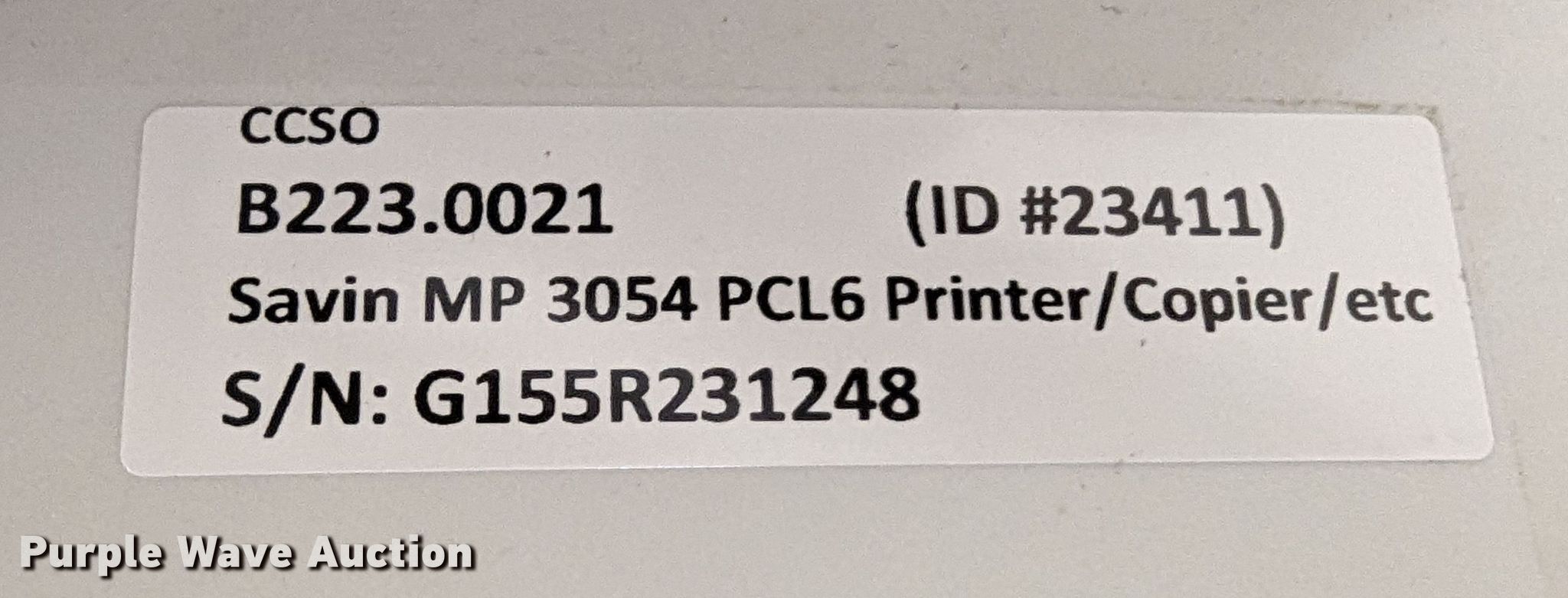 Purple Wave is selling a used Copy or Printing Machine in Oklahoma. This item is a Savin MP 3054 multifunction printer with the following: Serial: G155R231248, Unit #: 23411