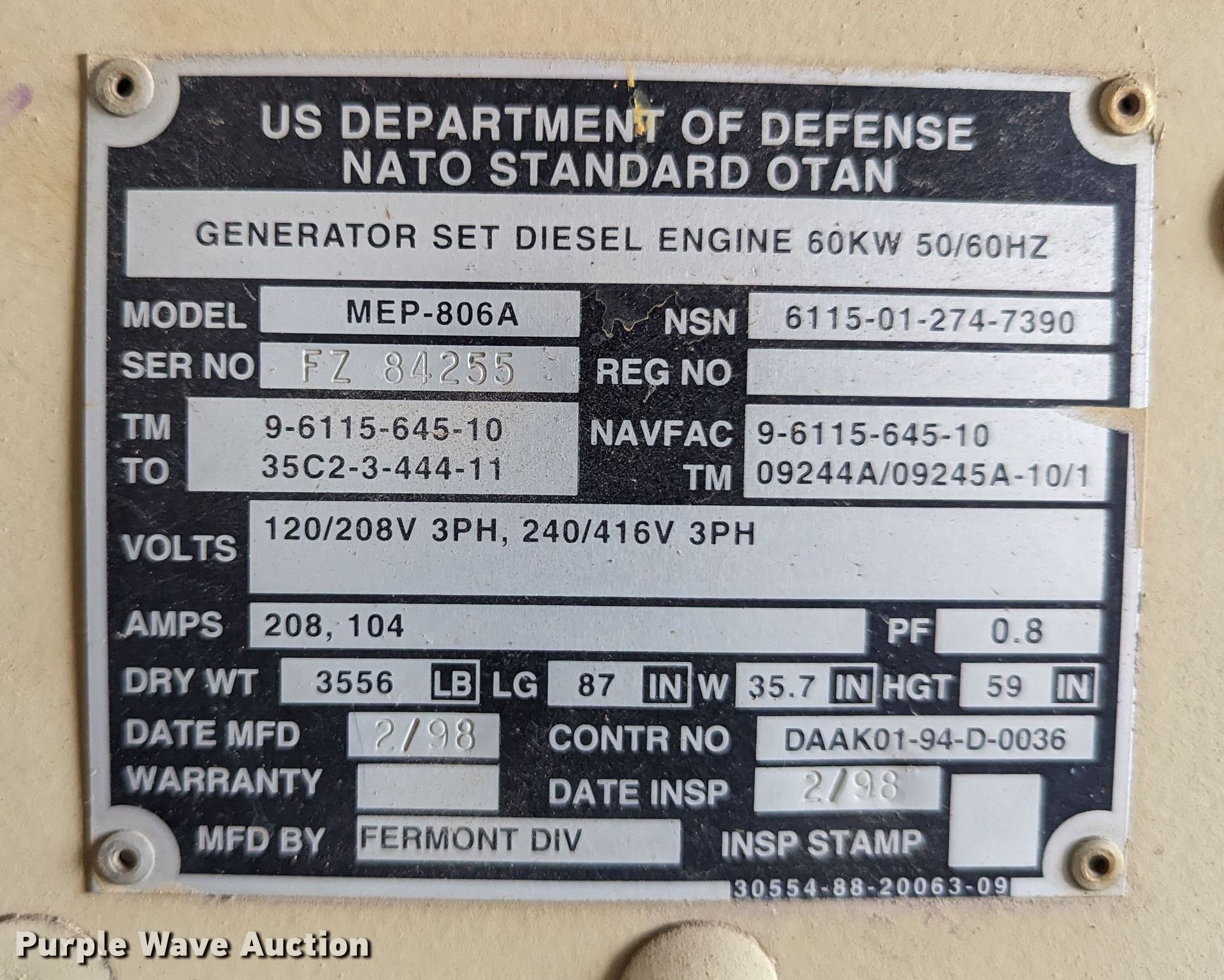 Purple Wave is selling a used Generator Set in Oklahoma. This item is a 1998 Fermont MEP-806A generator with the following: Hours: 481 on meter, Serial: FZ84255
