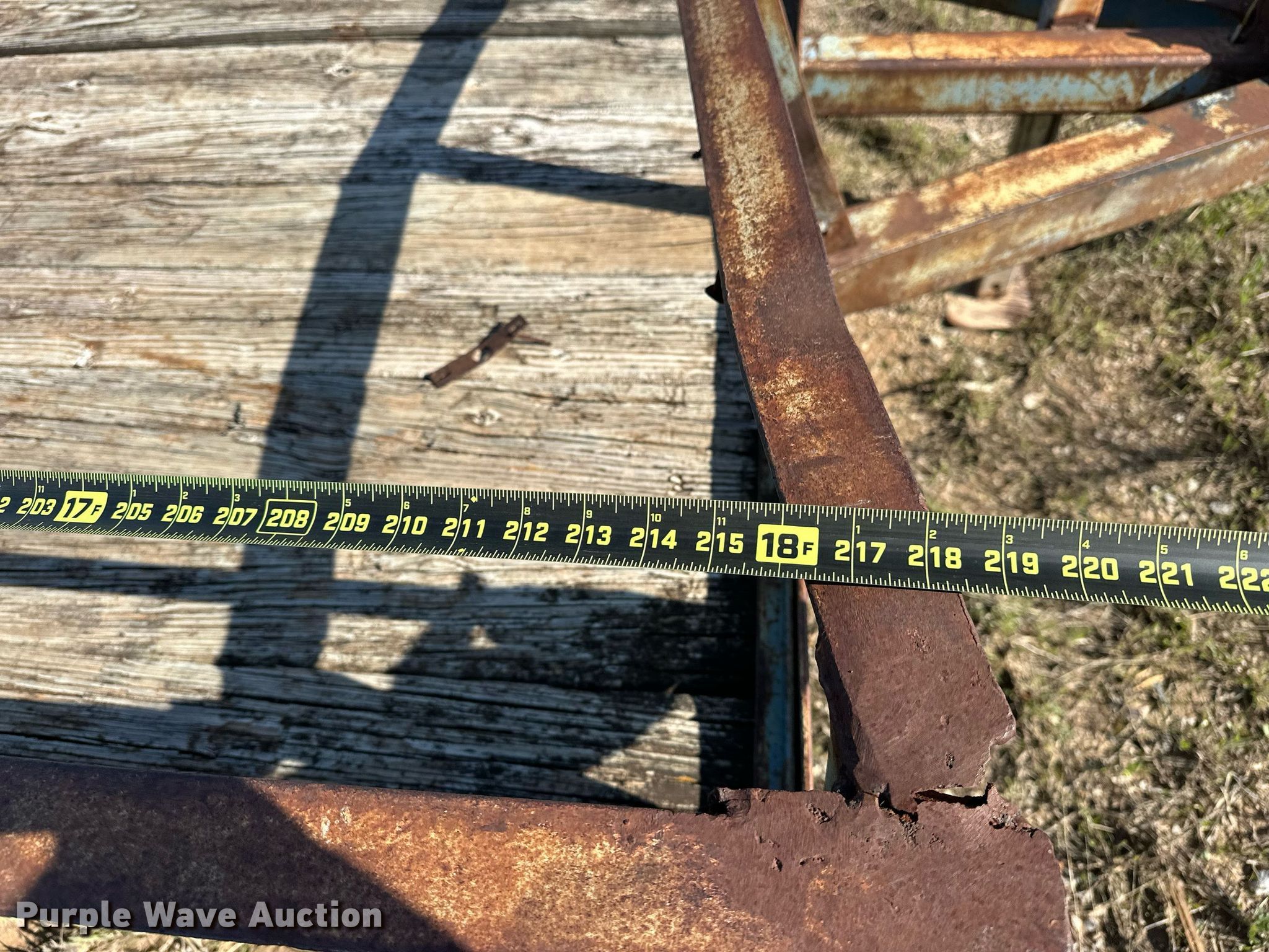 Shop built utility trailer. Dimensions. Overall: 22' L x 102" W, Deck: 18' L x 80" W, Side height: 12". Features Deck type: Wood. Chassis Ball hitch: 2", Landing gear: Single, Suspension: Spring, Brakes: Hydraulic, Axles: Tandem. Tires Aluminum wheels, Steel wheels, Size: 235/75R15. Notes Deck damaged, Unknown operating condition of brakes , Flat tires , Non-operational unit. Transfer of ownership documentation will be a bill of sale. Cleveland County. 9050 S US-77. Noble, OK 73068