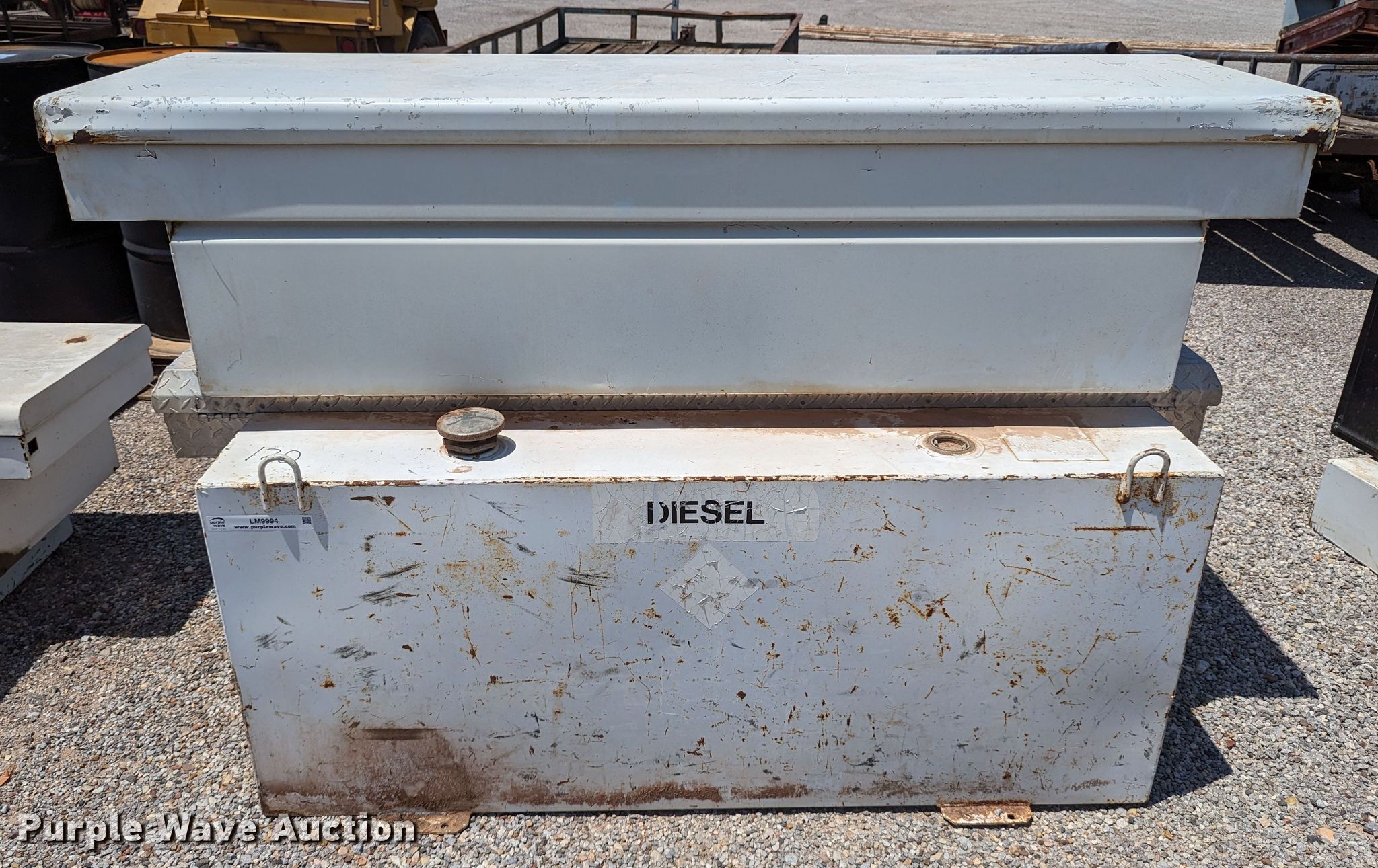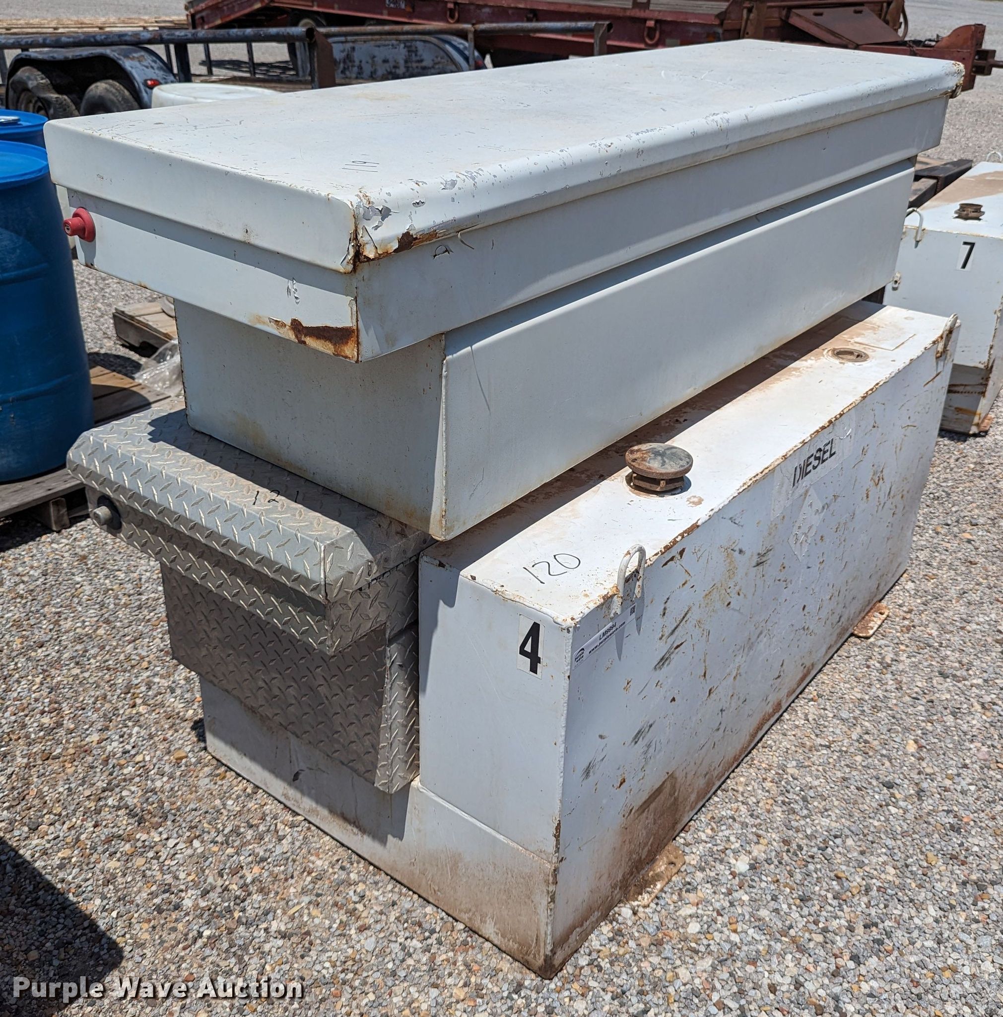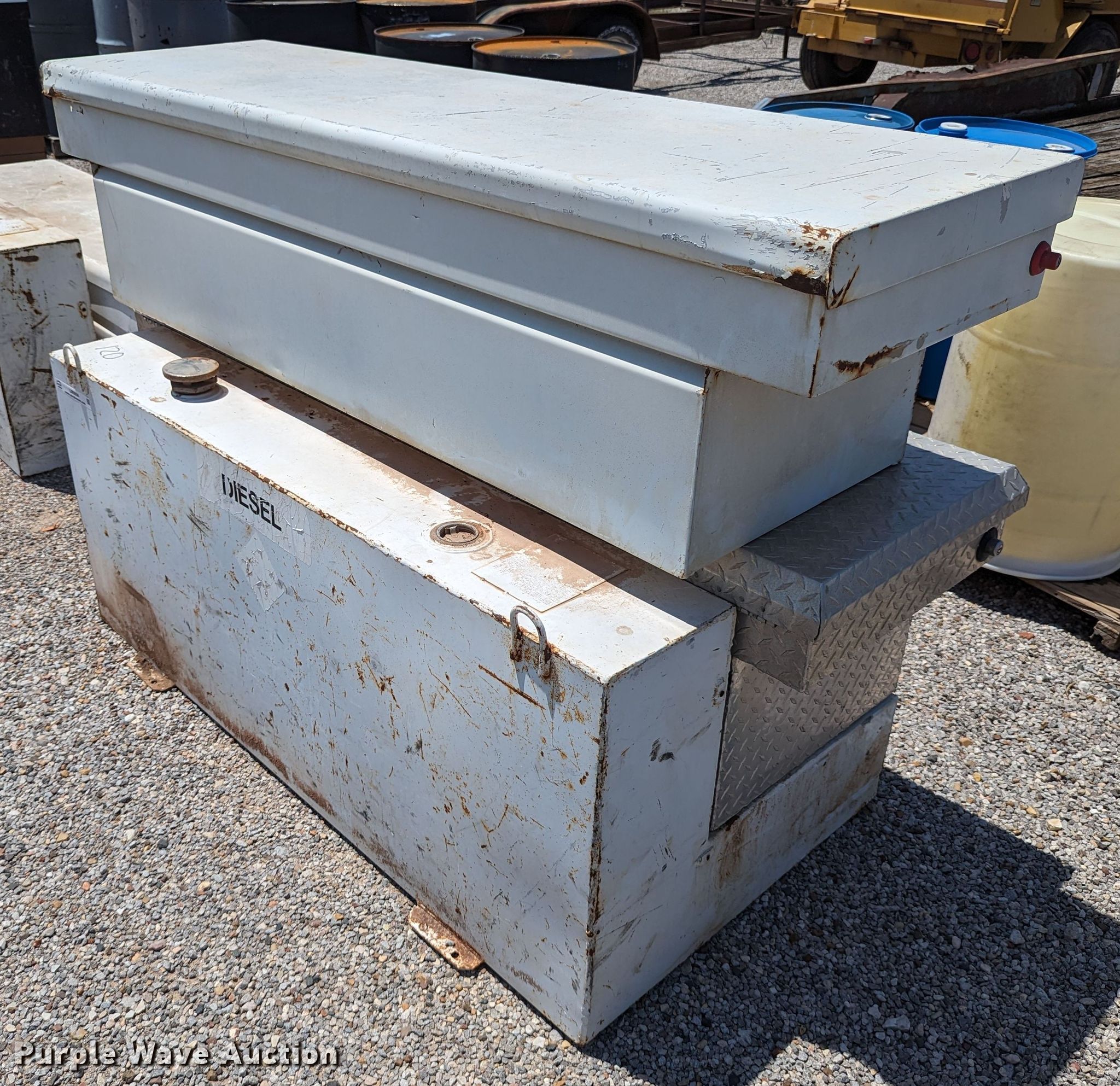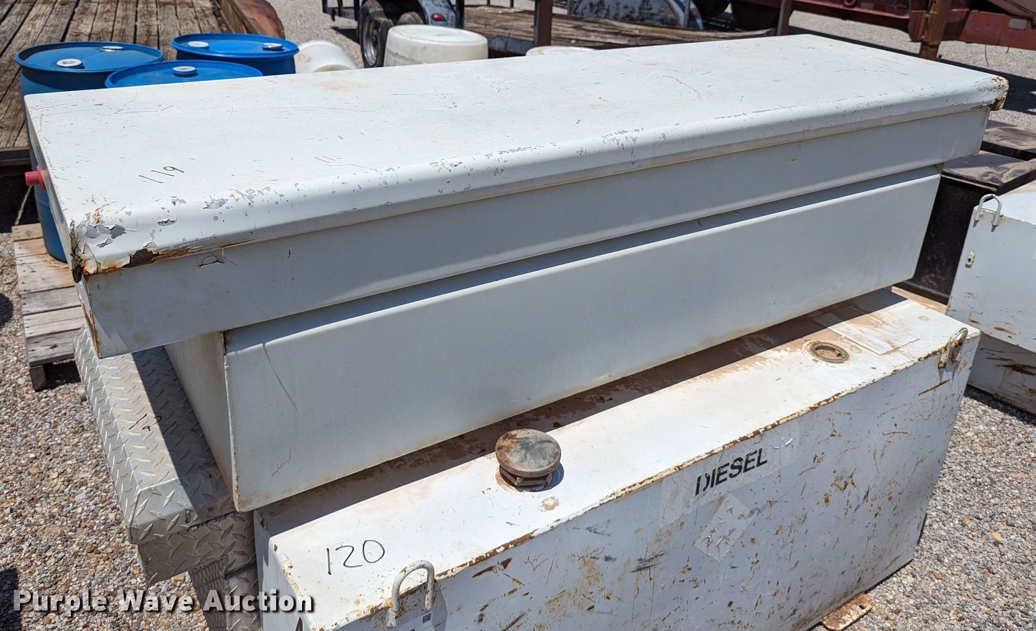 Purple Wave is selling a used Automotive Parts or Acces. in Oklahoma. This item is a Automotive accessories with the following: Delta auxiliary fuel tank, Capacity: 105 gallons, Husky stainless steel toolbox, Knaack tool box, Unit #: 120, 119