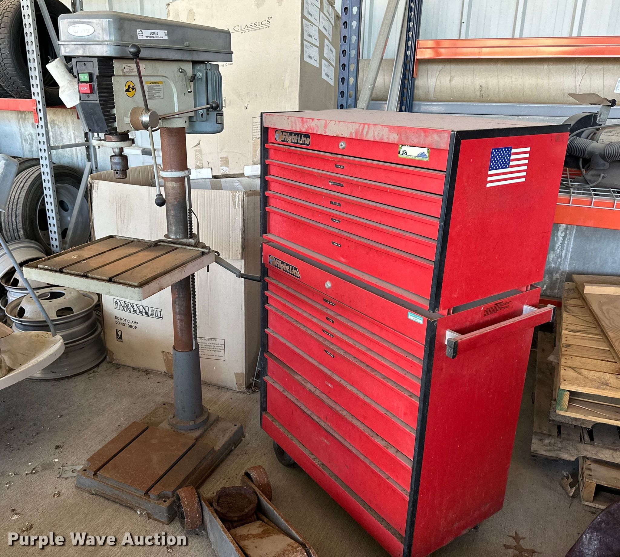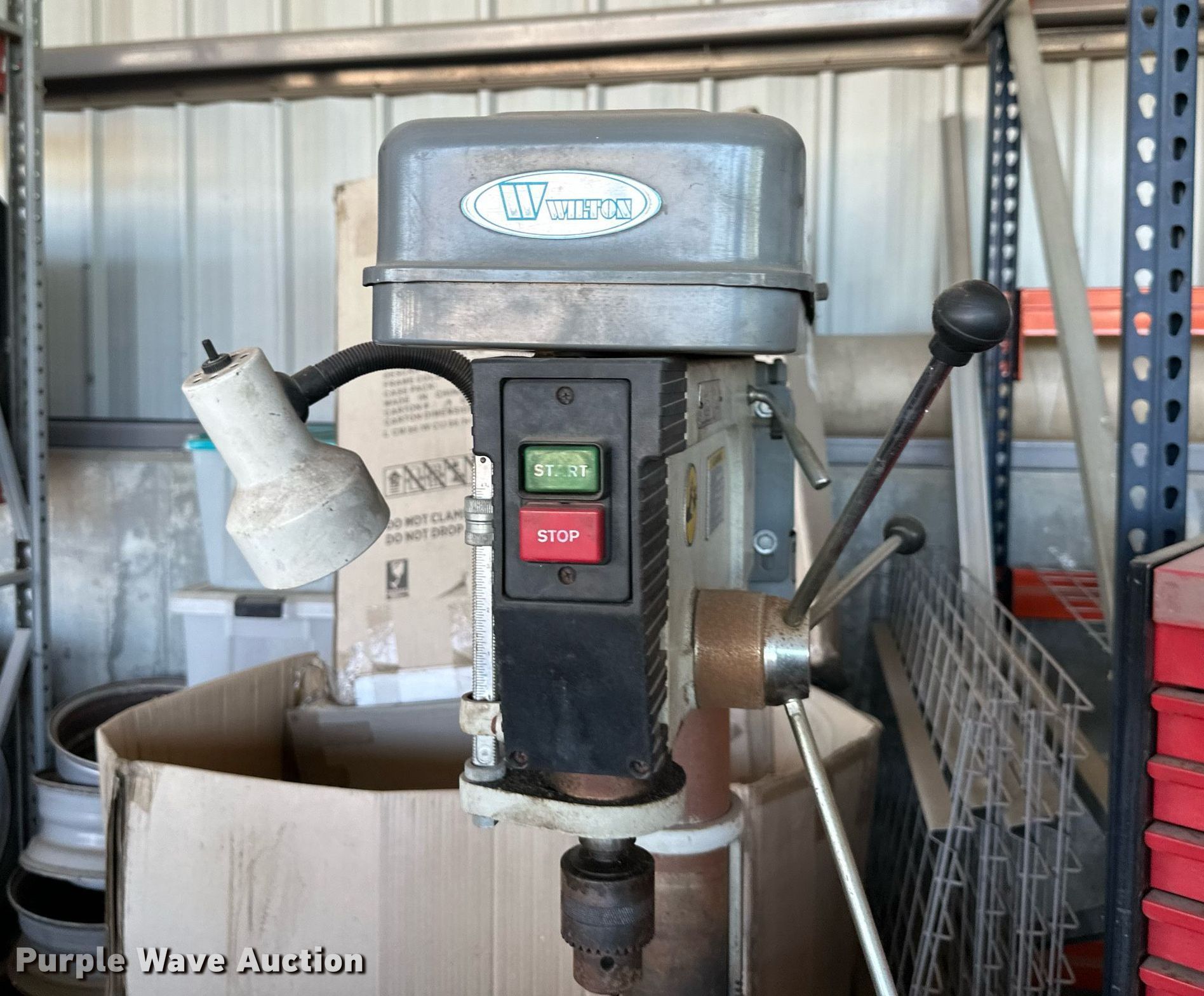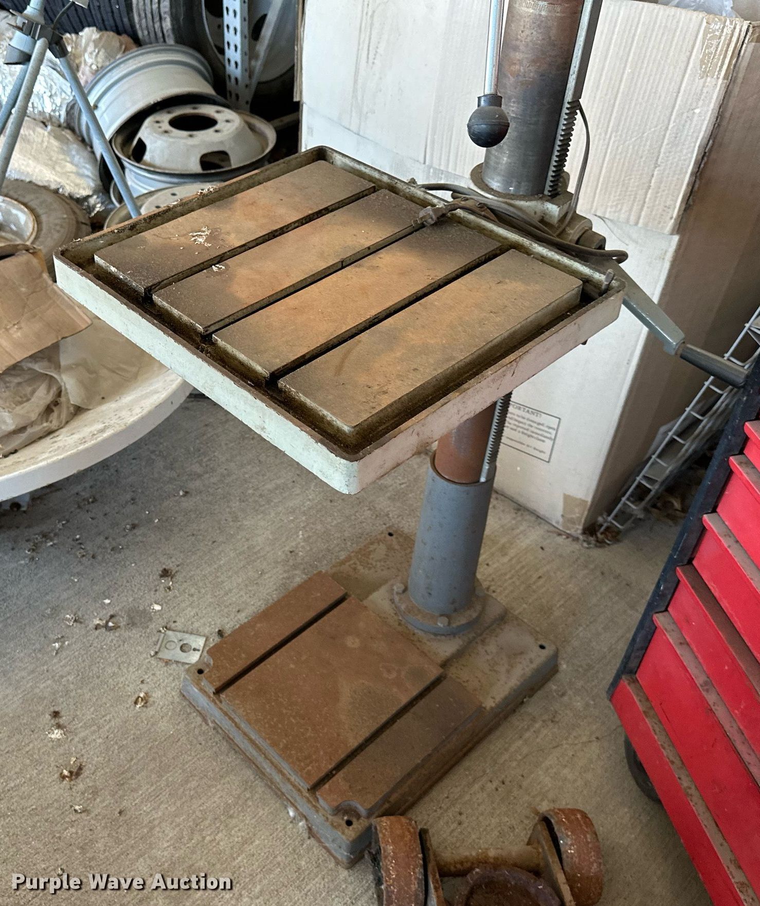 Purple Wave is selling a used Tools in Kansas. This item is a Tools with the following: Wilton drill press, Toolbox, Tools included, 10 ton floor jack, Dayton bench grinder