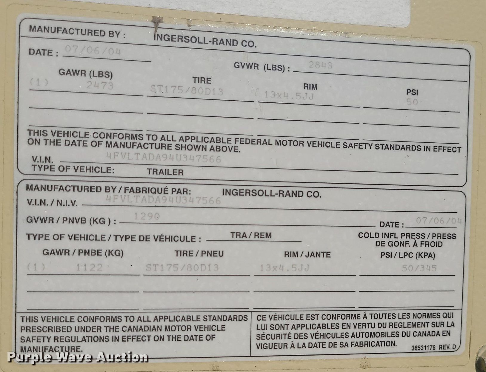 2004 Ingersoll Rand L8 light plant. Hours: 218 on meter, VIN: 4FVLTADA94U347566. Engine Cylinders: 3, Fuel type: Diesel. Trailer 13' L x 78" W, Suspension: Spring, Axles: Single, Tire size: 175/80D13. Notes Non-operational generator. Transfer of ownership documentation will be a bill of sale. City of North Kansas City. 2010 Howell Street. North Kansas City, MO 64116
