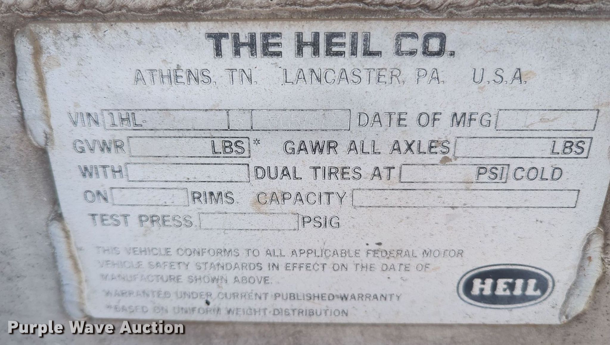 Purple Wave is selling a used Tank Trailer in Oklahoma. This item is a 1994 Heil tank trailer with the following: VIN: 1HLD3A7B5R7G57473