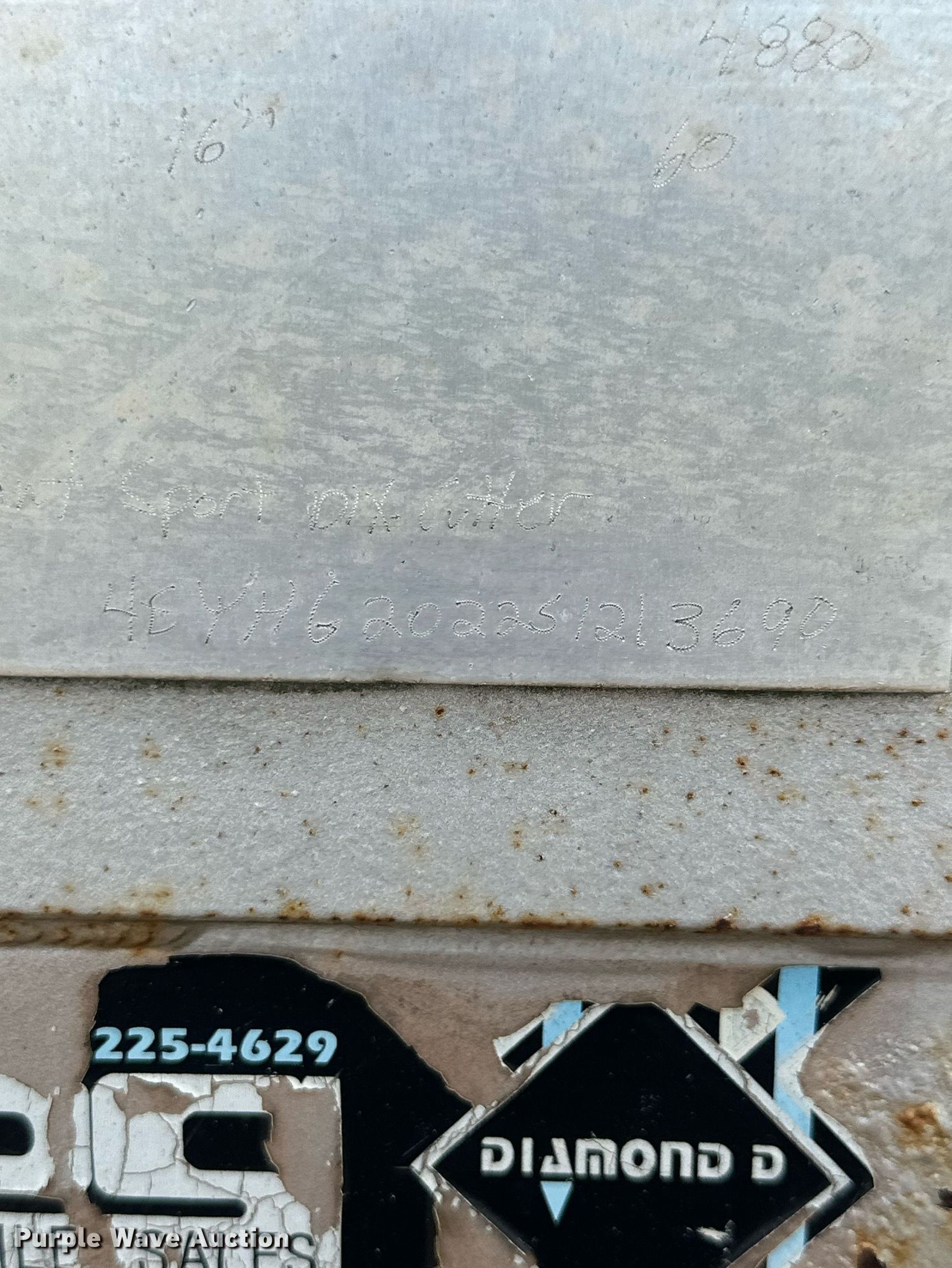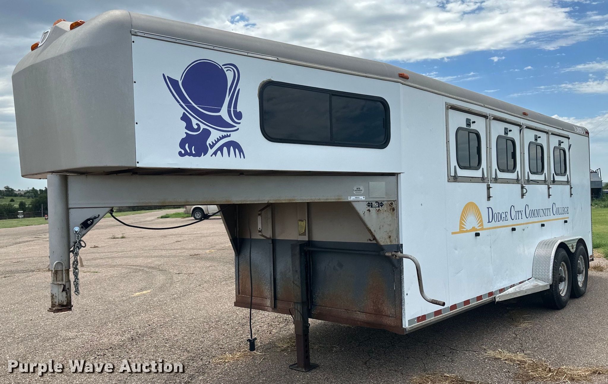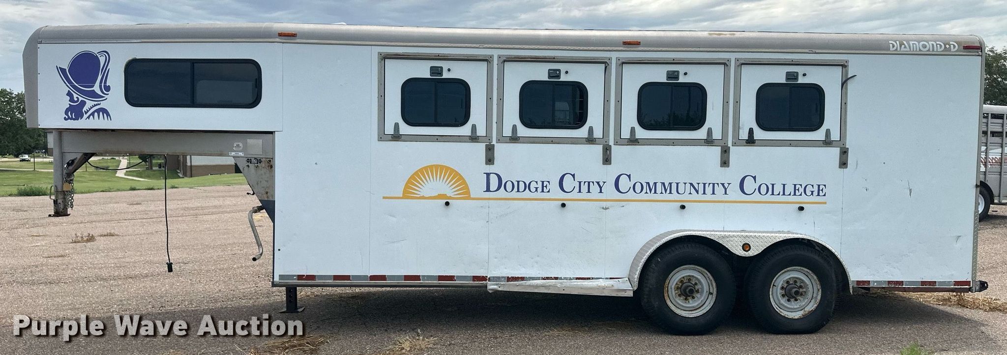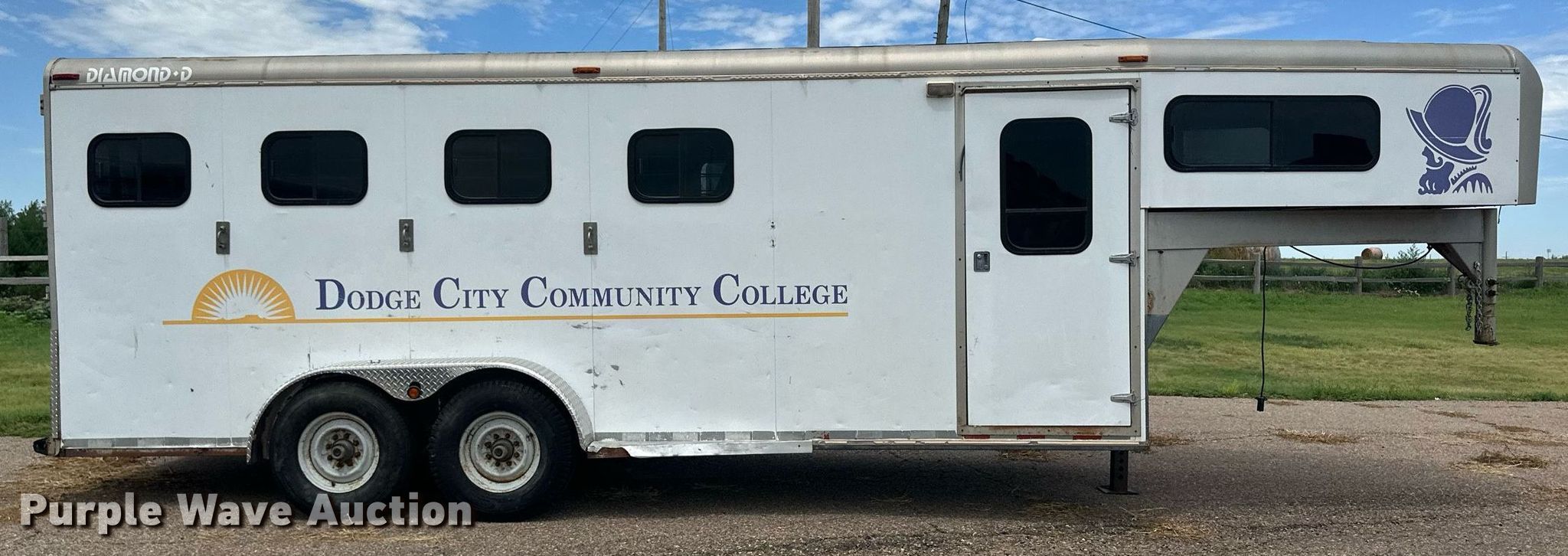 1995 Diamond D livestock trailer. VIN: 4EYHG2022S1213690. Dimensions Overall: 27' 6" L x 102" W, Body: 20' L x 82" W. Features Horse capacity: 4, Center gates: 2, Ground load, Rubber floor mat. Chassis Hitch: Gooseneck, Landing gear: Single, Suspension: Spring, Brakes: Electric, Axles: Tandem. Features Living quarters, Tack room. Tires Steel wheels, Size: 225/90D16 , 7.50-16. Notes Non-operational living quarters door. Dodge City Community College. 2501 N 14th Ave. Dodge City, KS 67801
