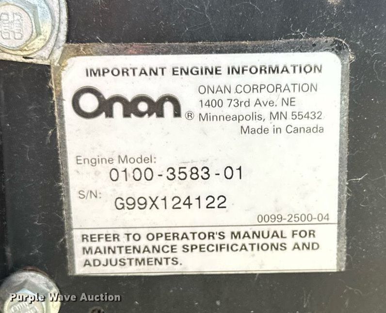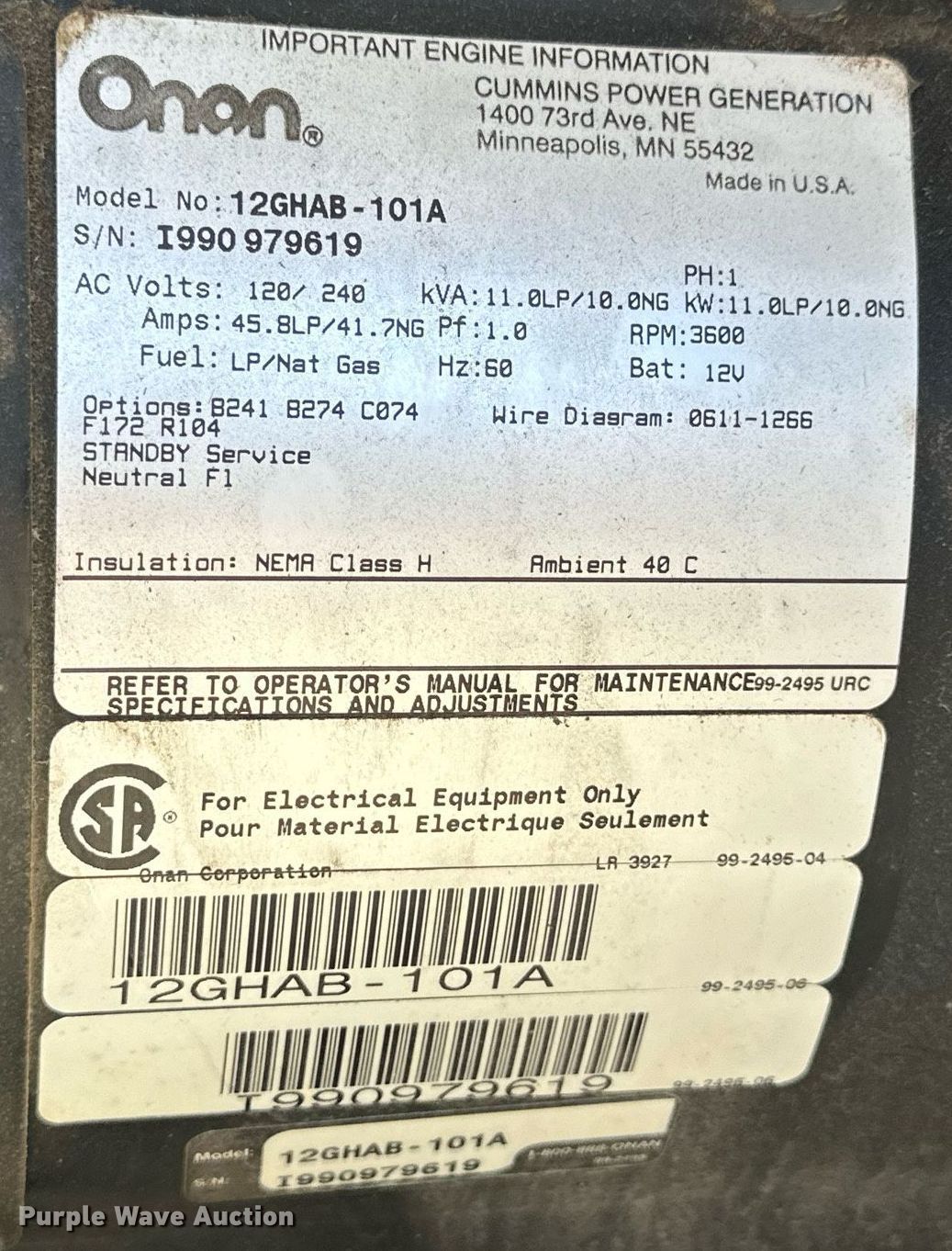 Onan RS12000 generator. Hours: 307 on meter, Serial: I990979619. Engine Onan 0100-3583-01, Serial: G99X124122, Cylinders: 2, Fuel type: LPG, Natural gas. Features Generator Onan 12GHAB-101A, kVA: 11, kW: 11, Phase: Single. Phillips County Road and Bridge. 1566 Hwy 183. Phillipsburg, KS 67661