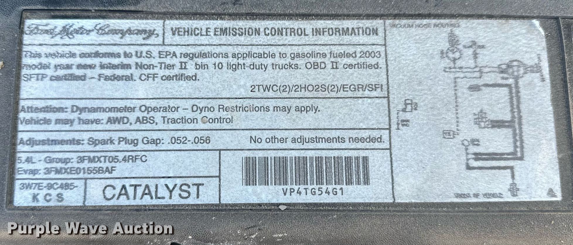2003 Ford F150 SuperCrew pickup truck. Miles: 215,940 on odometer, VIN: 1FTRW08LX3KA46352. Engine Displacement: 5.4L V8 SOHC, Cylinders: 8, Fuel type: Gas, HP: 260. Transmission Automatic, Four wheel drive. Interior AC, Heat, Seat: Heated, Power driver, Power windows, Power locks, Cruise control, Sunroof. Tires Size: 265/70R17. Notes Dead battery. Abandoned vehicle. Condition and title history are unknown.. Transfer of ownership paperwork is a Kansas Department of Revenue form TR-105.. This form is the only documentation that will be provided and is sufficient for a Kansas buyer to apply for a Kansas title. Bidders are responsible for verifying if this is sufficient to obtain a title in their own jurisdiction prior to bidding. Buyer may be required to obtain a Kansas Highway Patrol motor vehicle inspection prior to titling. Logan County Sheriff. 710 W Second St. Oakley, KS 67748