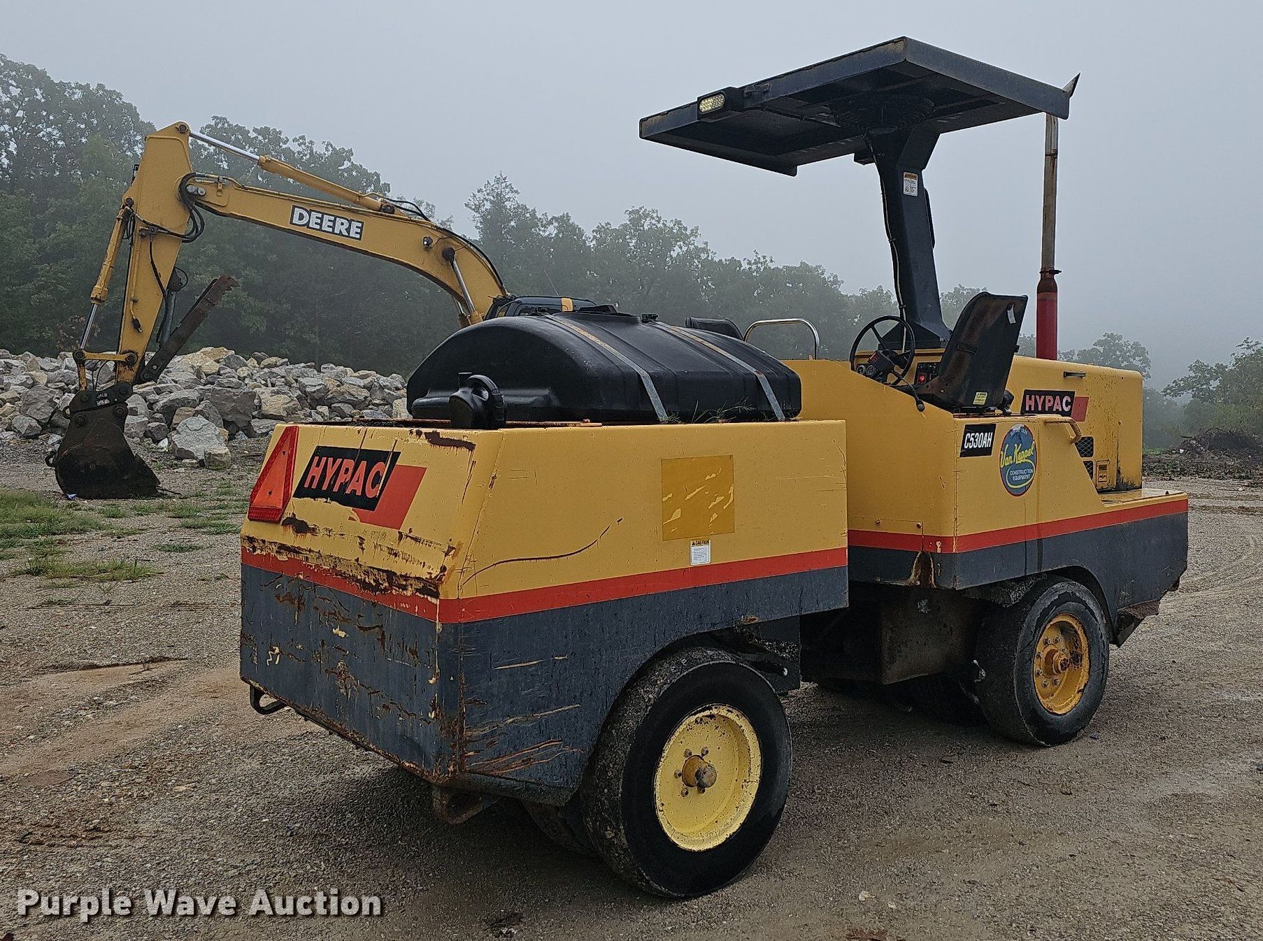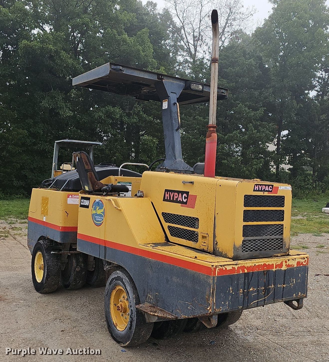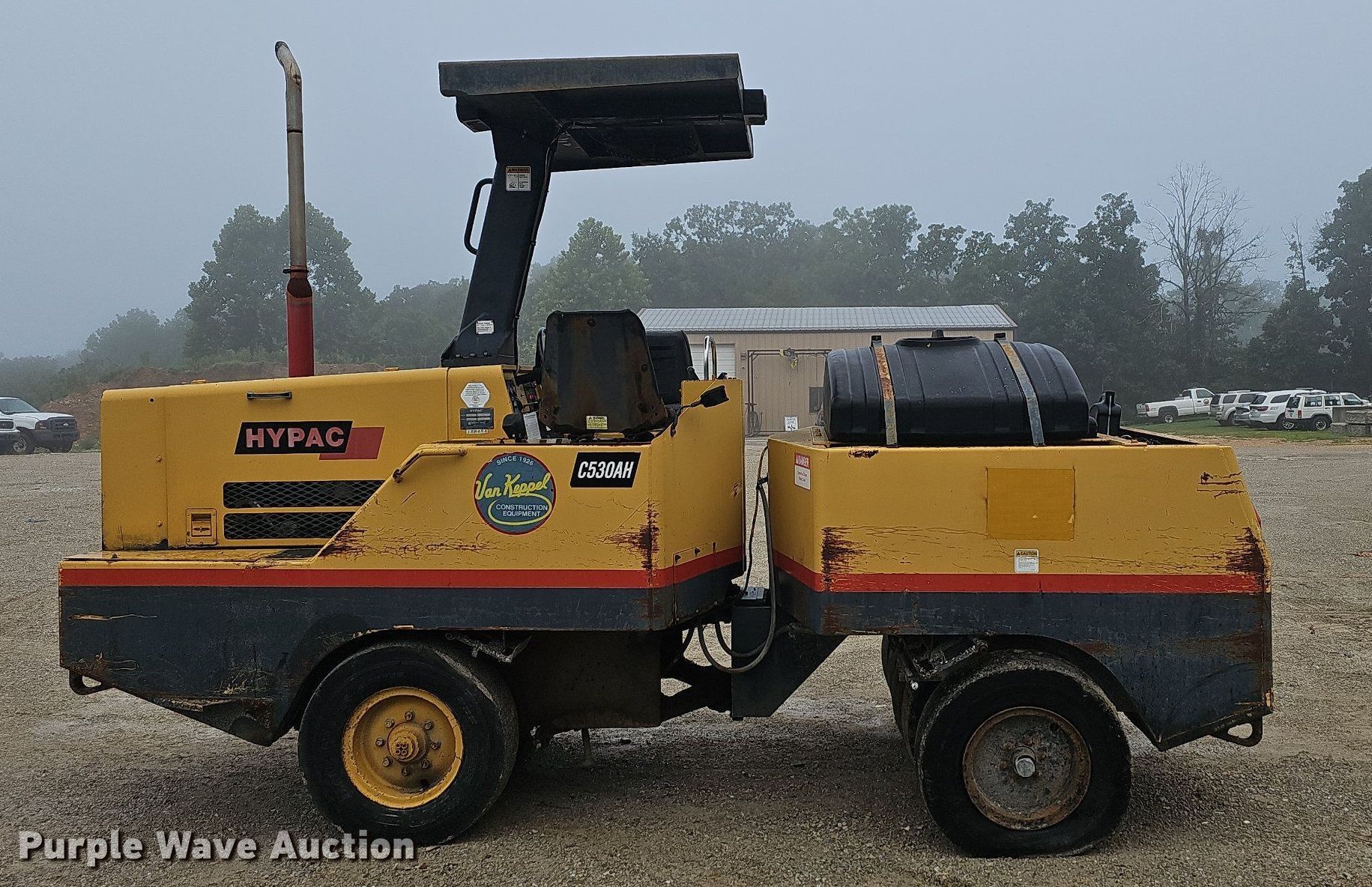 2002 Hypac C530AH pneumatic roller. Hours: 1,365 on meter, Serial: 109A22201941. Engine Cummins, Cylinders: 4, Fuel type: Diesel. Transmission Hydrostatic. Operators station OROPS. Features Drum scrapers: Front, Rear, Water spray applicator: Front, Rear. Tires Size: 7.50-15, Quantity: 9. Notes Flat tire, Dead battery. Taney County, MO. 20058 Us Hwy 160. Kisse Mills, MO 65680