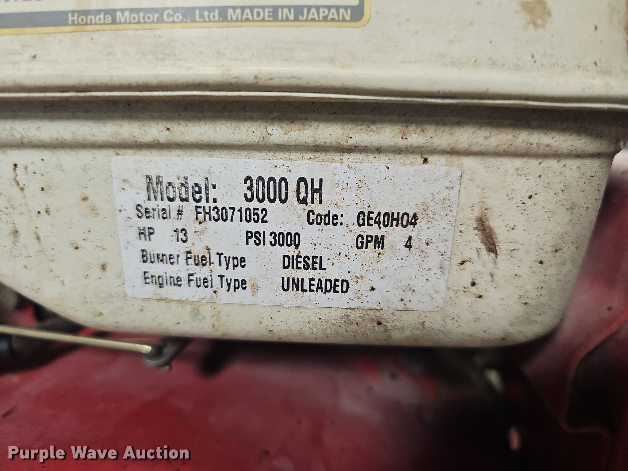 Purple Wave is selling a used Pressure Washer in Missouri. This item is a Cam Spray 3000 QH pressure washer with the following: Honda GX390, Cylinders: 1, HP: 13