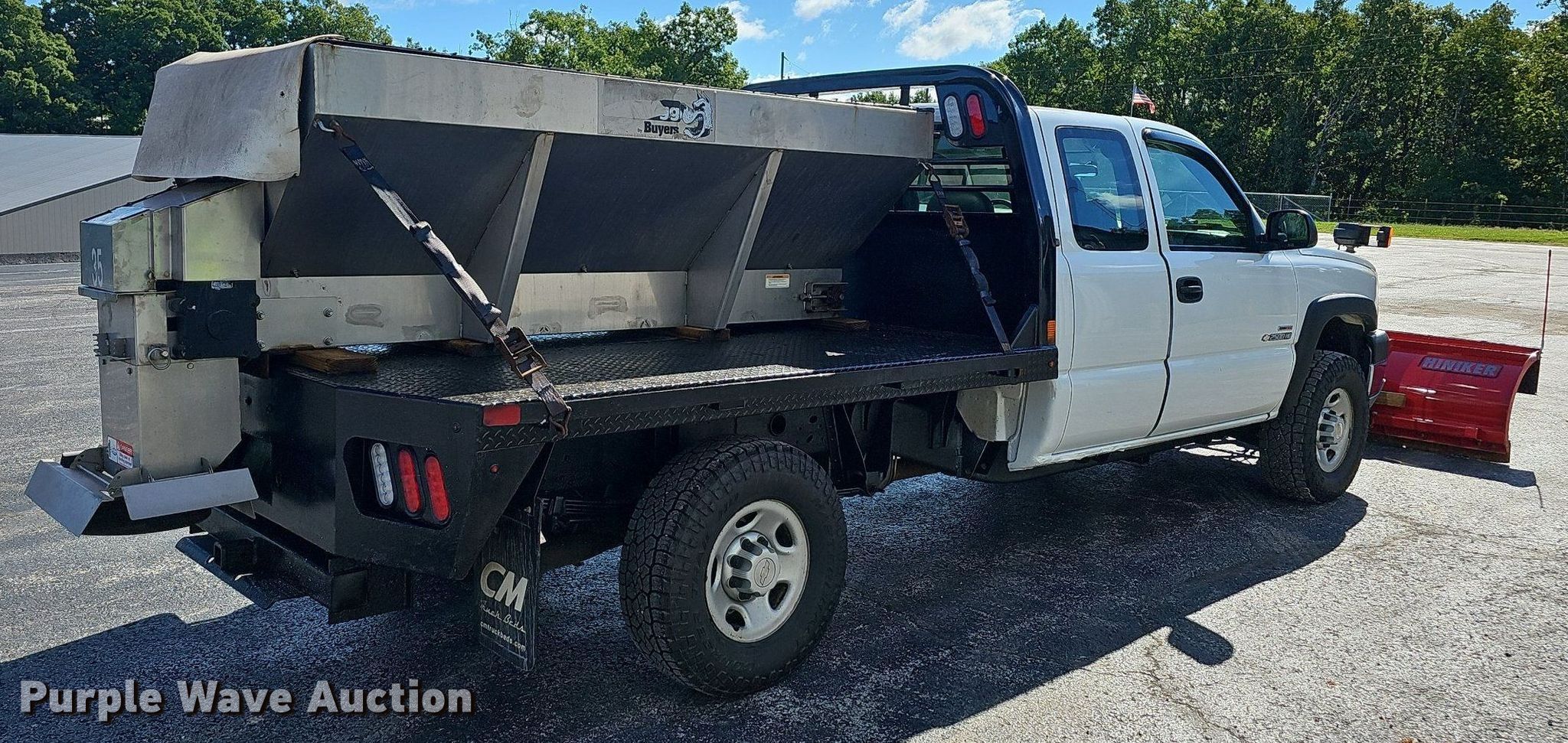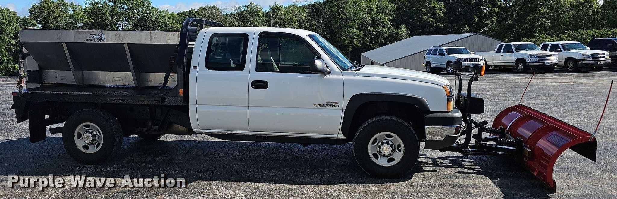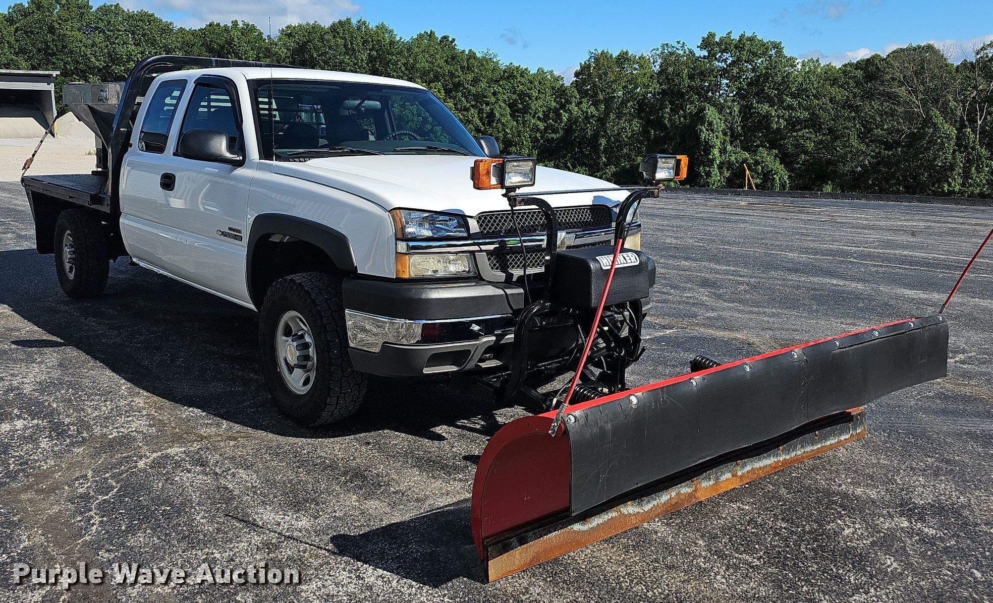 2004 Chevrolet Silverado 2500HD Ext. Cab flatbed pickup truck. Miles: 105,156 on odometer, VIN: 1GCHK29254E310313. Engine Displacement: 6.6L V8 OHV, Cylinders: 8, Fuel type: Diesel. Transmission Automatic, Four wheel drive. Interior AC, Heat, Cruise control. Features Flatbed 8' 5" L x 83" W, Hitch: Gooseneck, Snow plow Hiniker, Width: 8', Spreader SnowDogg, 8'L x 48"W, Spinner diameter: 14". Tires Size: LT265/75R16. Missouri title. Title distribution may be delayed up to 14 days from verification of funds. Stone County, MO. 203 County Shop Road. Lampe, MO 65681