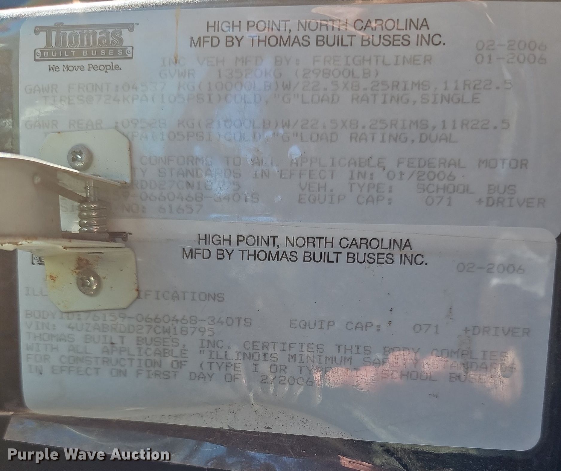 2007 Thomas Built school bus. Miles: 101,601 on odometer, Hours: 6,354 on meter, VIN: 4UZABRDD27CW18795, Unit #: 21-07. Engine Caterpillar C7, Displacement: 7.2L, Cylinders: 6, Fuel type: Diesel. Transmission Automatic. Chassis Axles: Single, Suspension: Spring, Brakes: Hydraulic, GVWR: 29,800 lbs, Wheelbase: 280". Interior Heat, Heated mirrors, Cruise control, Electric passenger sliding door, Passengers: 71. Tires Size: 11R22.5. Notes Dash warning indicator: TPMS, Windshield chipped or cracked, Dead battery, Muffler missing. Kansas title. Miltonvale, KS 67466