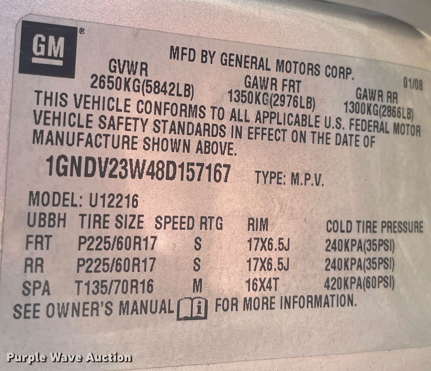 Purple Wave is selling a used Passenger Vehicle in Kansas. This item is a 2008 Chevrolet Uplander LS van with the following: Miles: 158,097 on odometer, VIN: 1GNDV23W48D157167